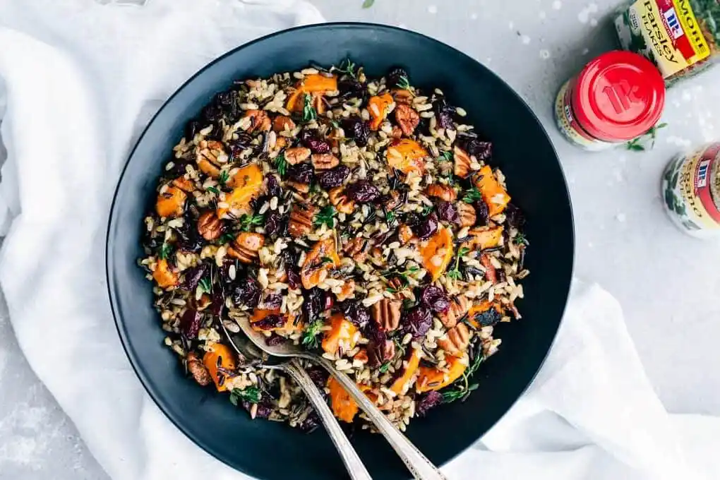 Stir in the grated carrot, thyme, oregano, sage, rosemary, bay leaves and red pepper flakes. Add the wild rice mix and stir well to combine. Allow it to toast together with the aromatics for a couple of minute.