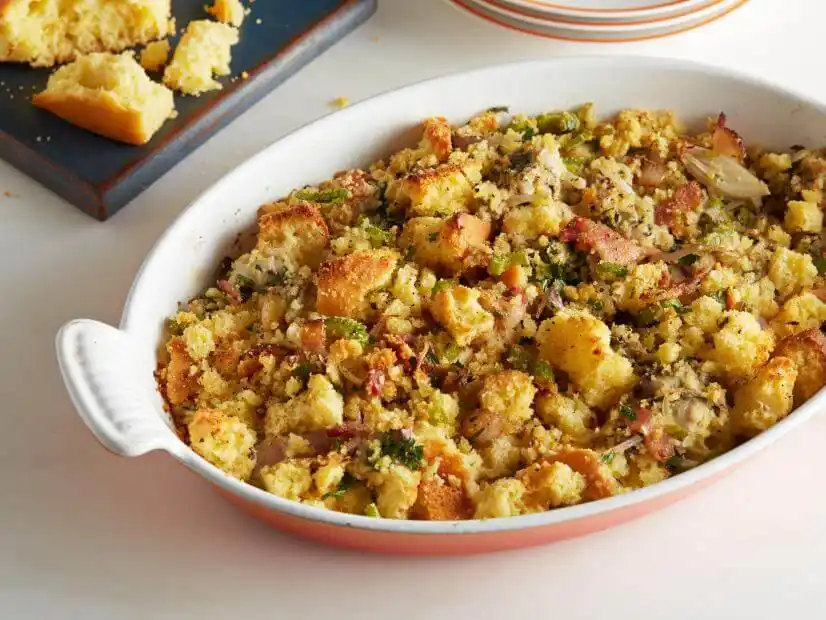 Cook 1 bay leaf and 1/2 cup each chopped celery and onion in 1/4 cup butter till tender. Discard bay leaf. Add 6 cups dry bread cubes and 1 tablespoon snipped parsley to butter mixture; mix thoroughly. Add 2 beaten eggs, 1 pint raw oysters, chopped, 1 teaspoon poultry seasoning, 1 teaspoon salt, and a dash of pepper. Add milk to oyster liquor to make 1/4 to 1/3 cup; add enough liquid to stuffing to moisten. Makes enough stuffing for a 10-pound turkey.