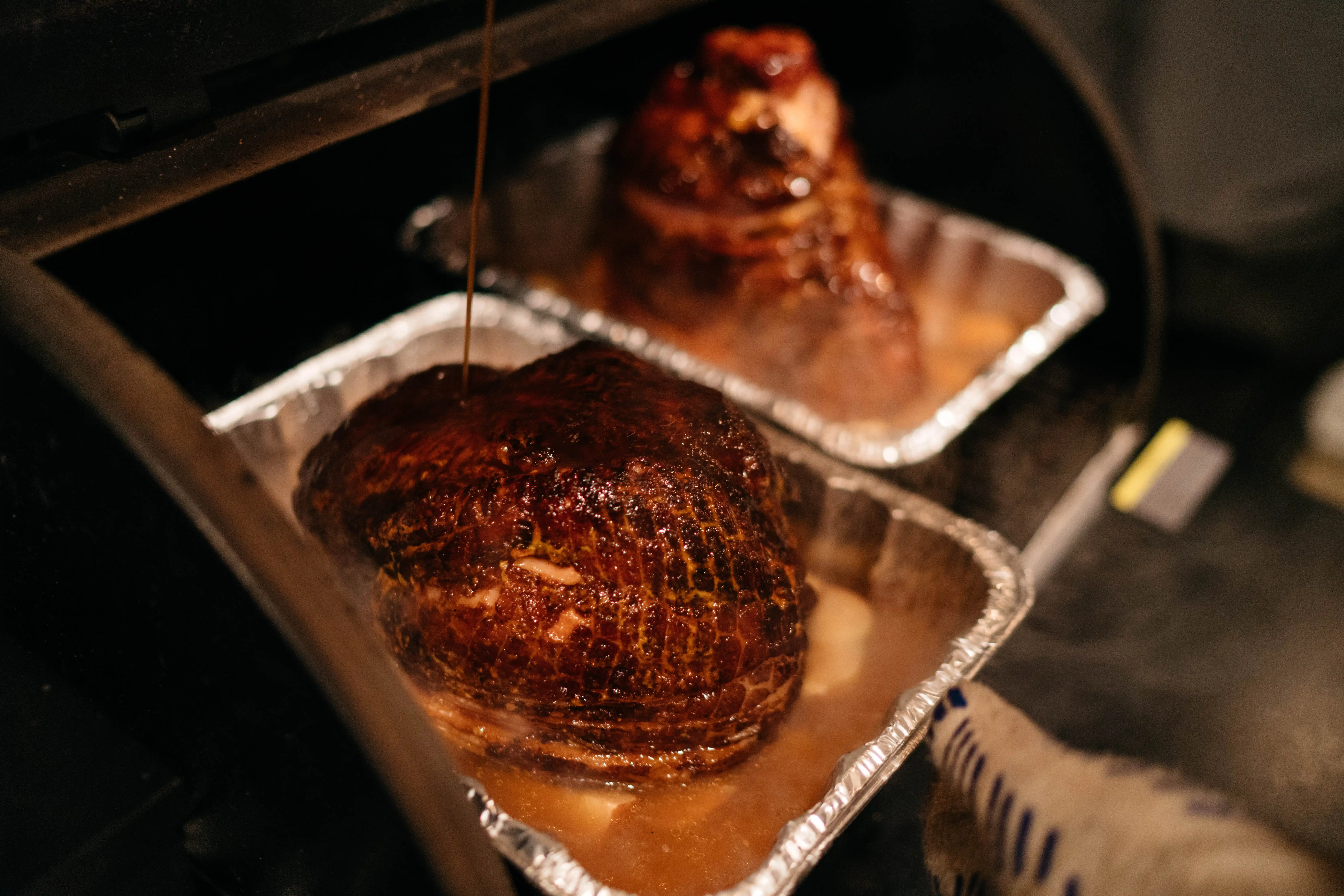 - Once ham is done cooking (inner-temp 135), bring inside to counter, uncover, and pour glaze over ham. Let rest for 10 minutes and serve.