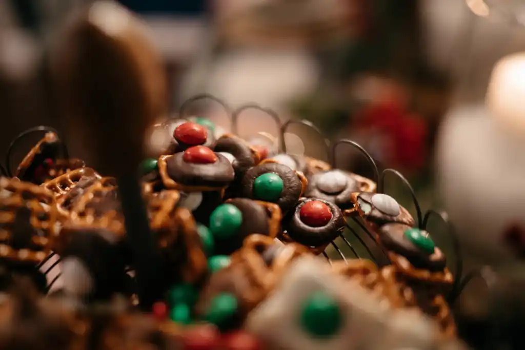 - Immediately press a peppermint m&m on top of each Hershey kiss. If wanted, sprinkle some Christmas sprinkles on each one.