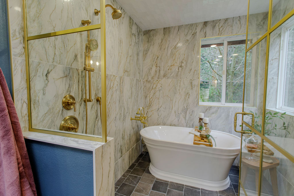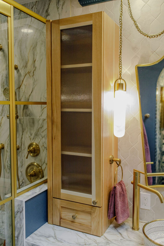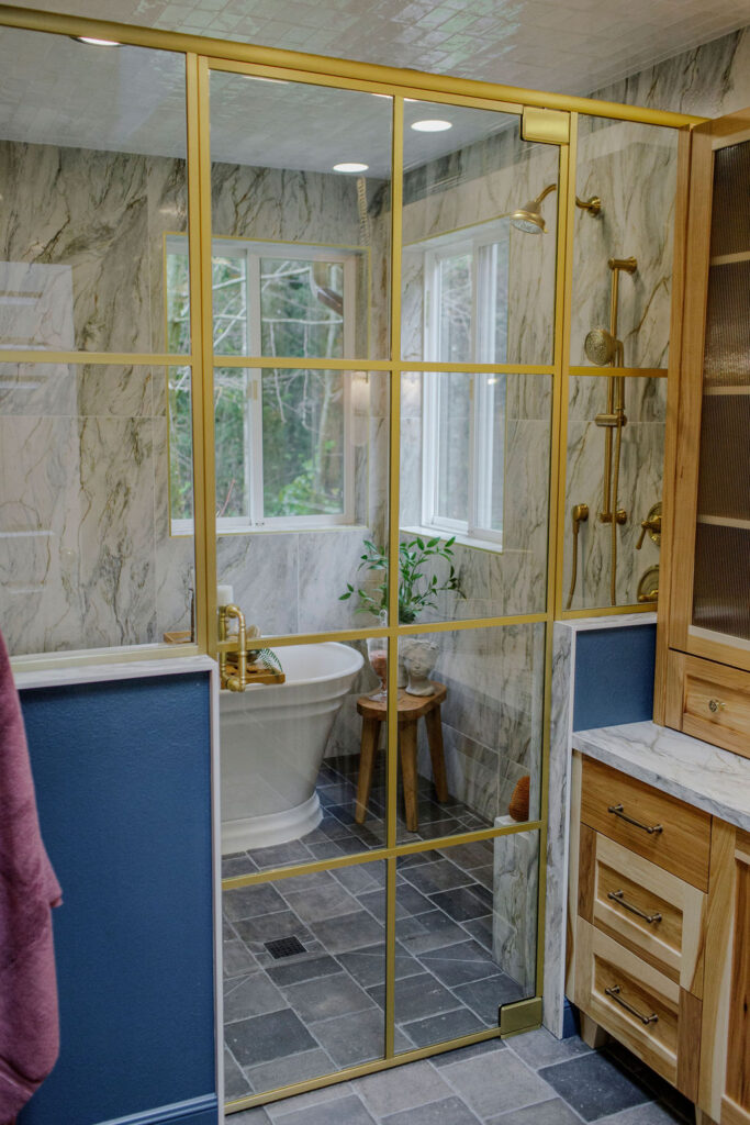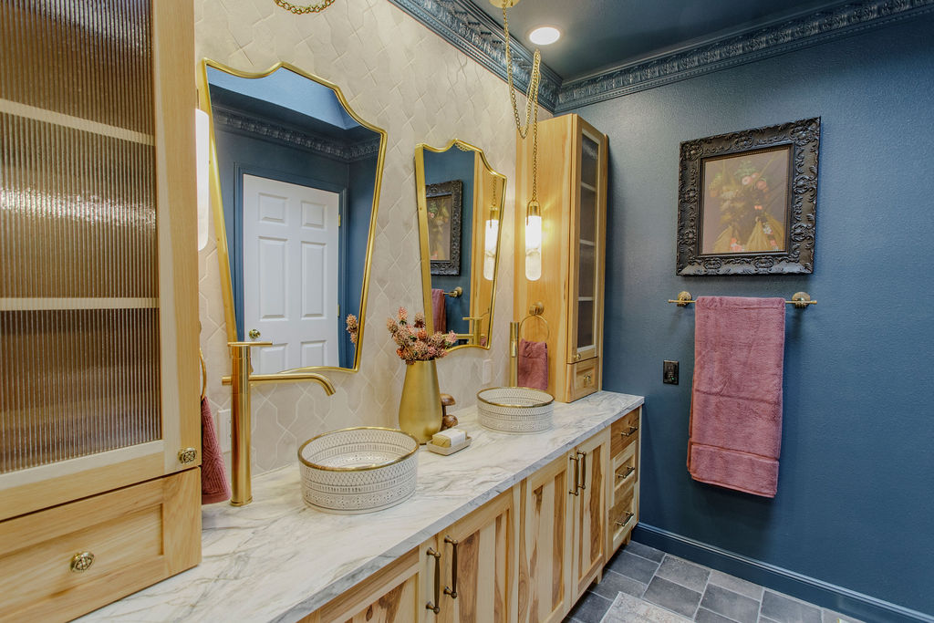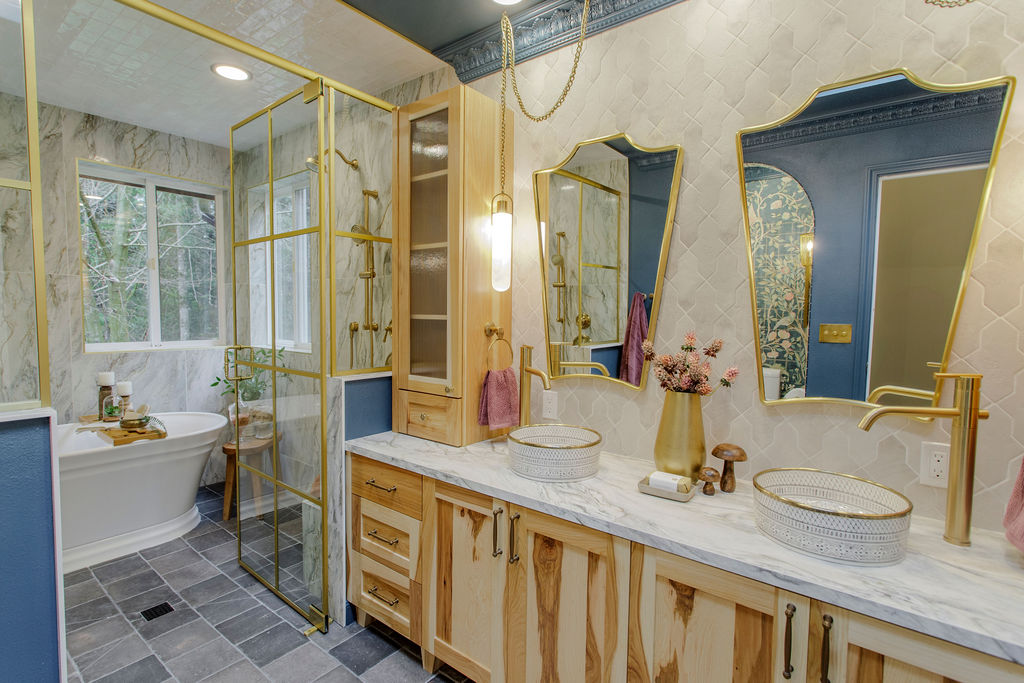 Step into a bathroom that’s anything but ordinary. For this project, we embraced our clients’ vivid imagination and personality with bold color, playful patterns, and a mix of eclectic vintage style with a touch of fairytale castle magic. Deep turquoise walls set a striking backdrop, while unique fixtures add personality at every turn. The centerpiece of the space is a generous wet room, featuring large-format tile and a luxurious soaking tub—perfect for turning everyday routines into extraordinary moments of relaxation.