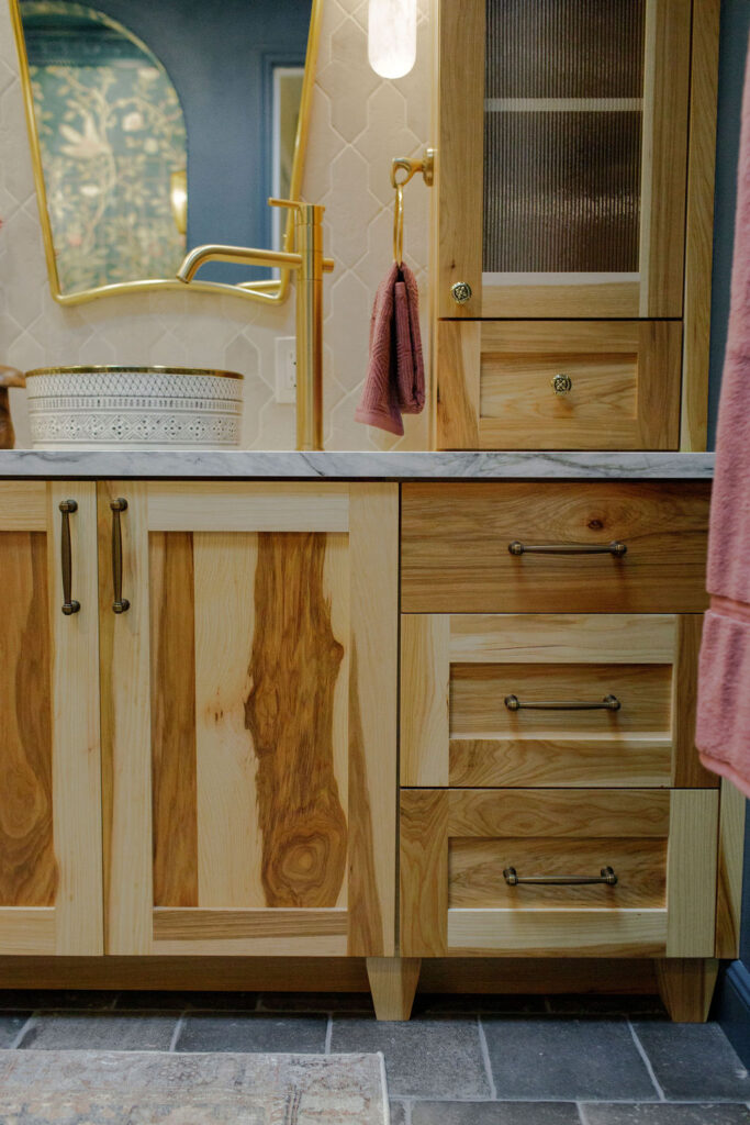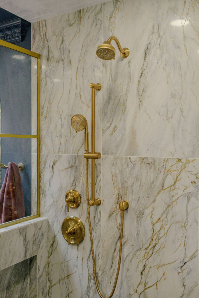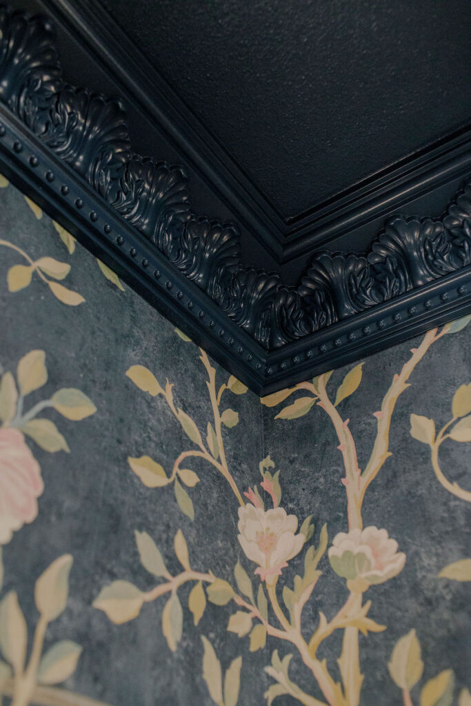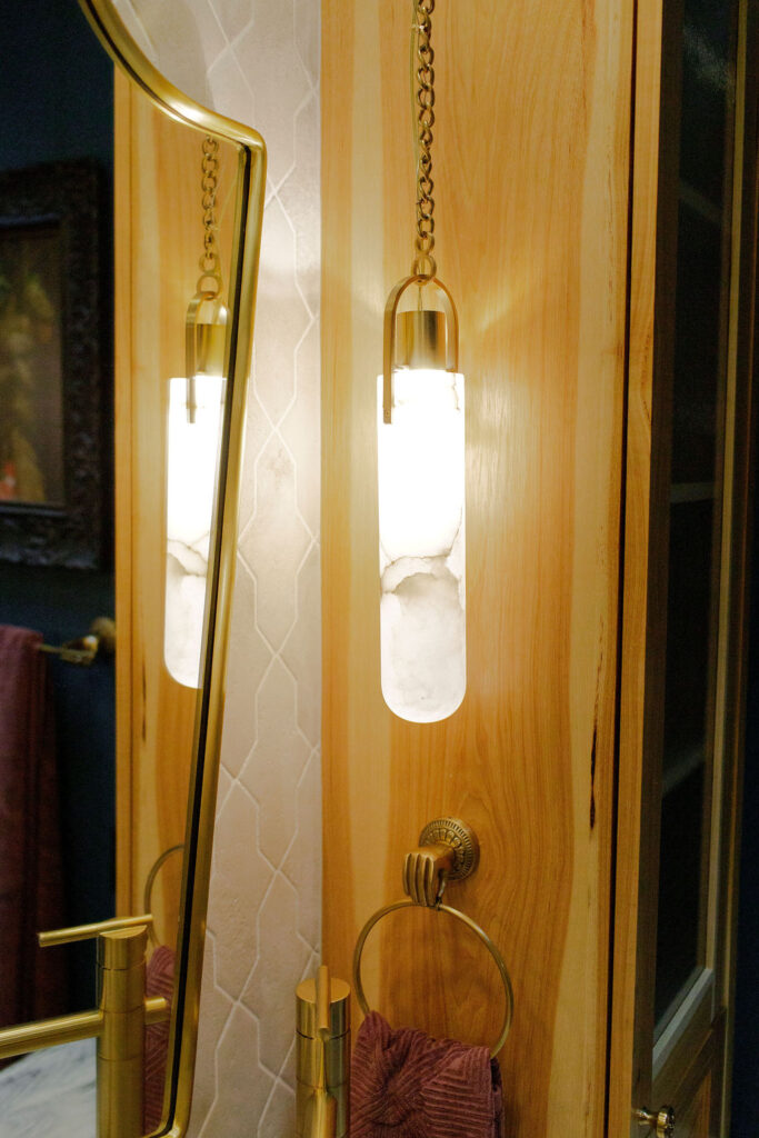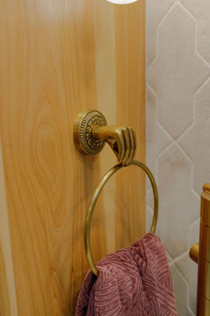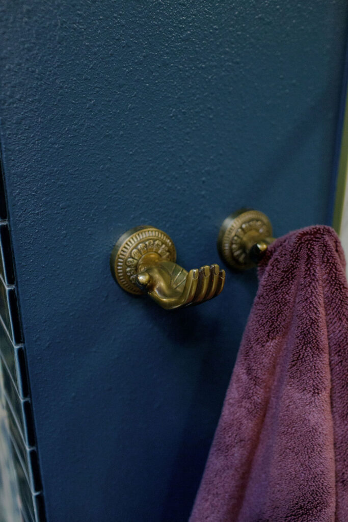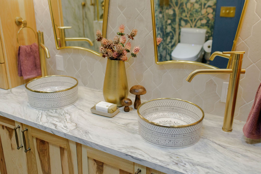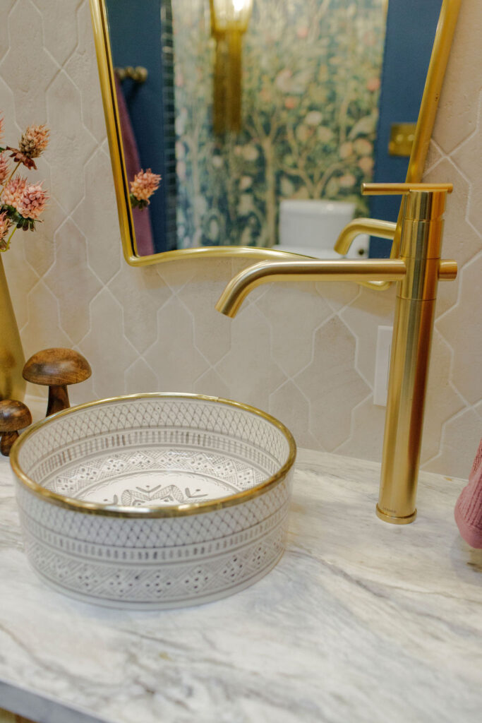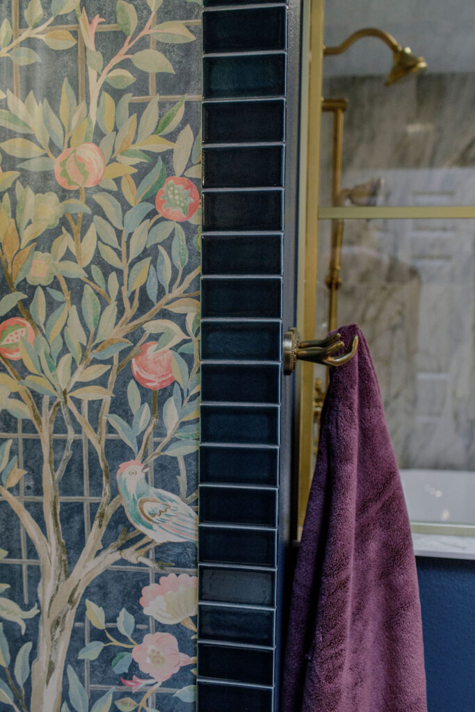 Unique details fill every corner of this bathroom, from the one-of-a-kind sinks to the little brass hands that hold your towels, and the whimsical wallpaper in the toilet nook! Our clients wanted to create a unique space that felt like stepping into a fairytale world, and our team of designers and the renovation crew were able to bring the vision to life!
