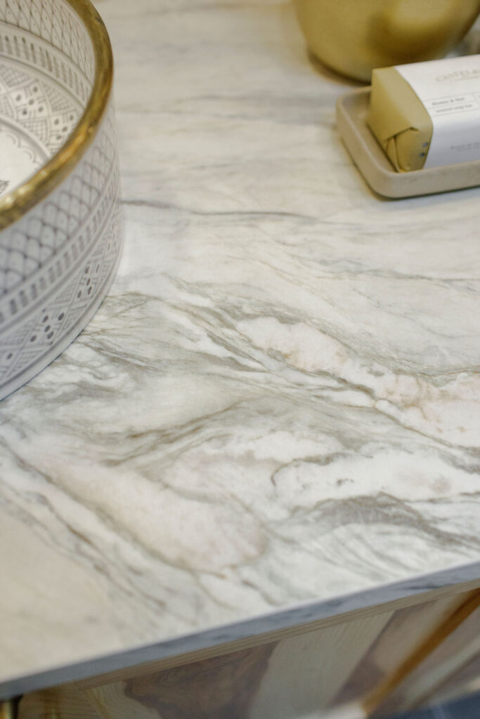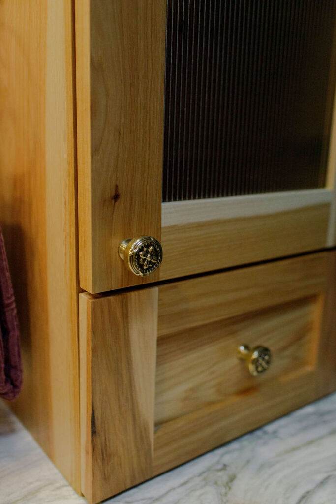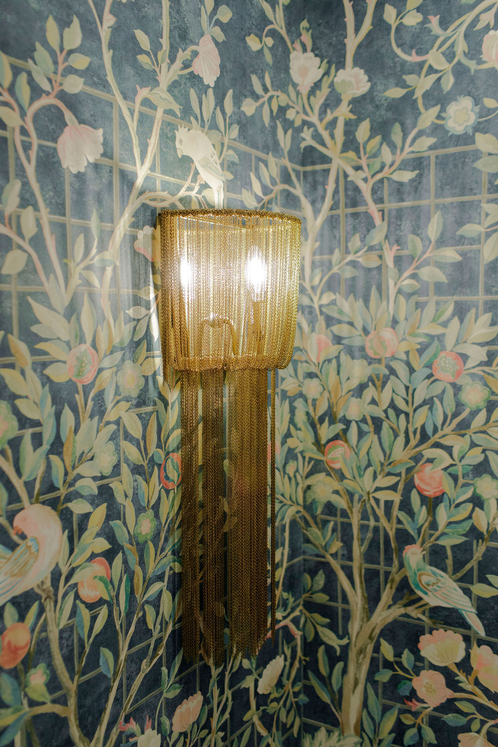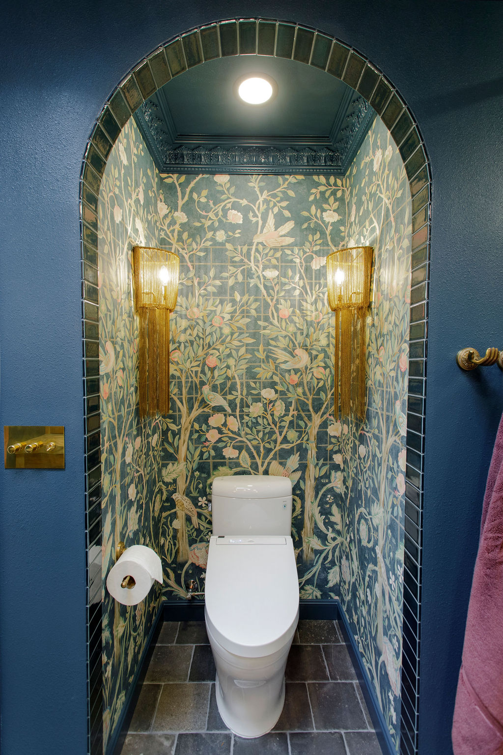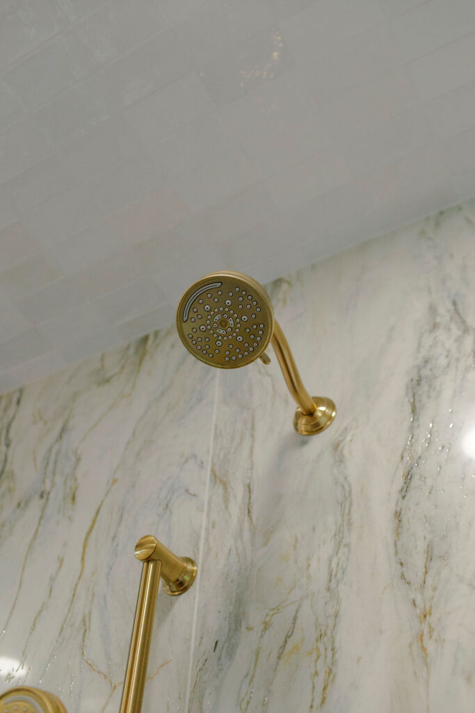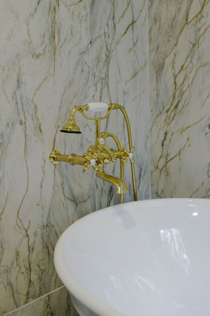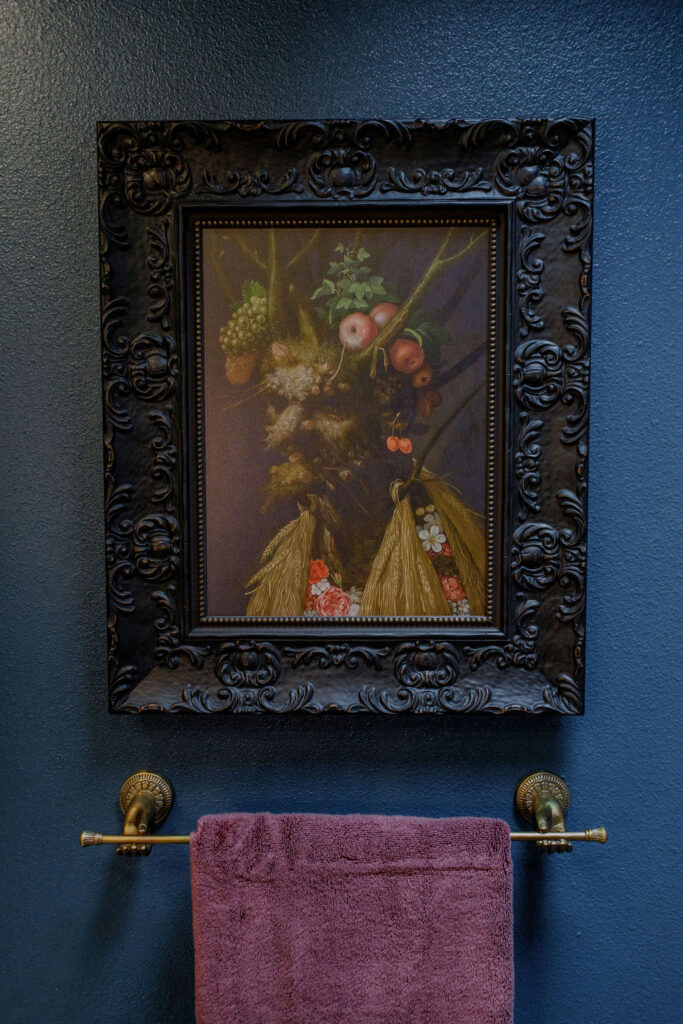Unique details fill every corner of this bathroom, from the one-of-a-kind sinks to the little brass hands that hold your towels, and the whimsical wallpaper in the toilet nook! Our clients wanted to create a unique space that felt like stepping into a fairytale world, and our team of designers and the renovation crew were able to bring the vision to life!