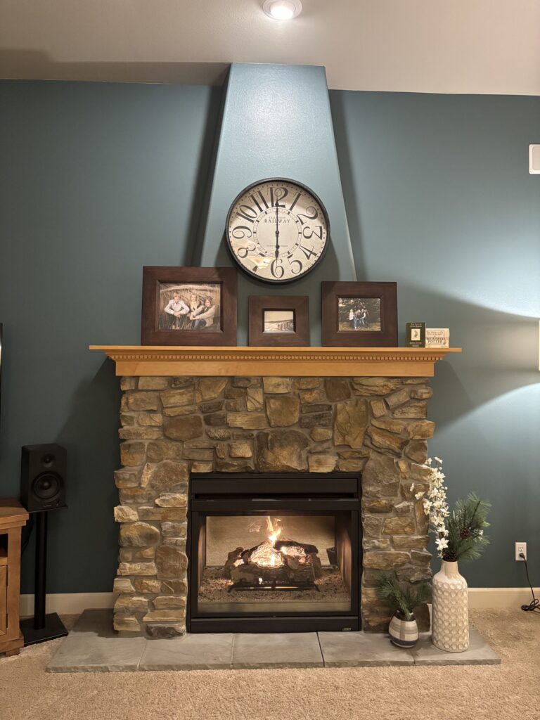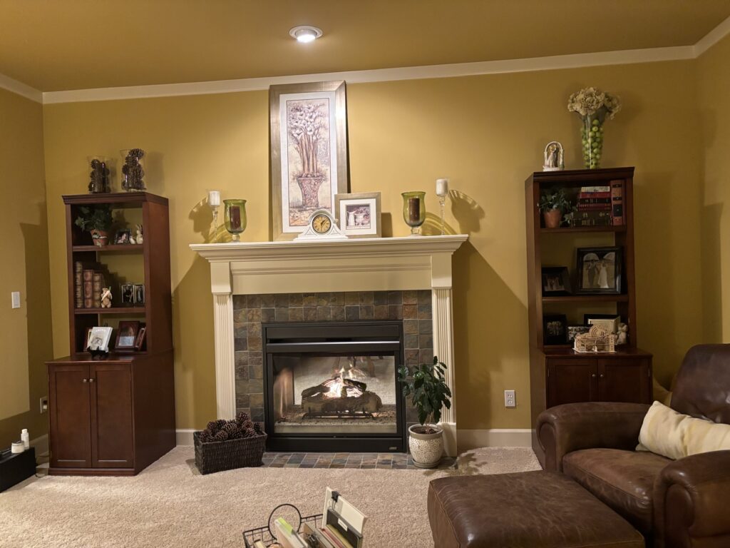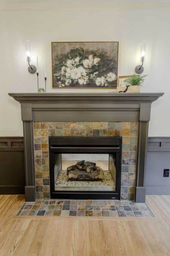 Here we refinished and continued the hardwood flooring throughout the home, painted the walls and the existing mantle, and added board and batten to the dining room.