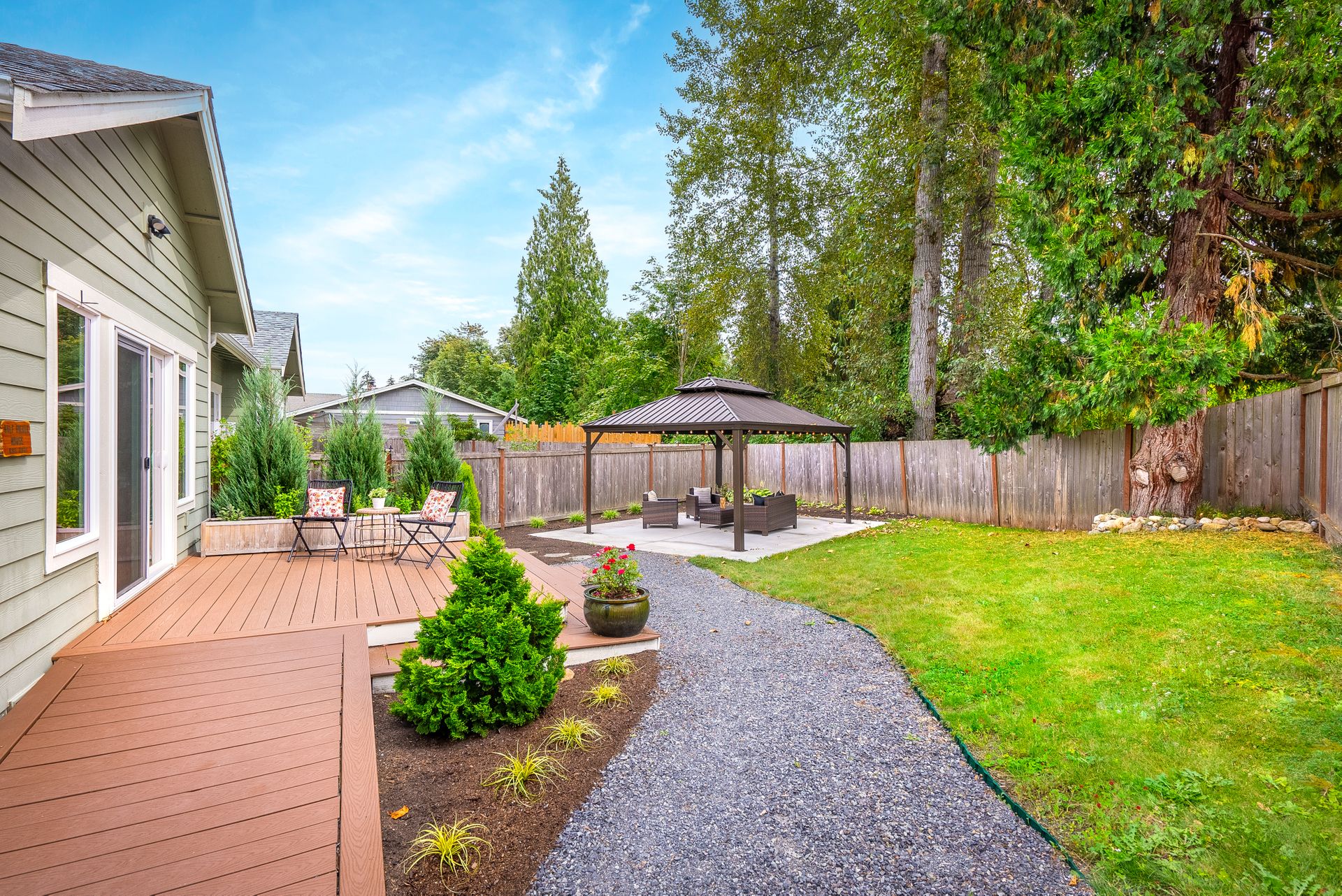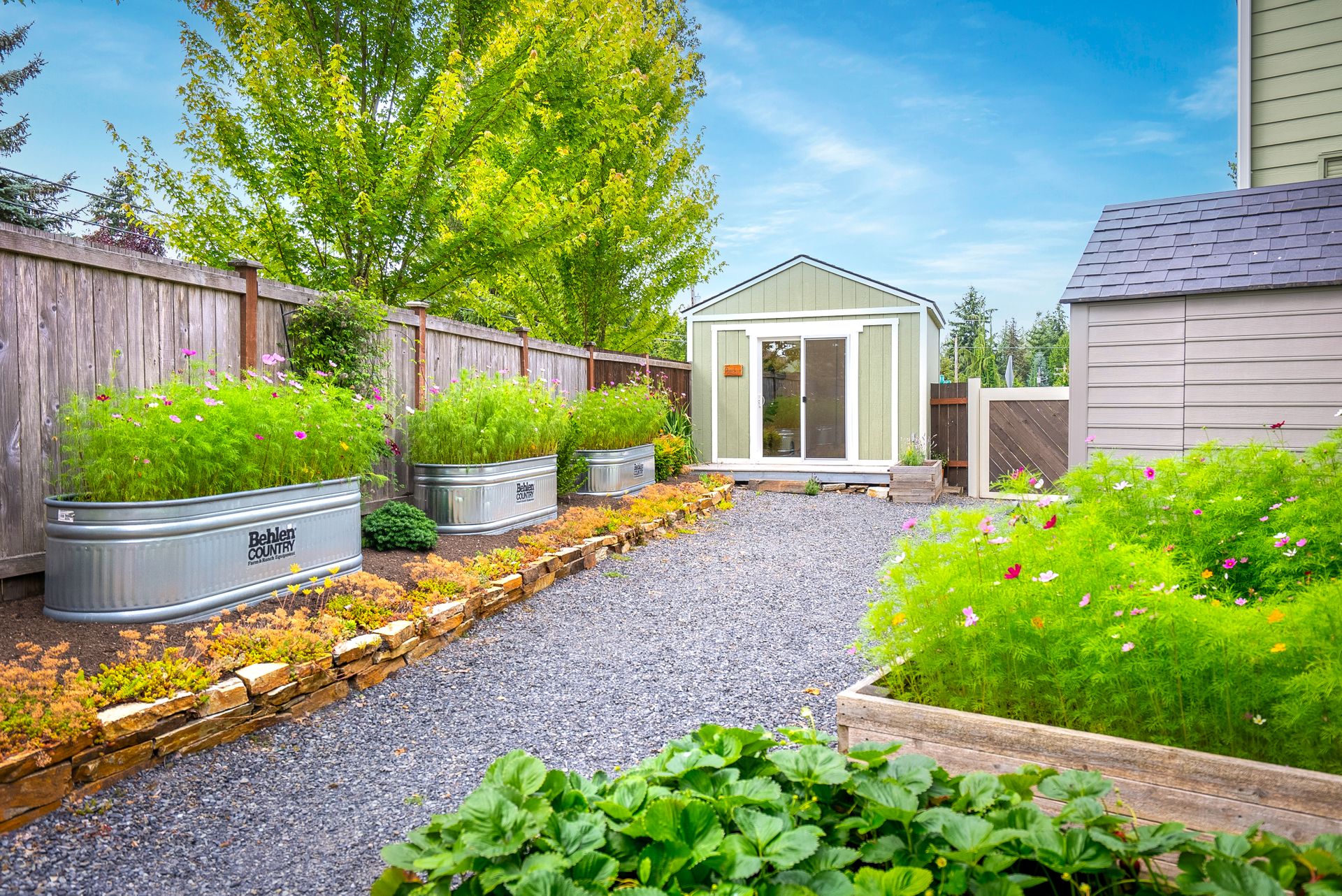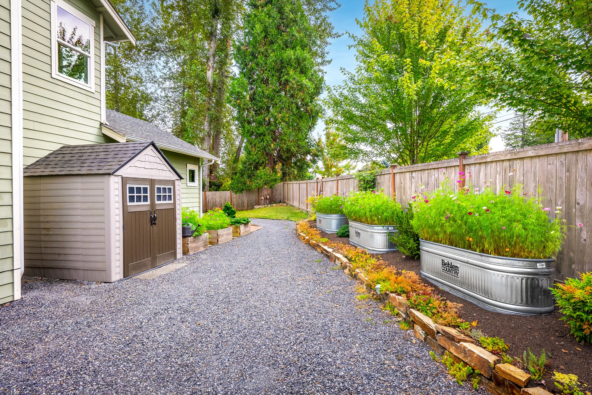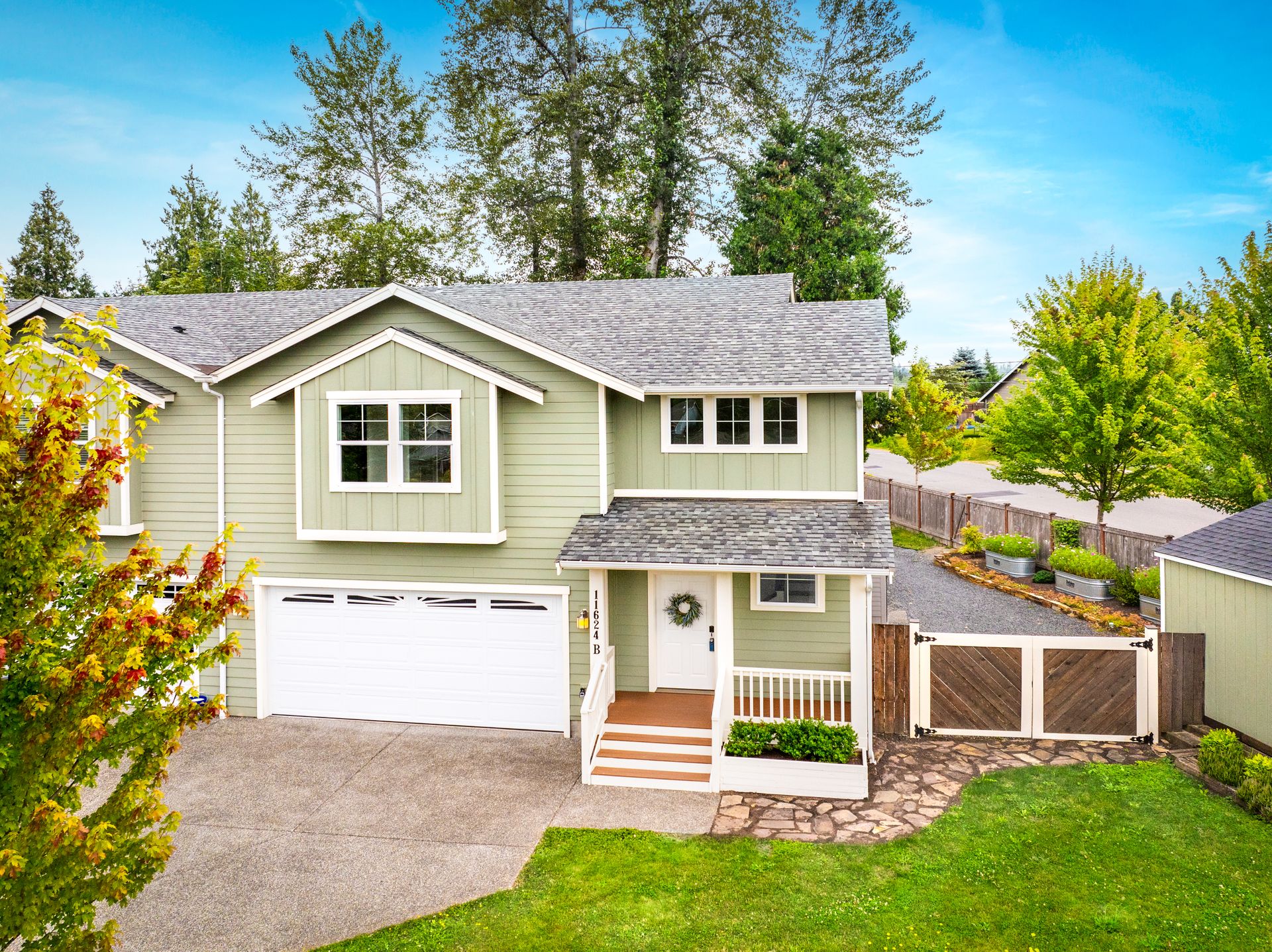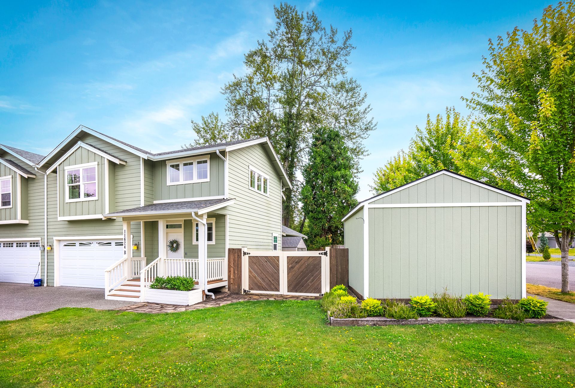 Welcome to this ideally located Lake Stevens home. Step inside and be greeted by soaring ceilings that flood the entryway with natural light. You will appreciate the open-concept feeling of the main floor, designed for the host who loves to entertain. The spacious dining room seamlessly flows into the living room, featuring a cozy fireplace. The kitchen is filled with ample storage and bar-height seating, perfect for breakfast and morning coffee. The main floor also features a powder bath, which adds a touch of convenience for you and your guests. Take your living space outdoors in the privacy of your backyard oasis surrounded by nature. The back deck is perfect for summer BBQs, while the separate covered patio offers space for outdoor dining, a potential hot tub, and so much more. You will also find an abundance of raised garden beds bursting with vibrant flowers and delicious strawberries. The finished outdoor shed creates room for a calming yoga studio, secluded work-from-home office, or room for woodworking and arts & crafts.