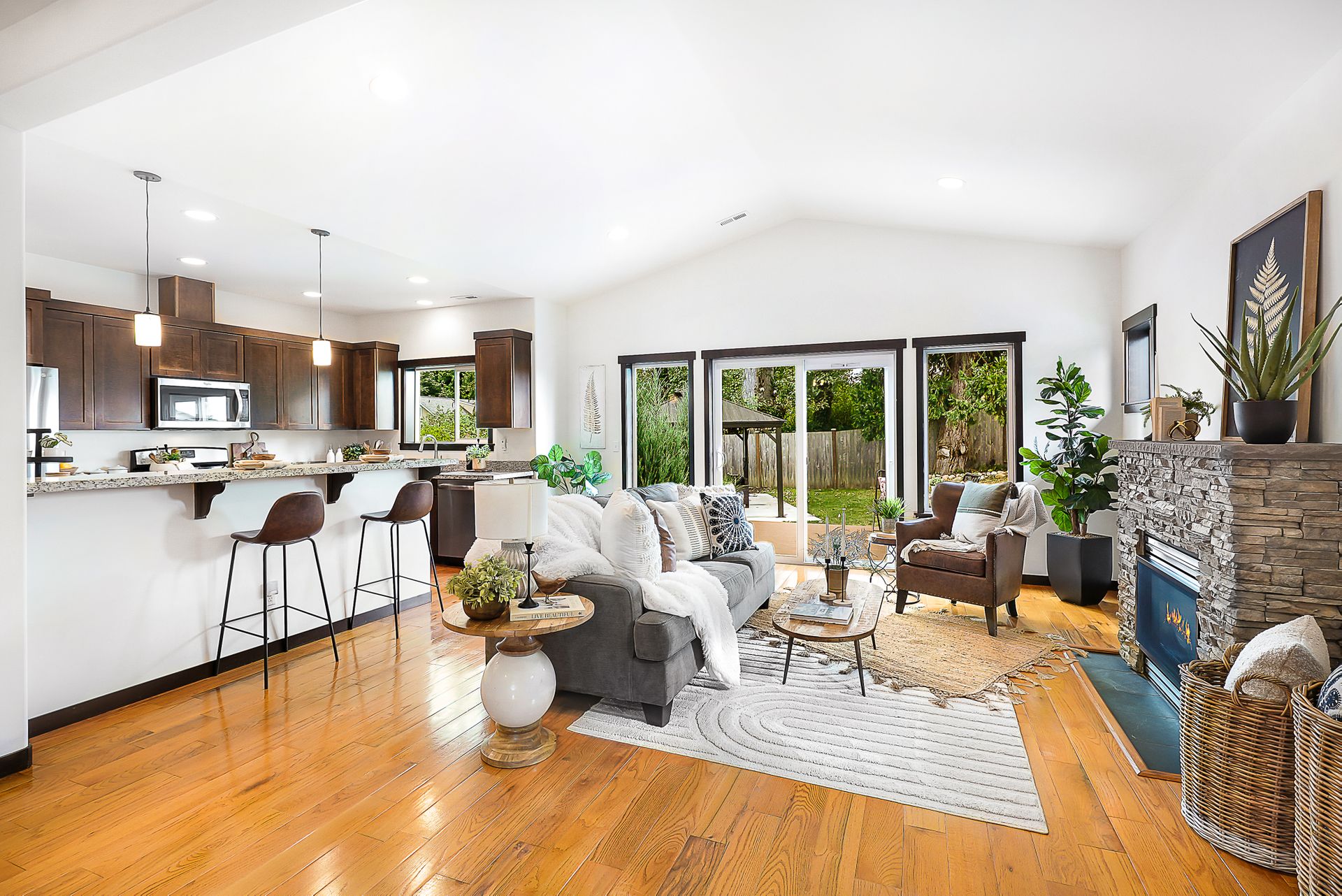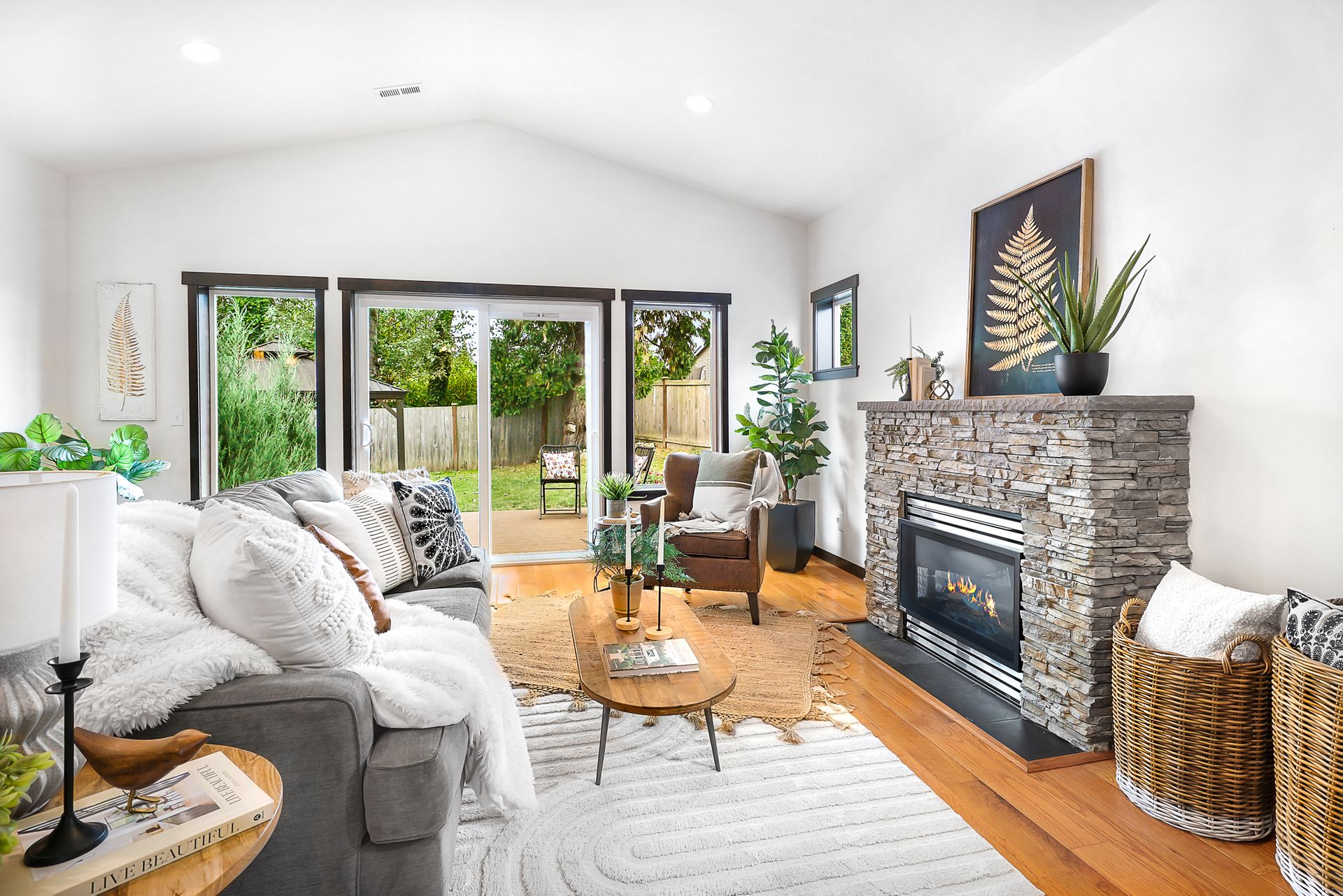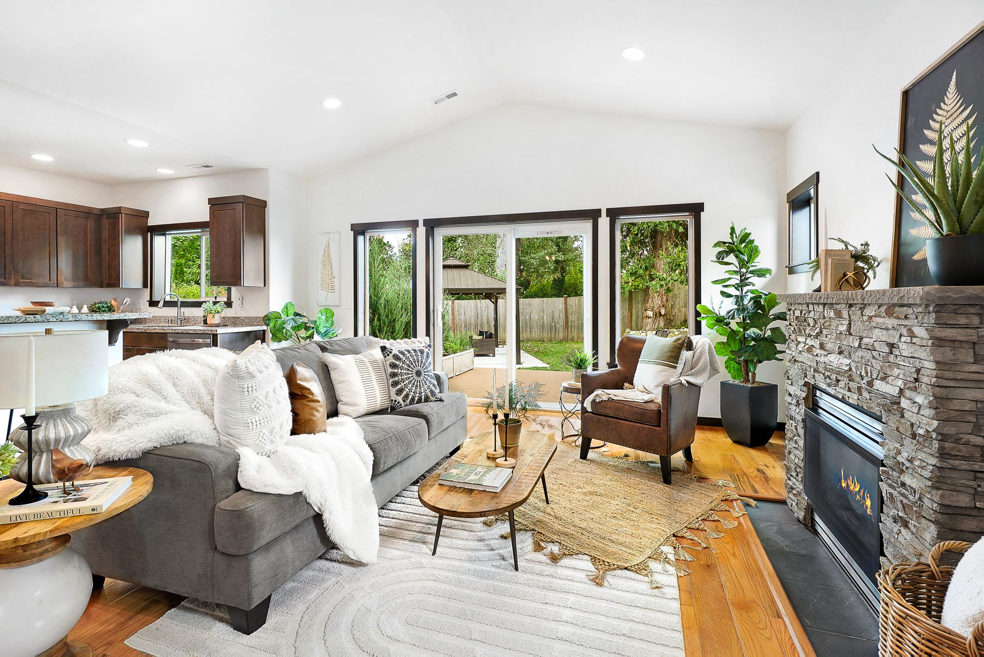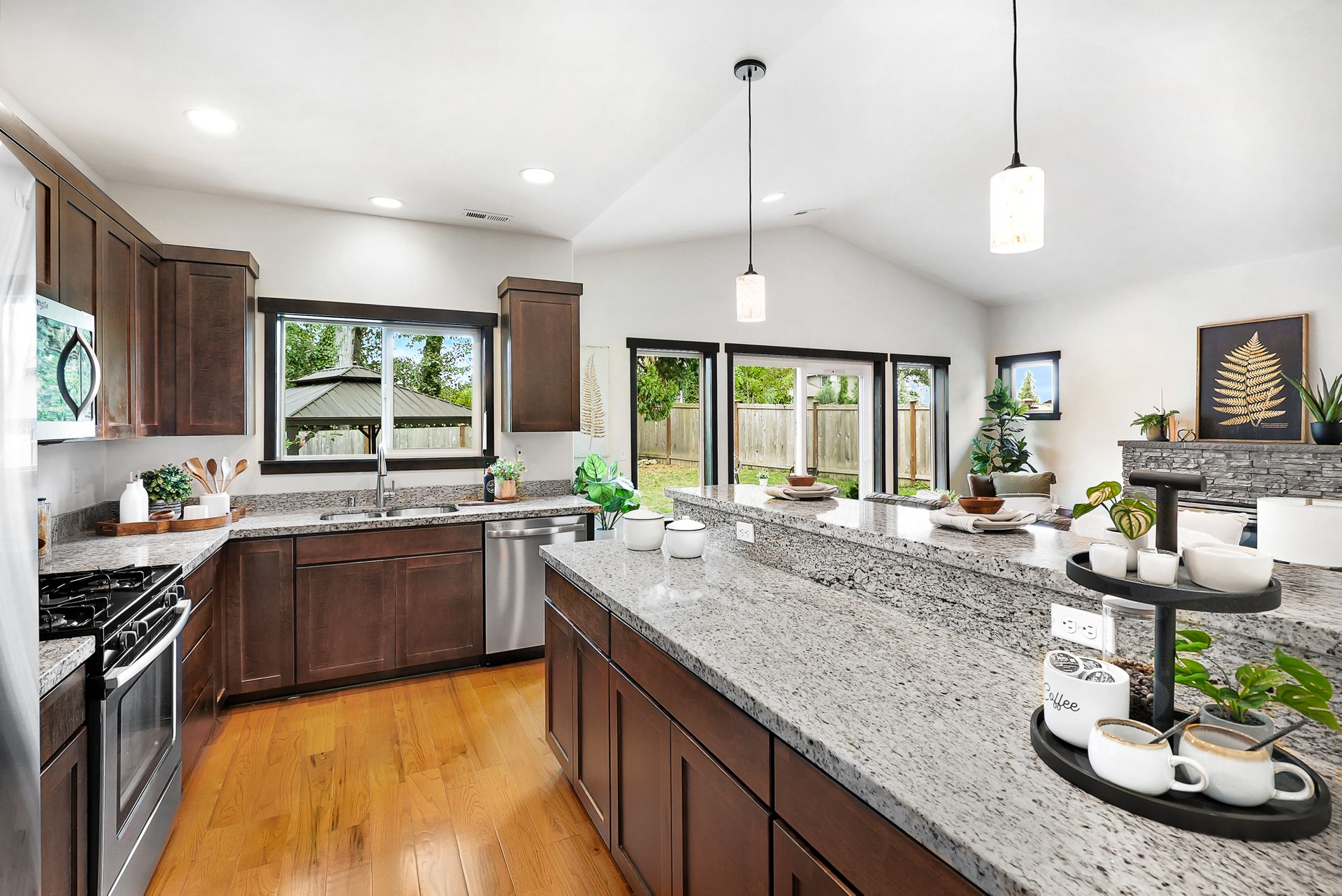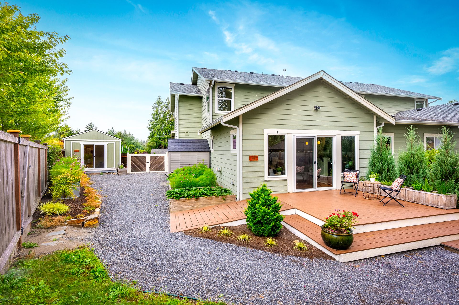 Welcome to this ideally located Lake Stevens home. Step inside and be greeted by soaring ceilings that flood the entryway with natural light. You will appreciate the open-concept feeling of the main floor, designed for the host who loves to entertain. The spacious dining room seamlessly flows into the living room, featuring a cozy fireplace. The kitchen is filled with ample storage and bar-height seating, perfect for breakfast and morning coffee. The main floor also features a powder bath, which adds a touch of convenience for you and your guests. Take your living space outdoors in the privacy of your backyard oasis surrounded by nature. The back deck is perfect for summer BBQs, while the separate covered patio offers space for outdoor dining, a potential hot tub, and so much more. You will also find an abundance of raised garden beds bursting with vibrant flowers and delicious strawberries. The finished outdoor shed creates room for a calming yoga studio, secluded work-from-home office, or room for woodworking and arts & crafts.