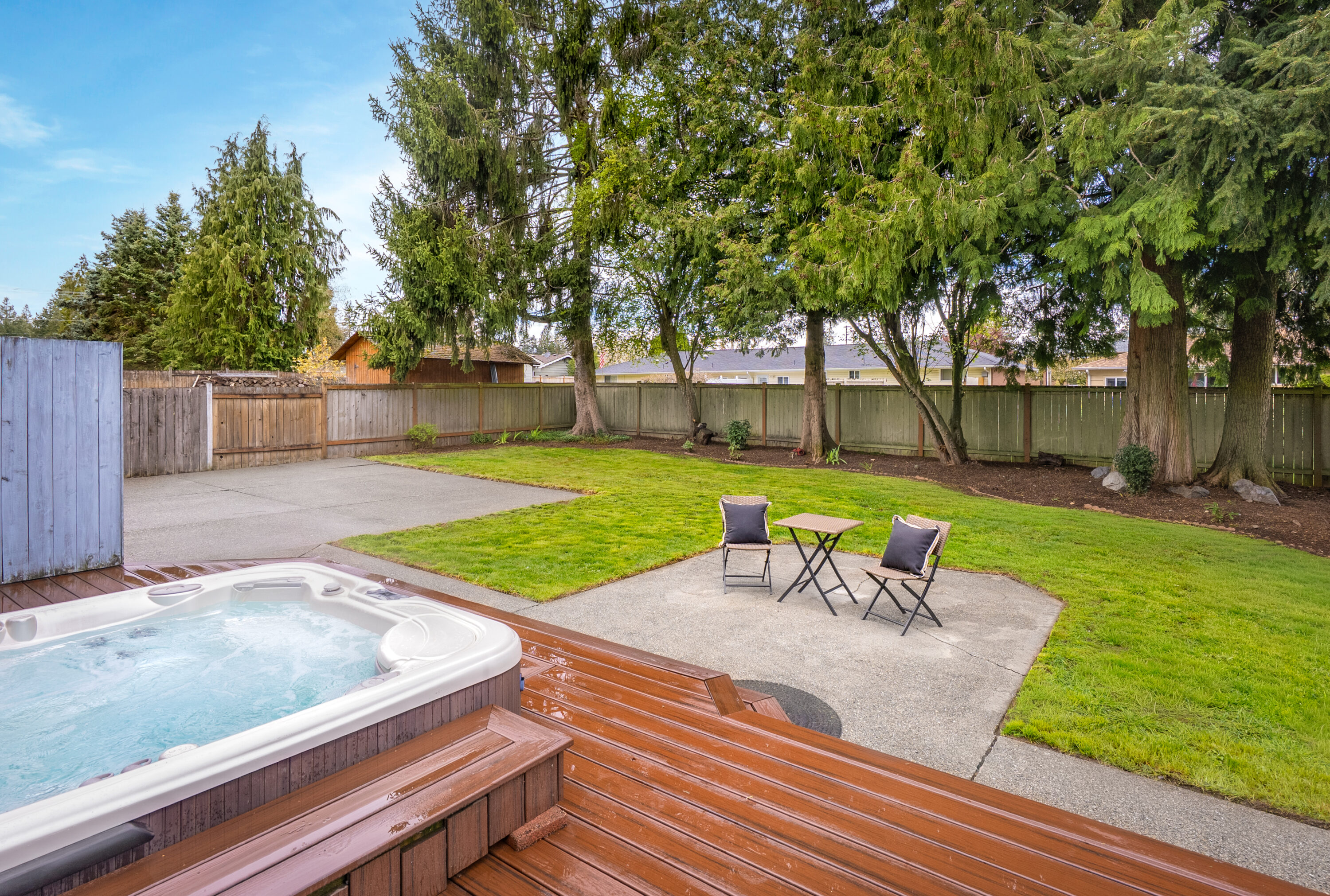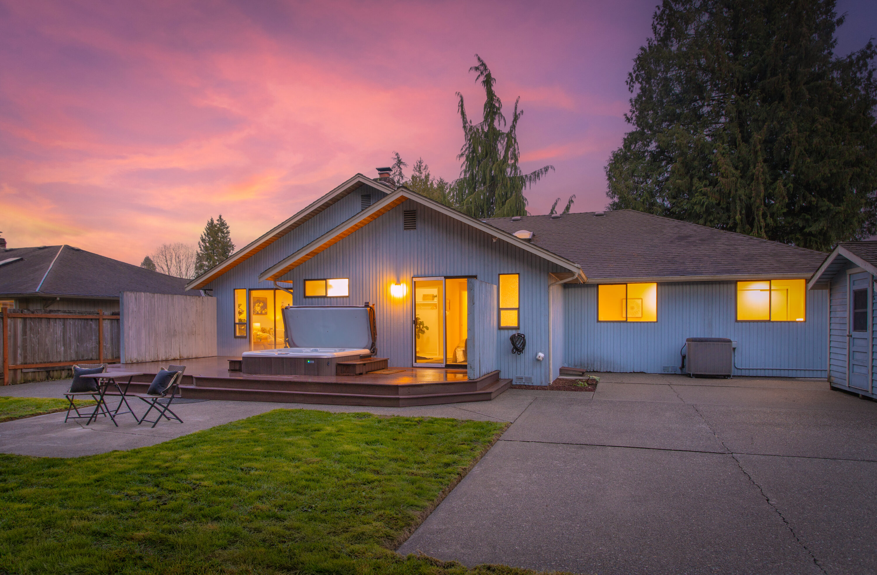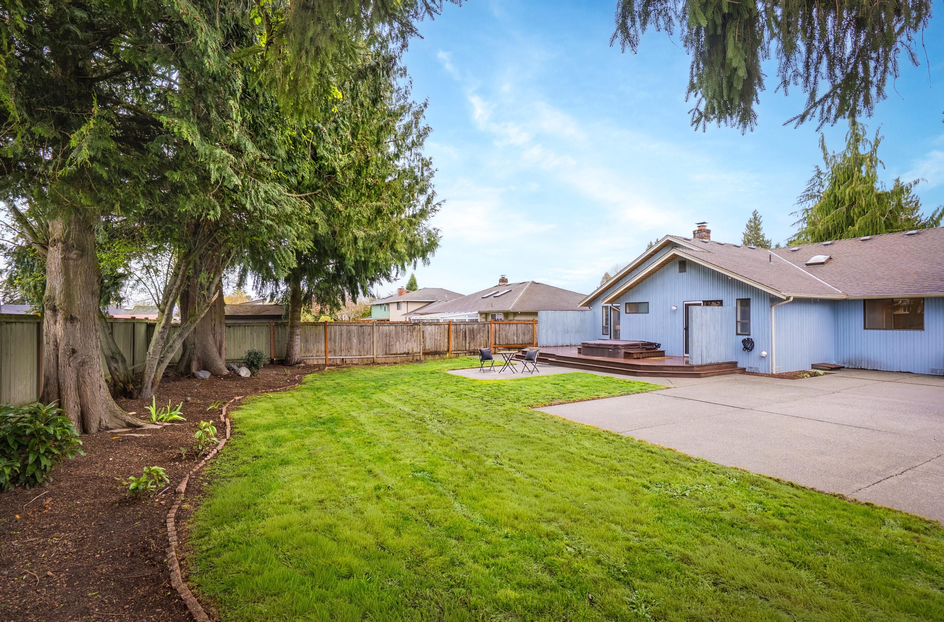 Ideally located just minutes from Boeing, Paine Field, and a wide variety of shopping and dining, this Everett rambler offers the perfect blend of comfort and convenience. Enjoy simple daily routines with local schools and parks just steps away, plus quick access to commuter routes. A spacious entry welcomes you in with bright, fresh paint, leading into a sun-filled living room with vaulted ceilings, exposed beams, and oversized windows. The adjacent formal dining space is designed for effortless entertaining, while the kitchen boasts stainless steel appliances, generous prep space, a walk-in pantry, and a sunny breakfast nook. A secondary living room, warmed by a cozy fireplace, opens directly to your outdoor retreat, complete with a large back deck, fully fenced yard, and a relaxing hot tub. Down the hall, the primary suite features private deck access, a walk-in closet, and an ensuite bath, while two additional bedrooms, a full hall bathroom, and a centrally located laundry room provide flexibility for guests or growing households alike.