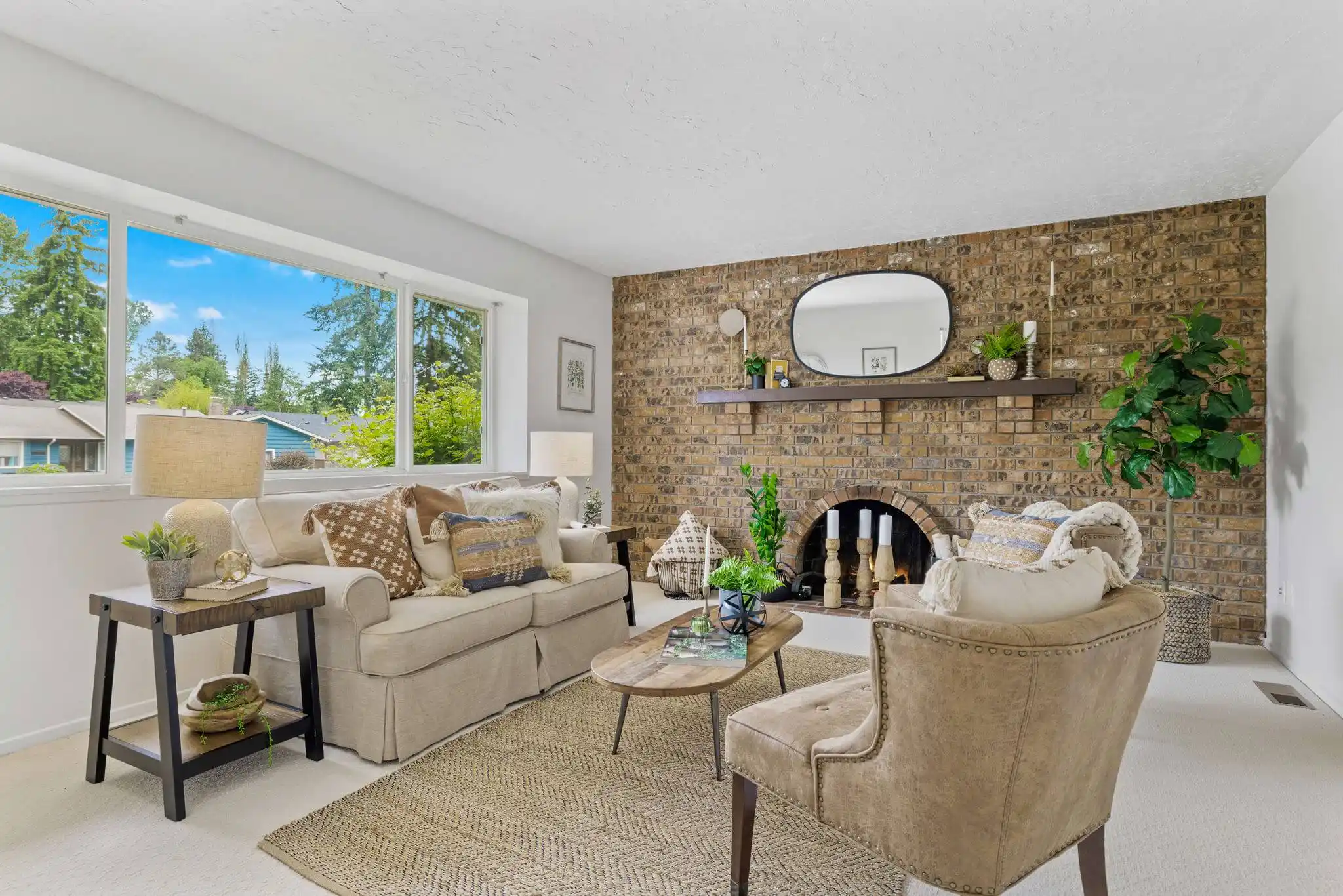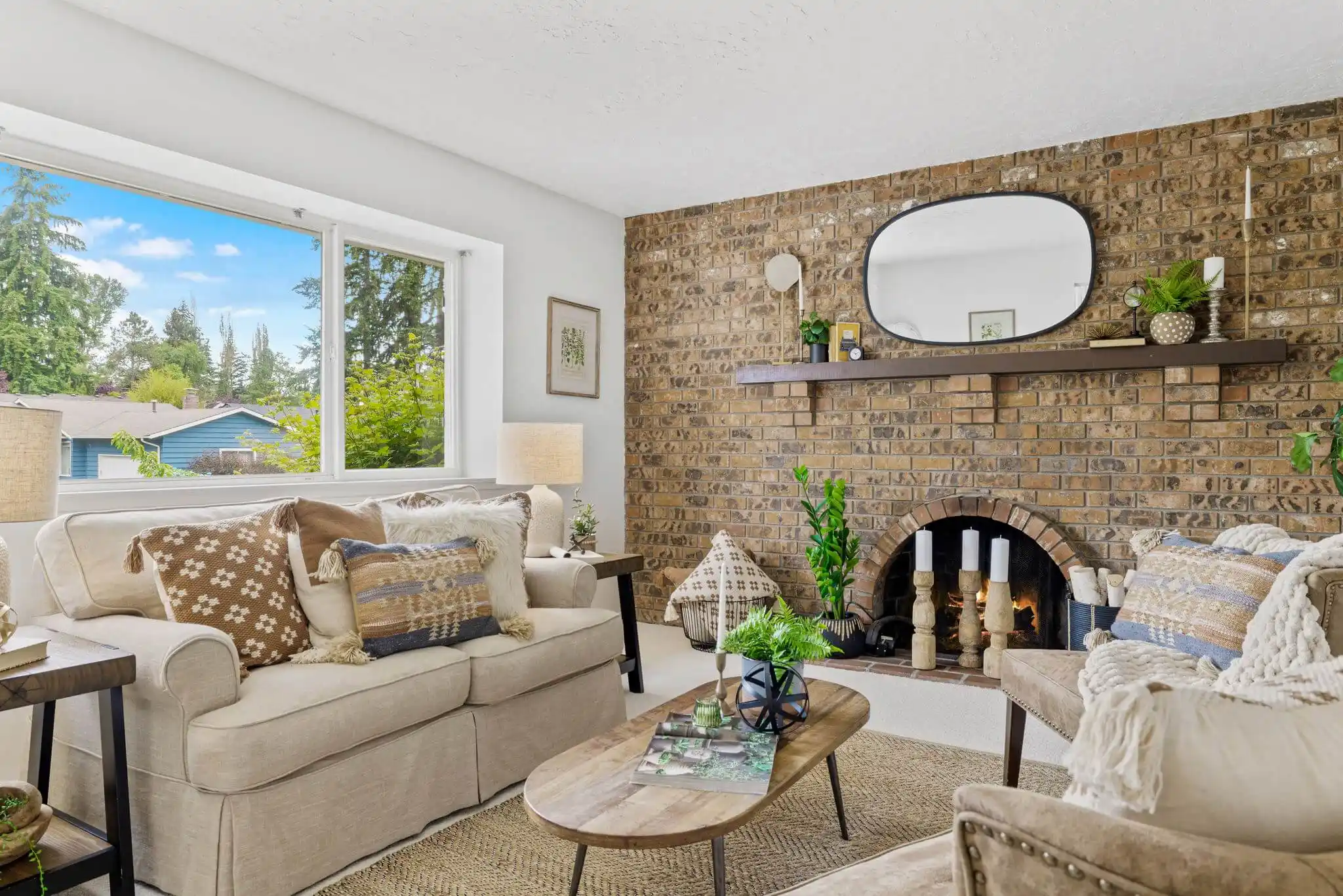 - Beautiful brick accent wall centered by an architecturally-unique arched wood-burning fireplace and wood mantle.