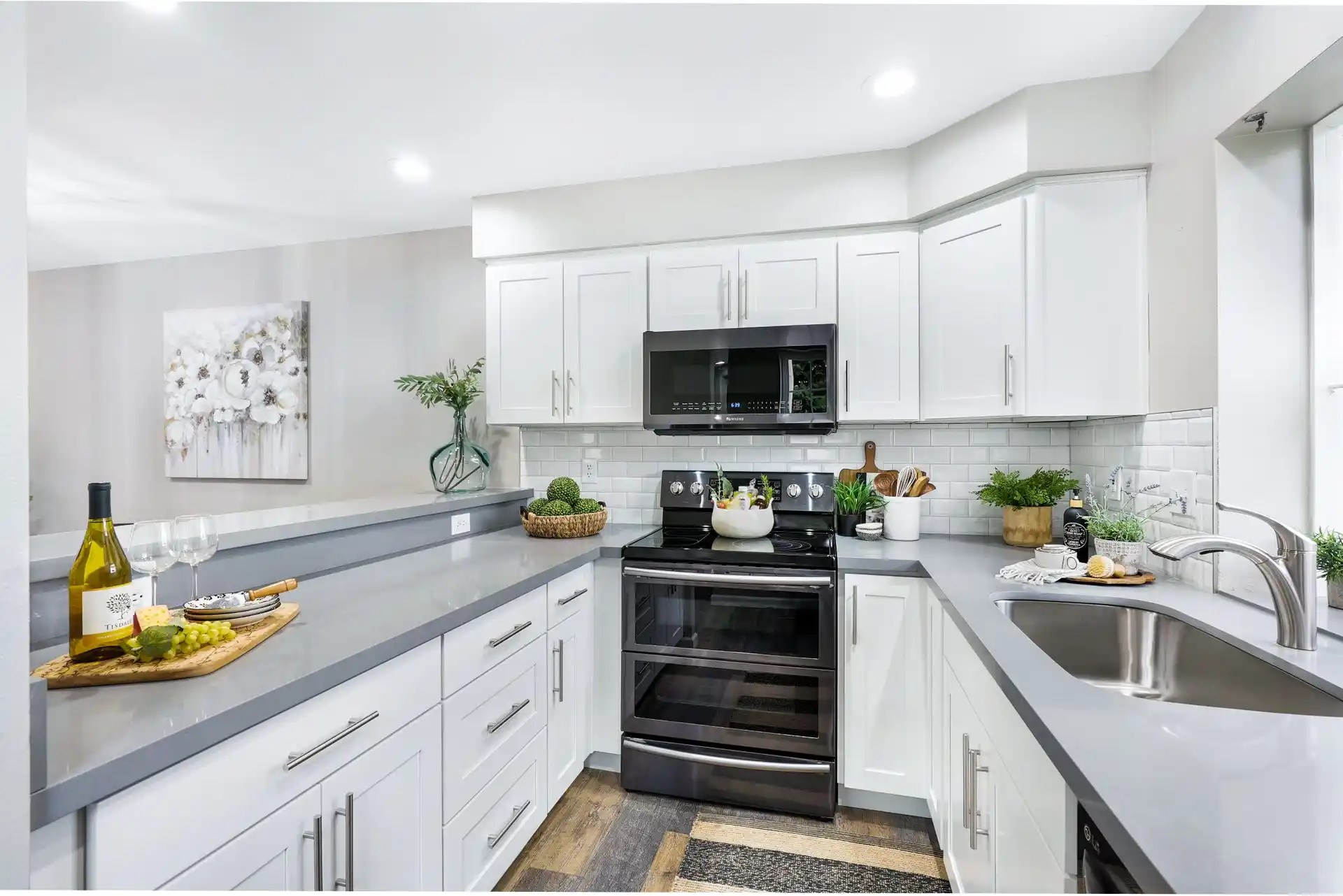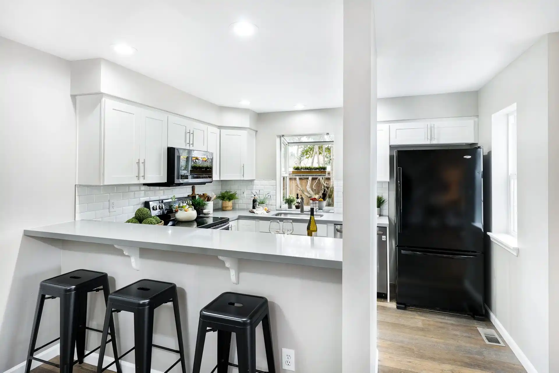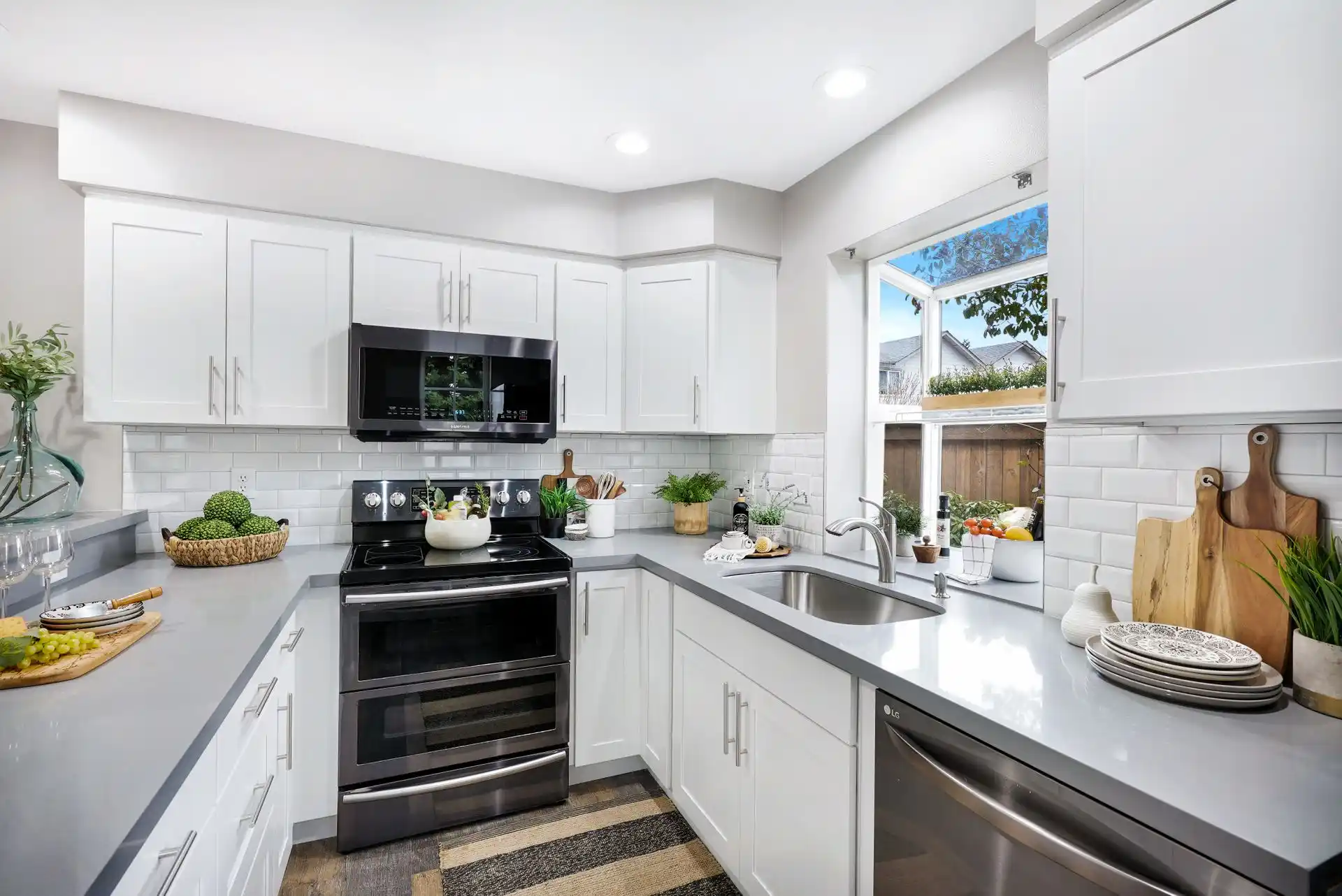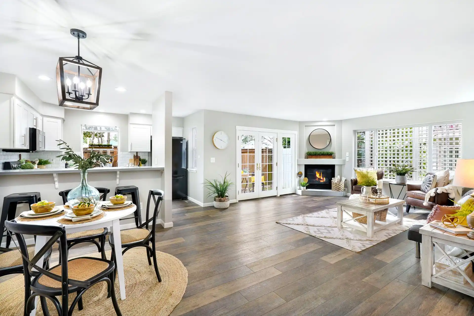 This meticulously updated Lynnwood townhouse has been transformed to bring easy and modern living to your everyday life. Elements of style will be seen throughout, from the beautiful luxury vinyl plank flooring to the new light fixtures and nearly everything in between. An open layout will allow you to effortlessly greet guests in the entry and continue conversations into the main living spaces. The spacious kitchen is a perfect combination of contemporary design and functionality with quartz countertops, ample storage space with timeless-white soft-close cabinets, a dual-shelf garden window, and a two-tier peninsula ideal for entertaining or high barstool seating. Have a meal together in the adjacent dining space and end the evening in the living room cozied up near the accent fireplace. French doors lead outside to the patio space, ideal for grilling and relaxing! The oversized owner’s suite will be a personal oasis, complete with cathedral ceilings, double closets, and a five-piece ensuite with a soaking tub and walk-in shower. Nearby, two generously-sized bedrooms and a freshly updated bathroom await. This home is located near Ash Way Park & Ride, I-5, and I-405, making it ideal for commuting. You’ll also love the convenience of the Alderwood Mall, restaurants, shopping, and outdoor recreation at Meadowdale Beach Park or Picnic Point, only being moments away.