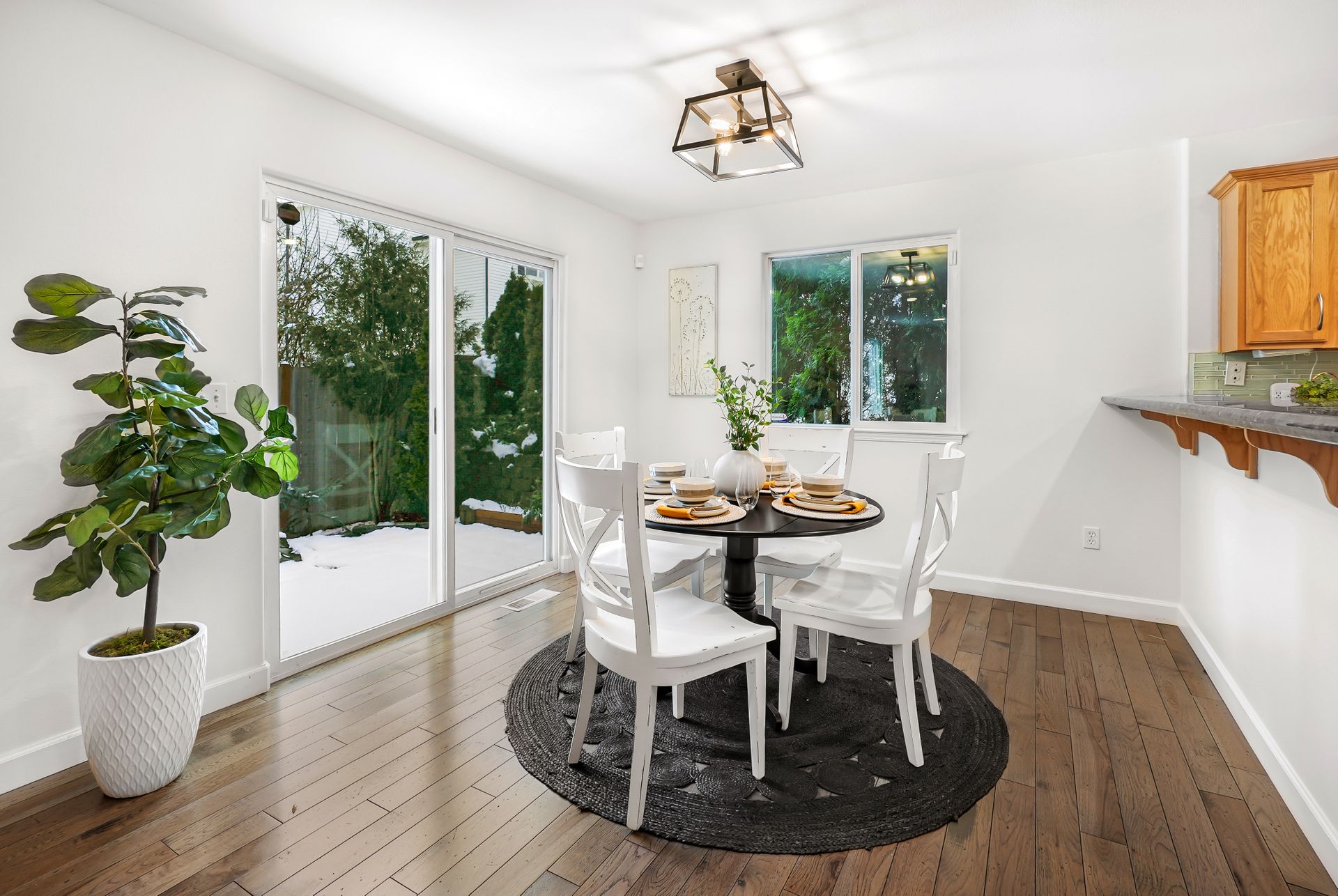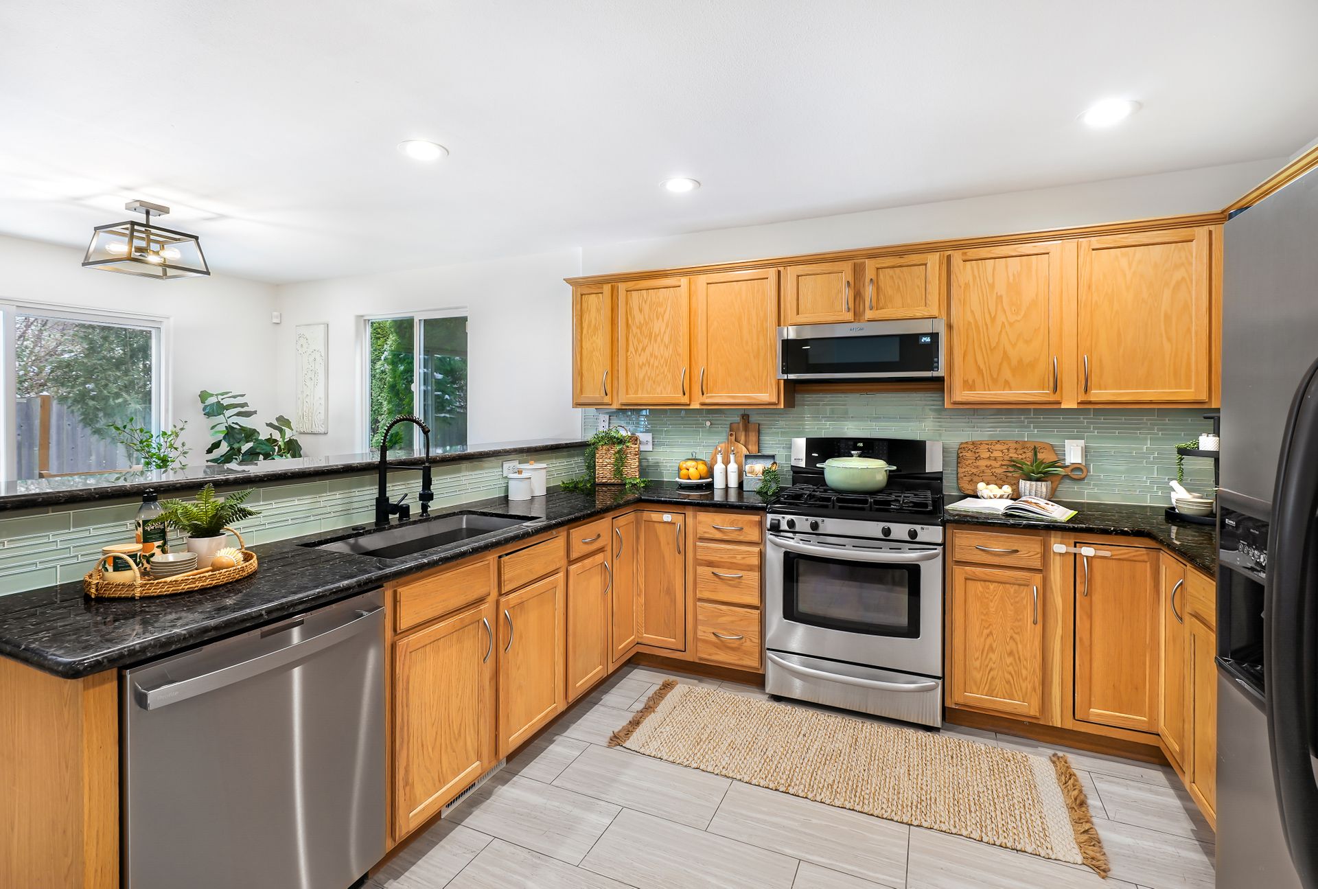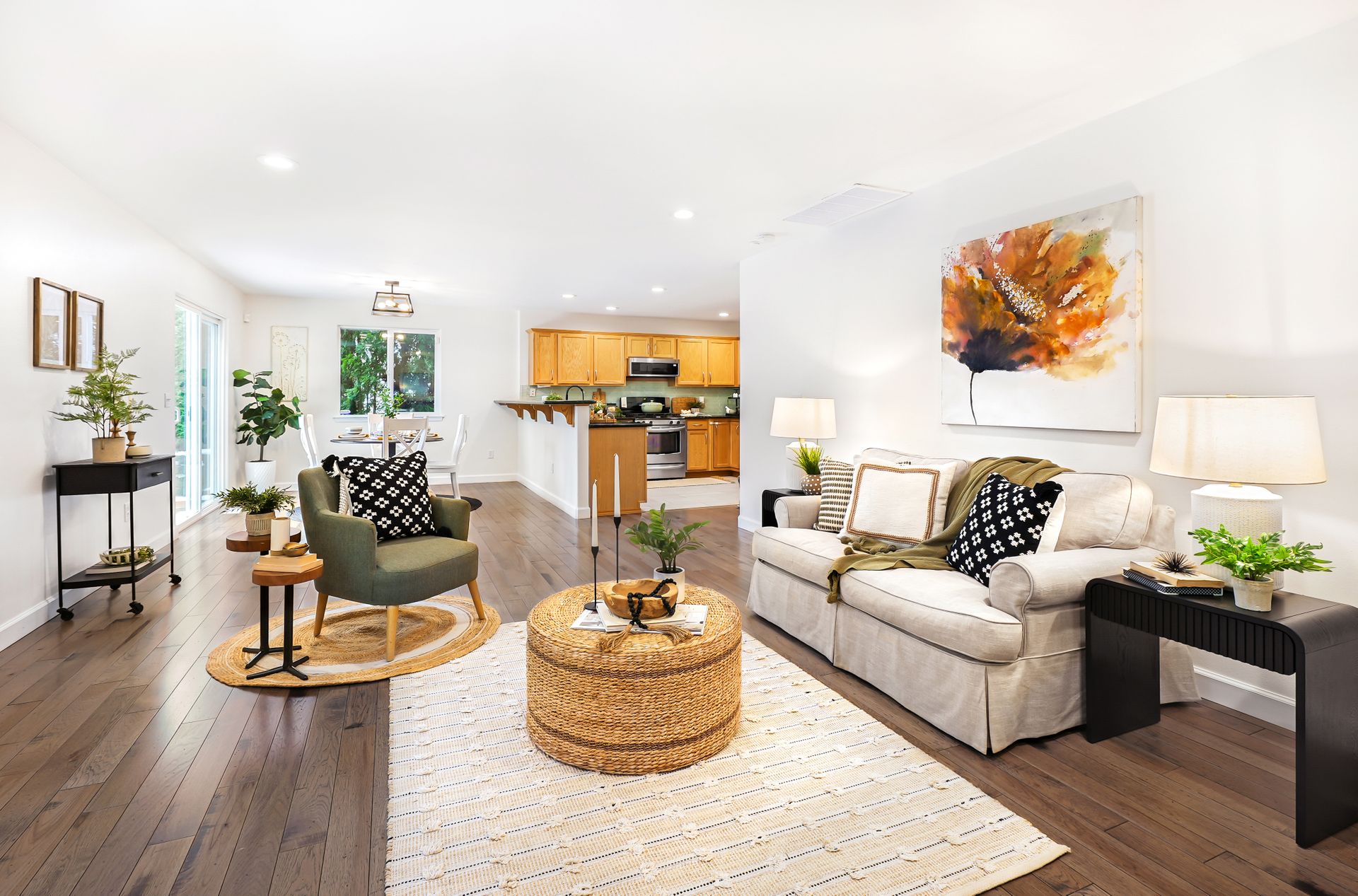 Step inside this well-maintained and bright home and enjoy relaxing evenings by the warm fireplace in the inviting living room. The open-concept layout seamlessly connects the living and dining areas, creating the perfect space for hosting gatherings. The kitchen boasts ample storage, generous prep space, casual bar seating, and a sunlit dining area with access to the back patio, ideal for indoor-outdoor entertaining.