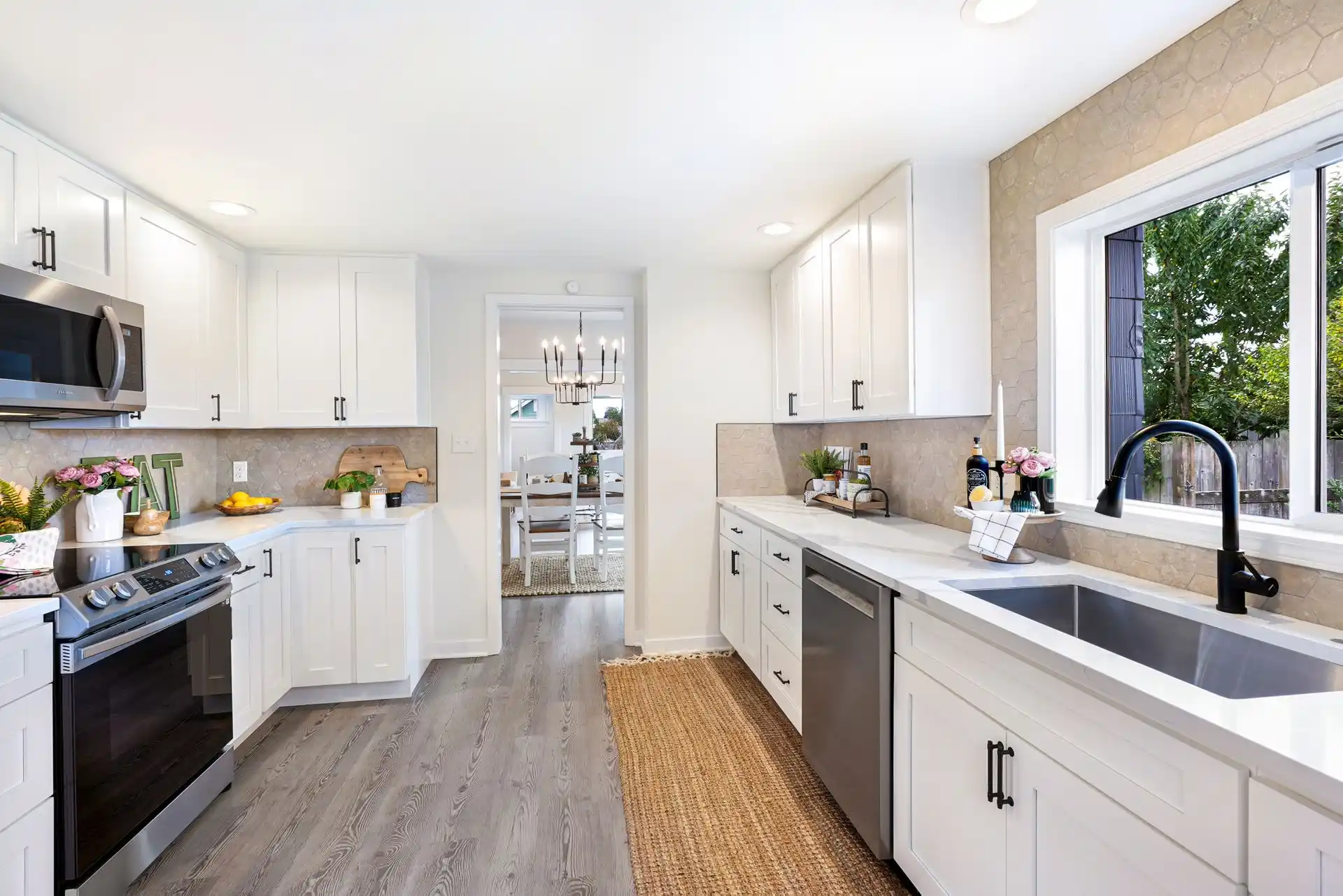 An extensive remodel to this beautiful historic home enhanced the original charm and craftsmanship. This 1920 craftsman bungalow features modern conveniences, like updated electrical, plumbing, and contemporary finishes. Let the fresh exterior paint, professional landscaping, and the inviting covered front porch welcome you into this one-of-a-kind home. Luxury vinyl plank flooring, new millwork, and a fresh interior color palette will be your guide throughout the effortless floor plan, including all three bedrooms. Designer hexagon tile backsplash in the kitchen pairs perfectly with the quartz countertops, custom soft-close cabinets, and luxury stainless steel appliances in the thoughtfully updated kitchen. As you set the table in the intimate dining room, which features original custom built-ins, invite guests to mingle in the cozy living room. The nearby full bathroom boasts unique terrazzo flooring, herringbone tile shower surround, a stylish vanity, and all new hardware & fixtures. Time will be well-spent in the serene fully-fenced backyard, grilling on the patio, playing yard games on the expansive lawn, starting the garden of your dreams, or working on your hobby projects in the spacious detached two-car garage. This gem provides quick access to I-5 and is moments away from the best Everett offers, including the parks, the Everett Waterfront, EVCC, and seasonal farmer’s markets.