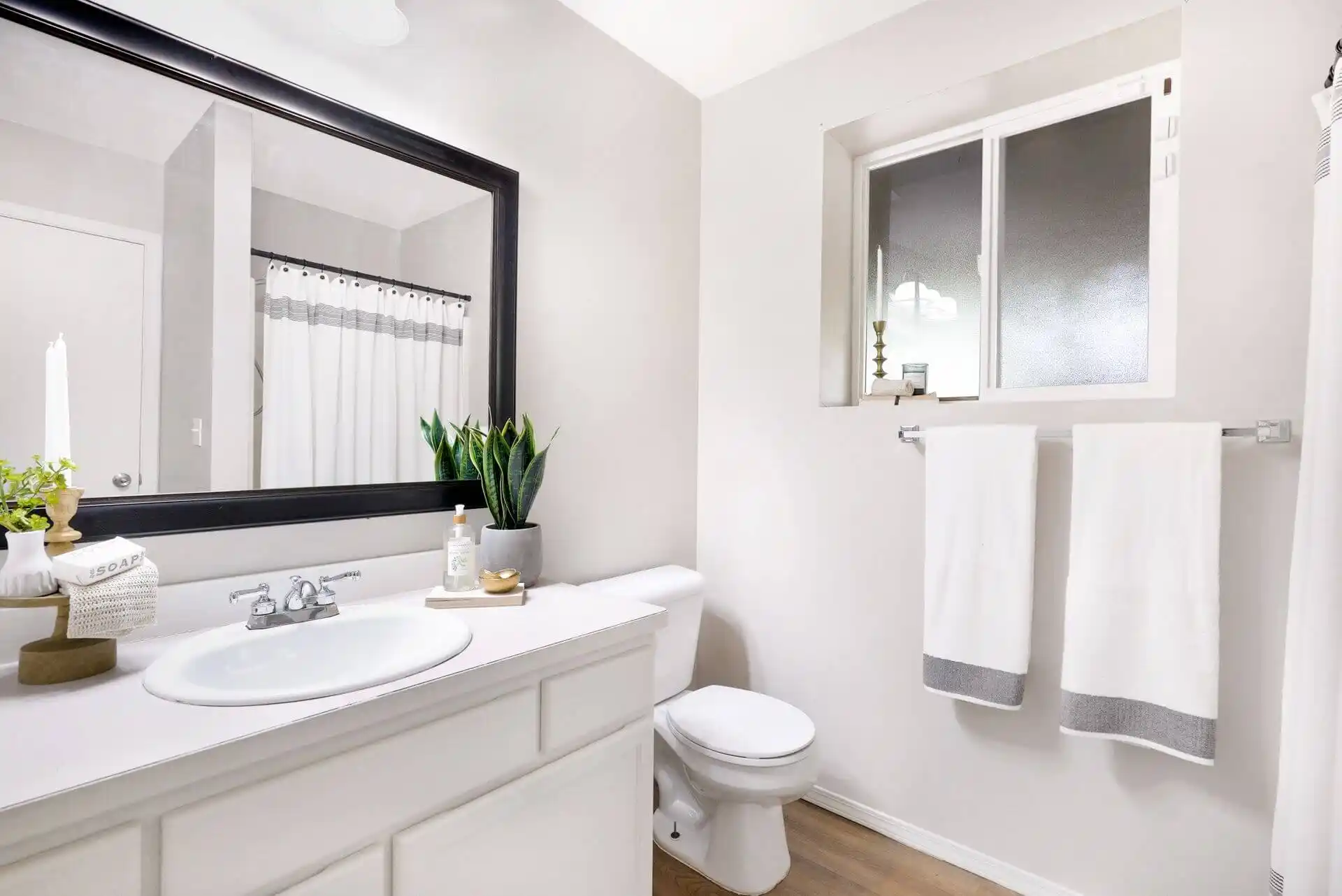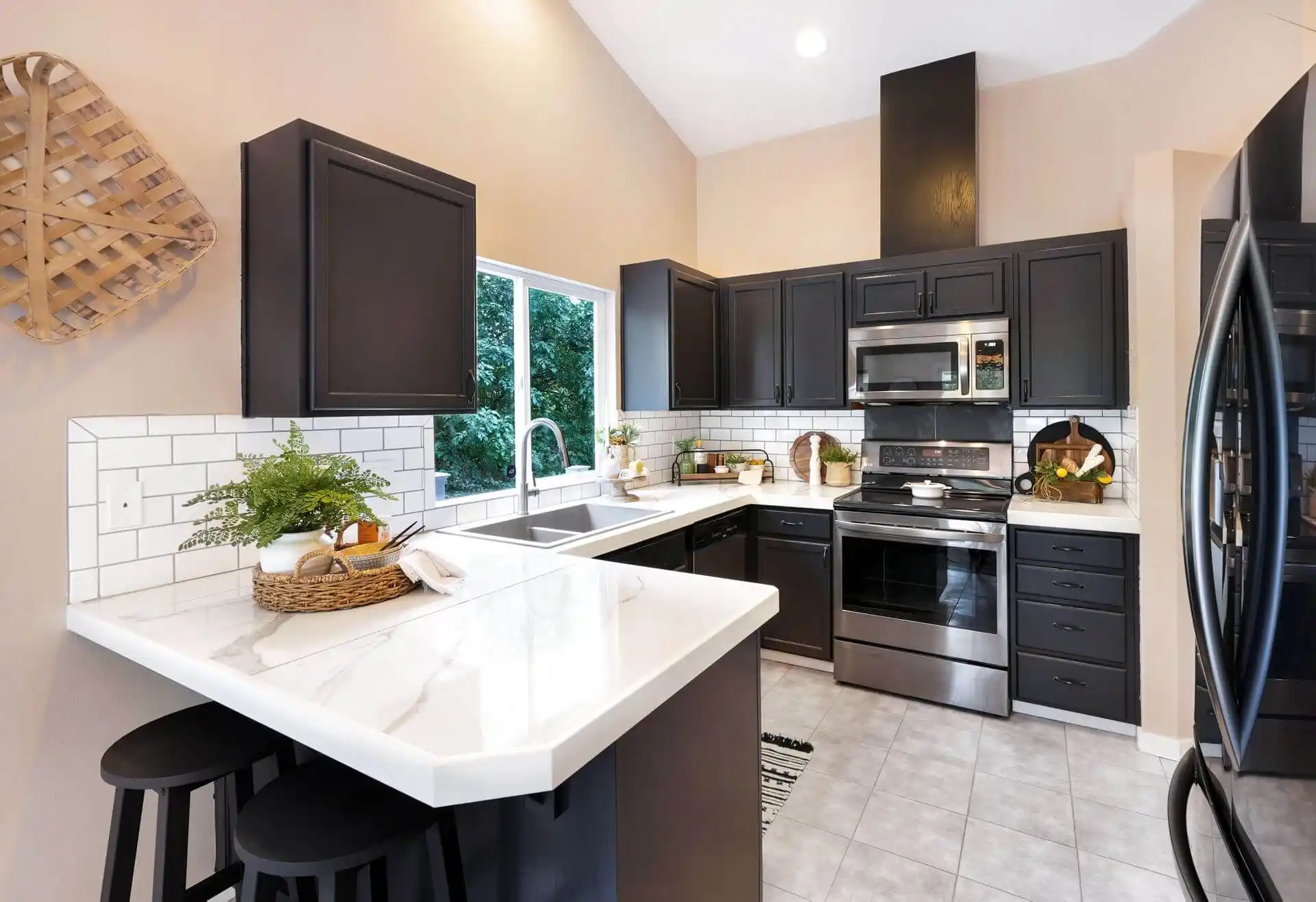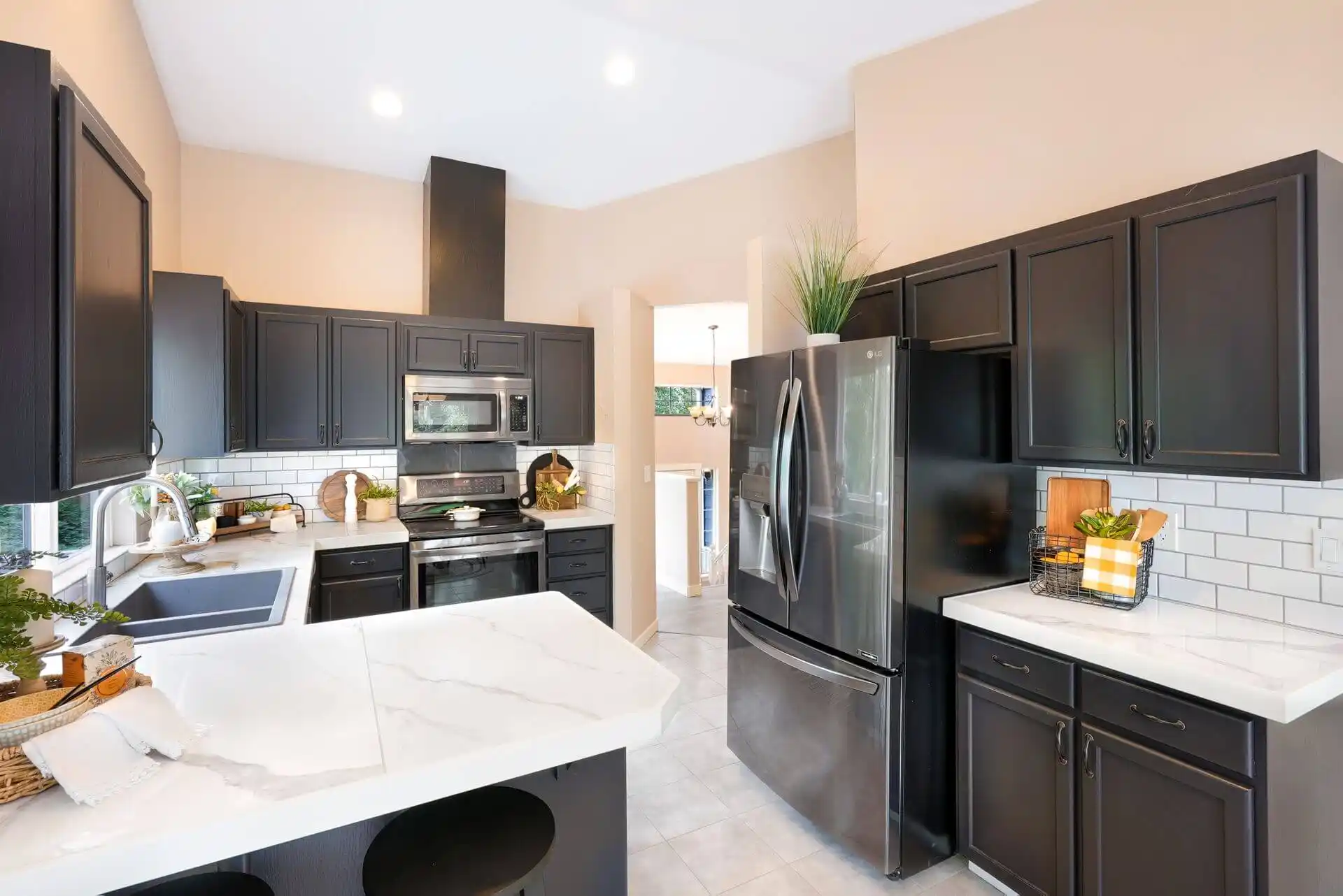 Updates that transformed this home include refreshing interior paint, contemporary fixtures, energy-efficient lighting, and new luxury vinyl plank flooring, including all three bedrooms upstairs. In the chef’s kitchen, you’ll find an LG black stainless steel appliance package, modern white countertops with marbling, and a high-end, durable graphite sink.