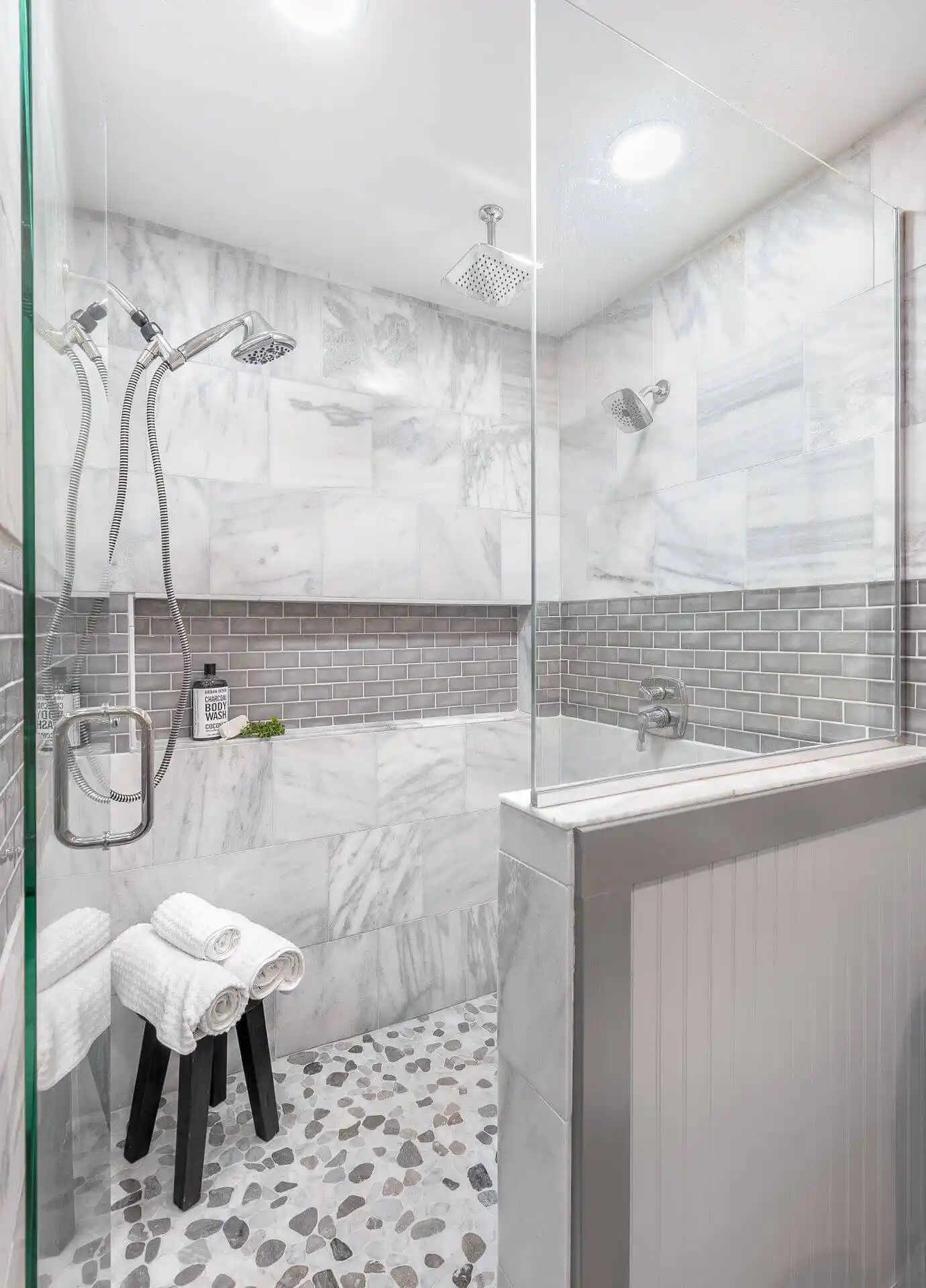 The custom ensuite in the spacious main bedroom features a luxurious dual, walk-in shower with a designer floor-to-ceiling marble surround, an overhead fan with built-in speakers & lighting, and a rain shower head.