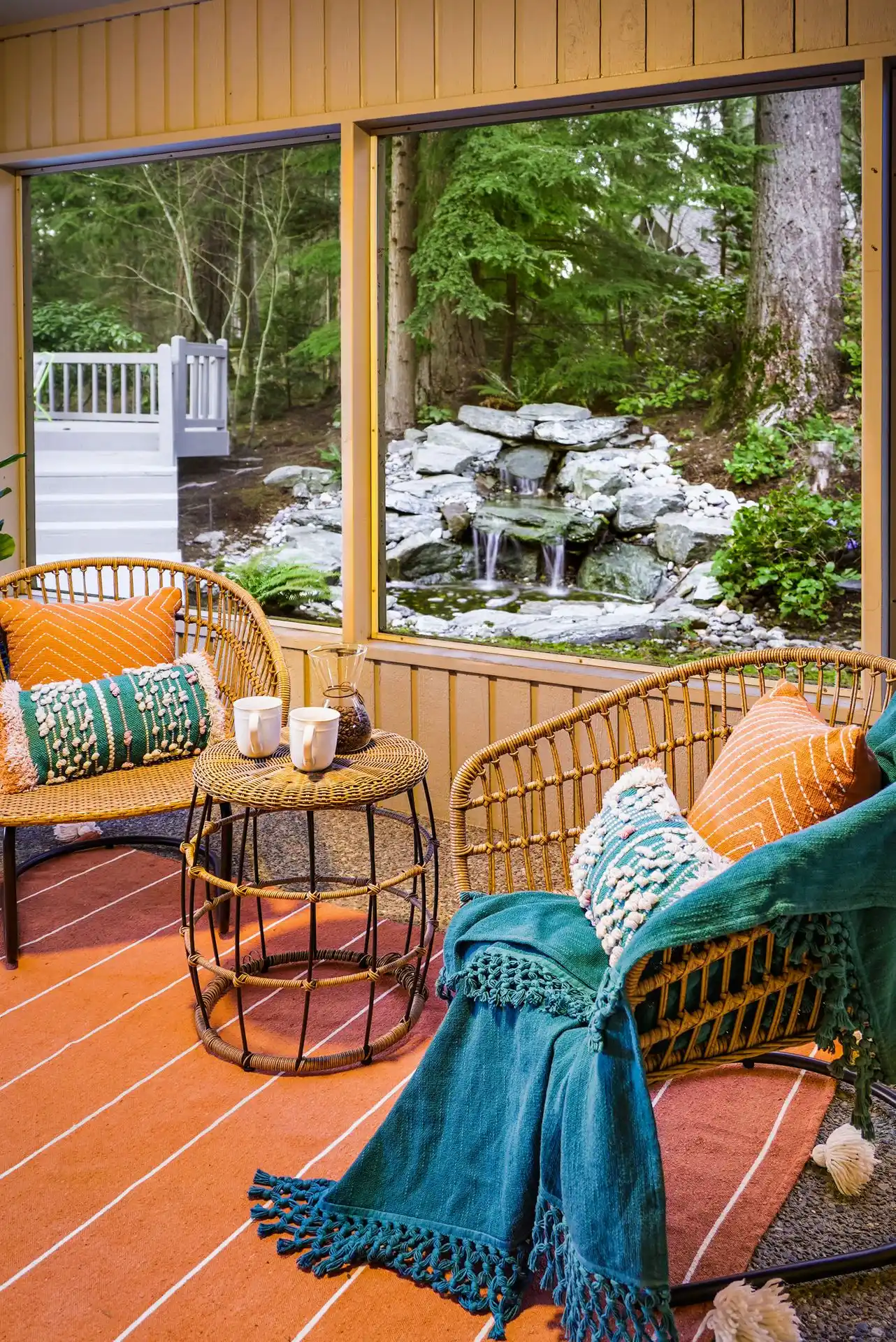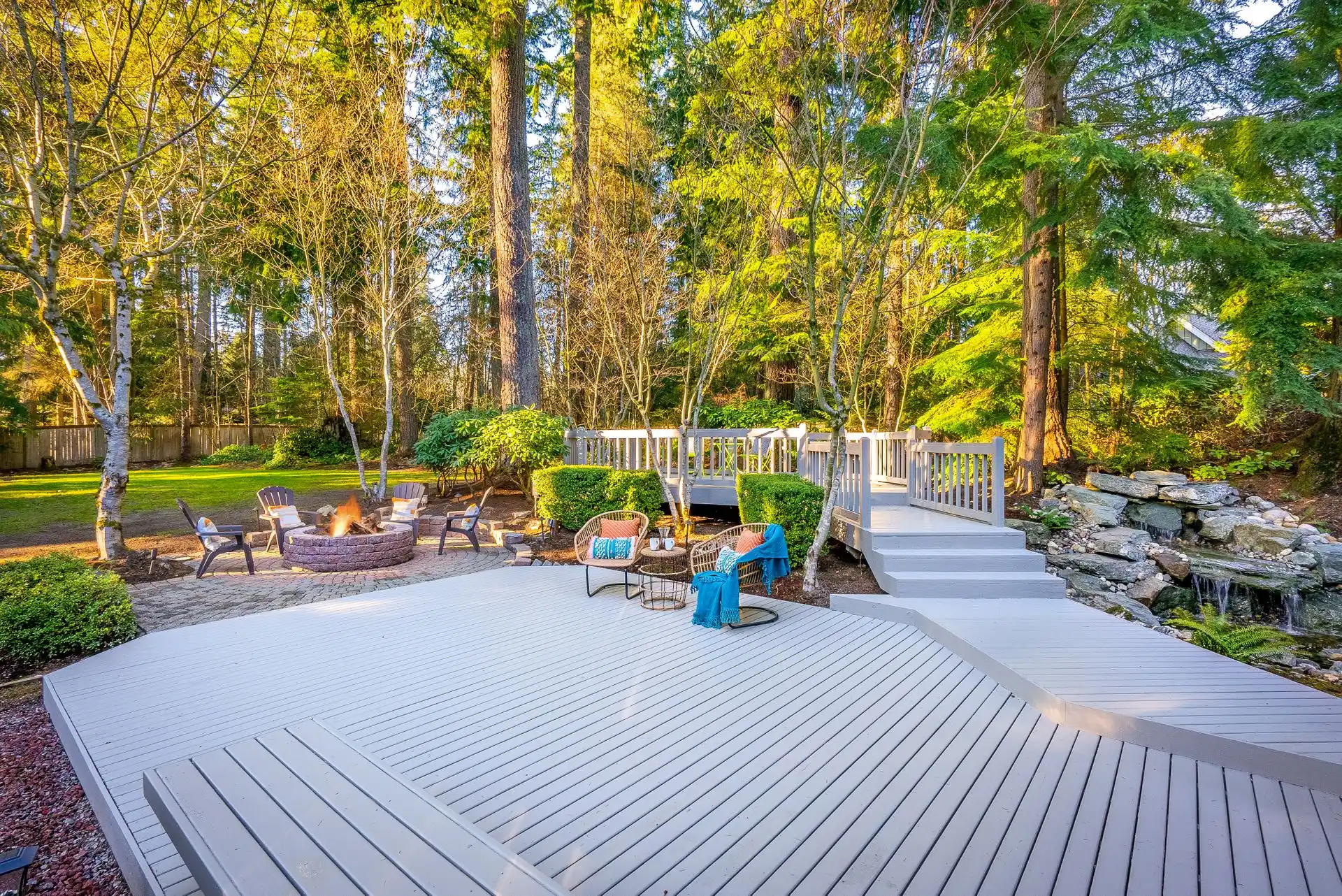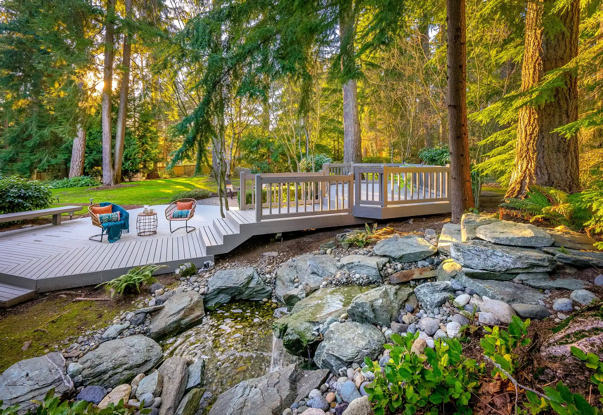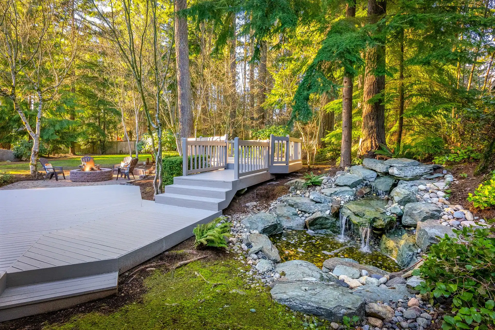 - Ideal Outdoor Living Space with Sprawling Deck, Firepit, Waterfall Feature & Fenced Garden Space
