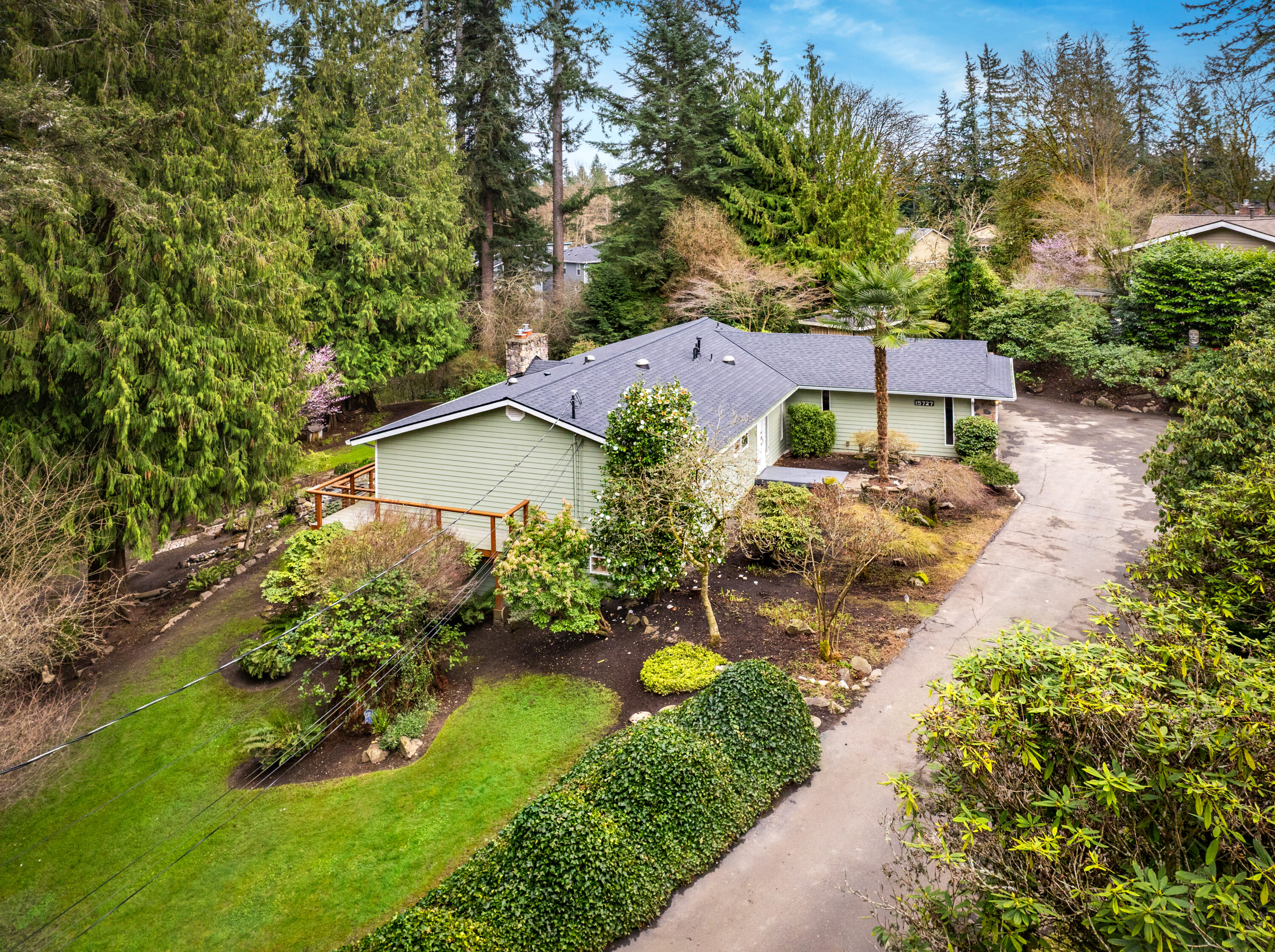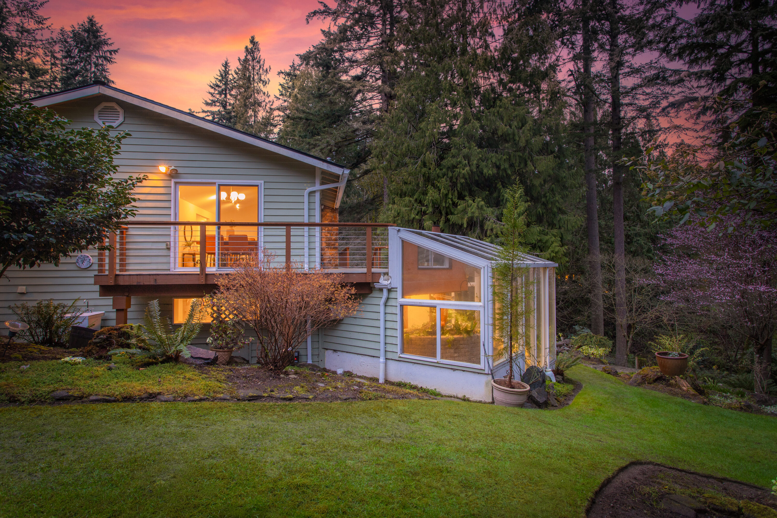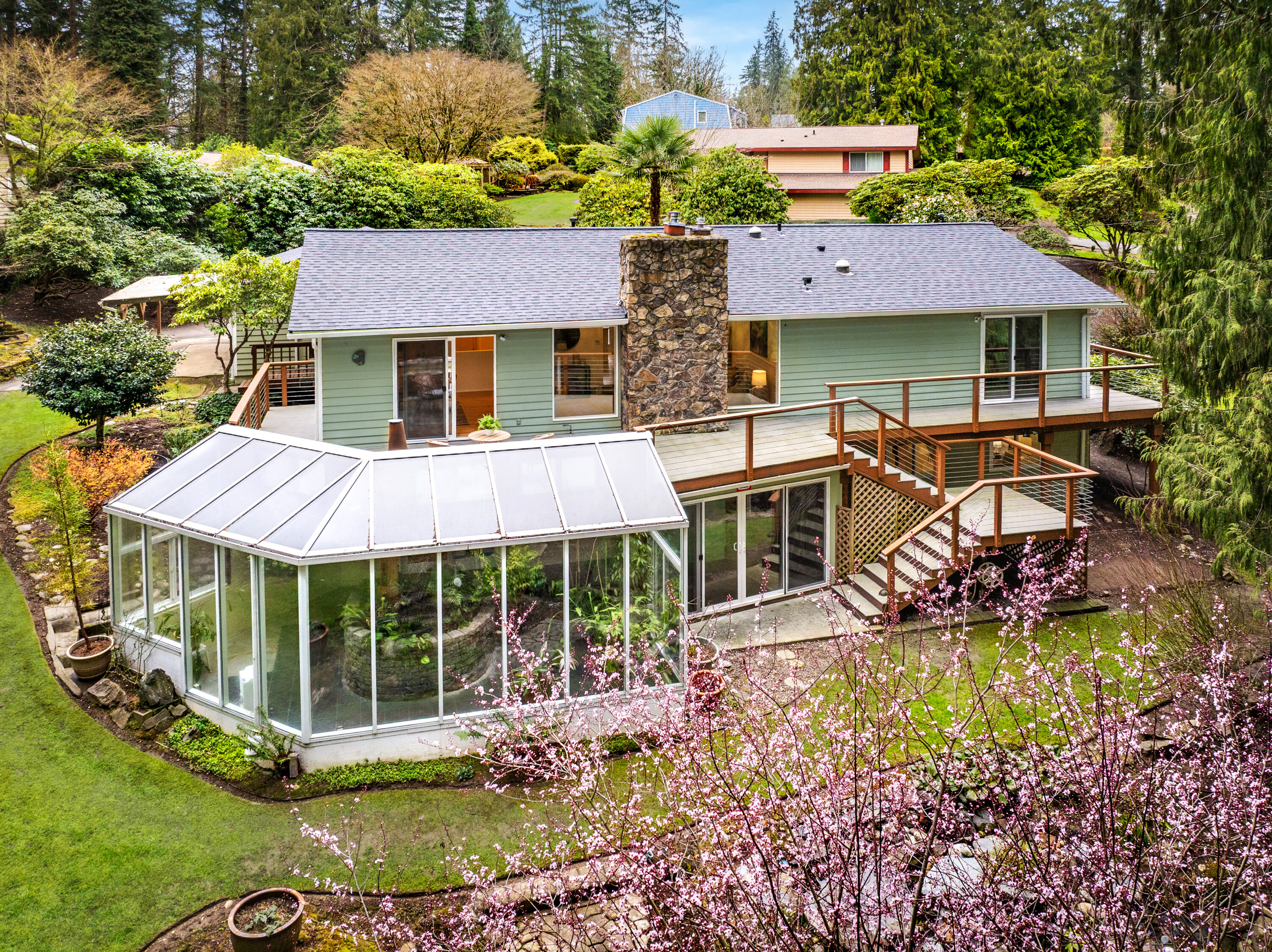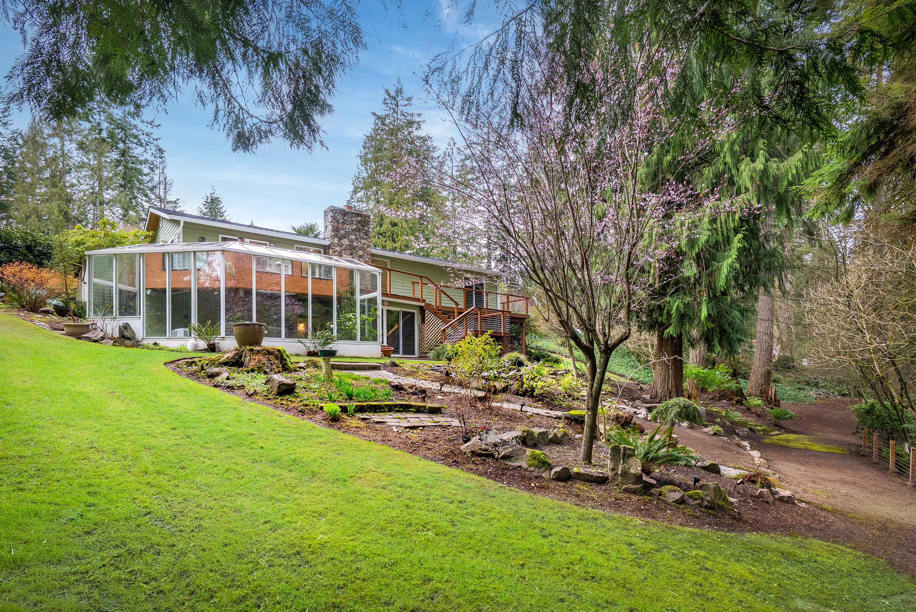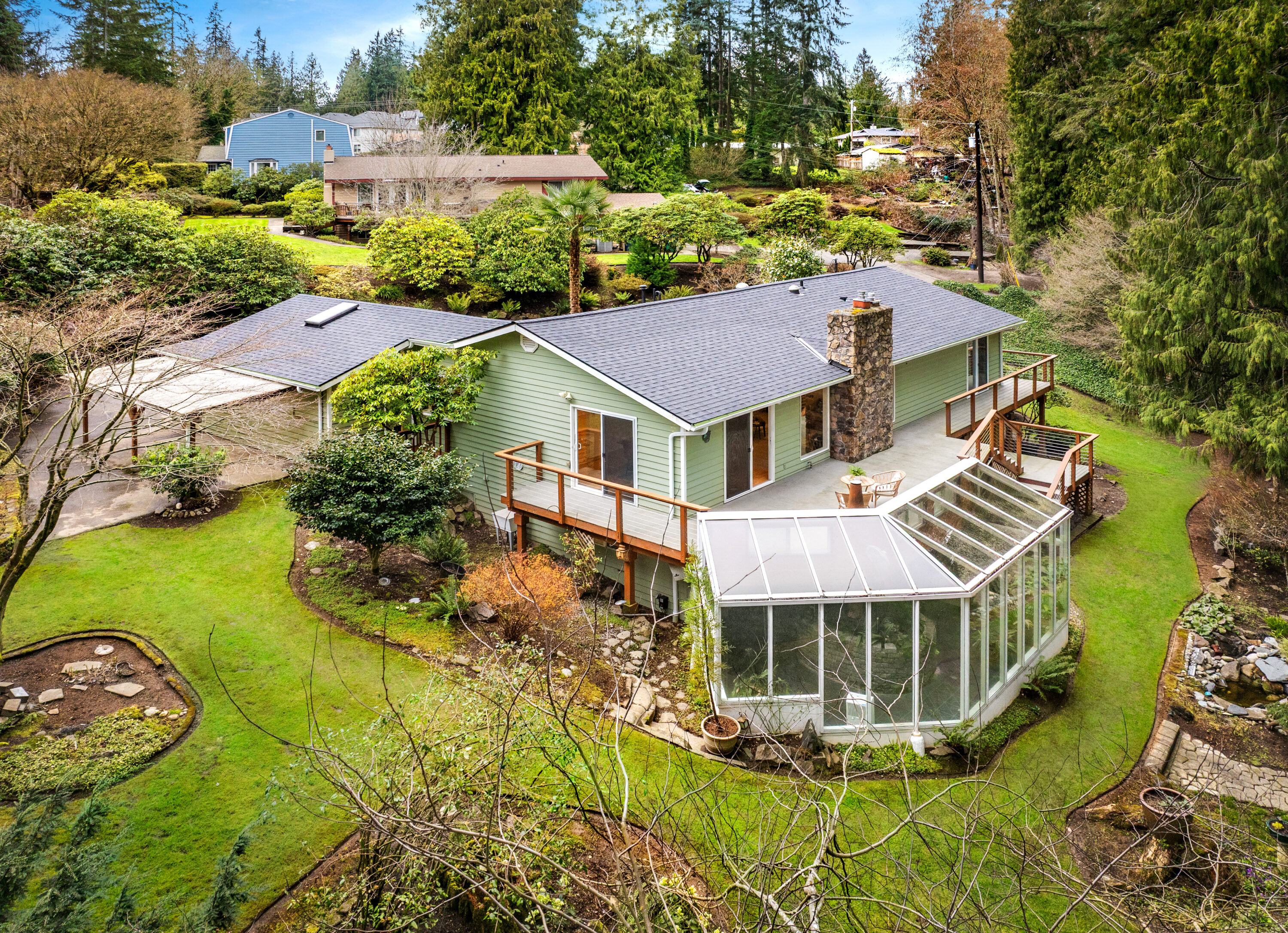 Tucked between Mill Creek Town Center and Martha Lake, this Bothell home offers the rare combination of privacy and convenience on just over an acre of park-like property without sacrificing daily necessities. The home sits down a long driveway surrounded by lush landscaping and towering trees that create a secluded setting. Inside, fresh interior paint, newly refinished oak hardwood floors, and new carpet guide you throughout. The kitchen offers ample storage and prep space for everyday cooking or entertaining, and the spacious dining room opens directly to the back deck for effortless summer hosting. Evenings will be spent relaxing in the living room, enjoying views of the property. The main-floor primary suite boasts private deck access, a sitting nook, generous closet space, and an ensuite bathroom. A secondary bedroom and nearby hall bath complete the main level. Downstairs, a large bonus room awaits with additional living space and a tranquil solarium, the perfect space to relax or nurture your green thumb. You will also find two additional bedrooms, a full bathroom, a laundry room, and oversized storage for easy organization. Outside, the property continues to impress with a garden shed, multiple park-like areas for outdoor living, and simply enjoying the beauty of the PNW.