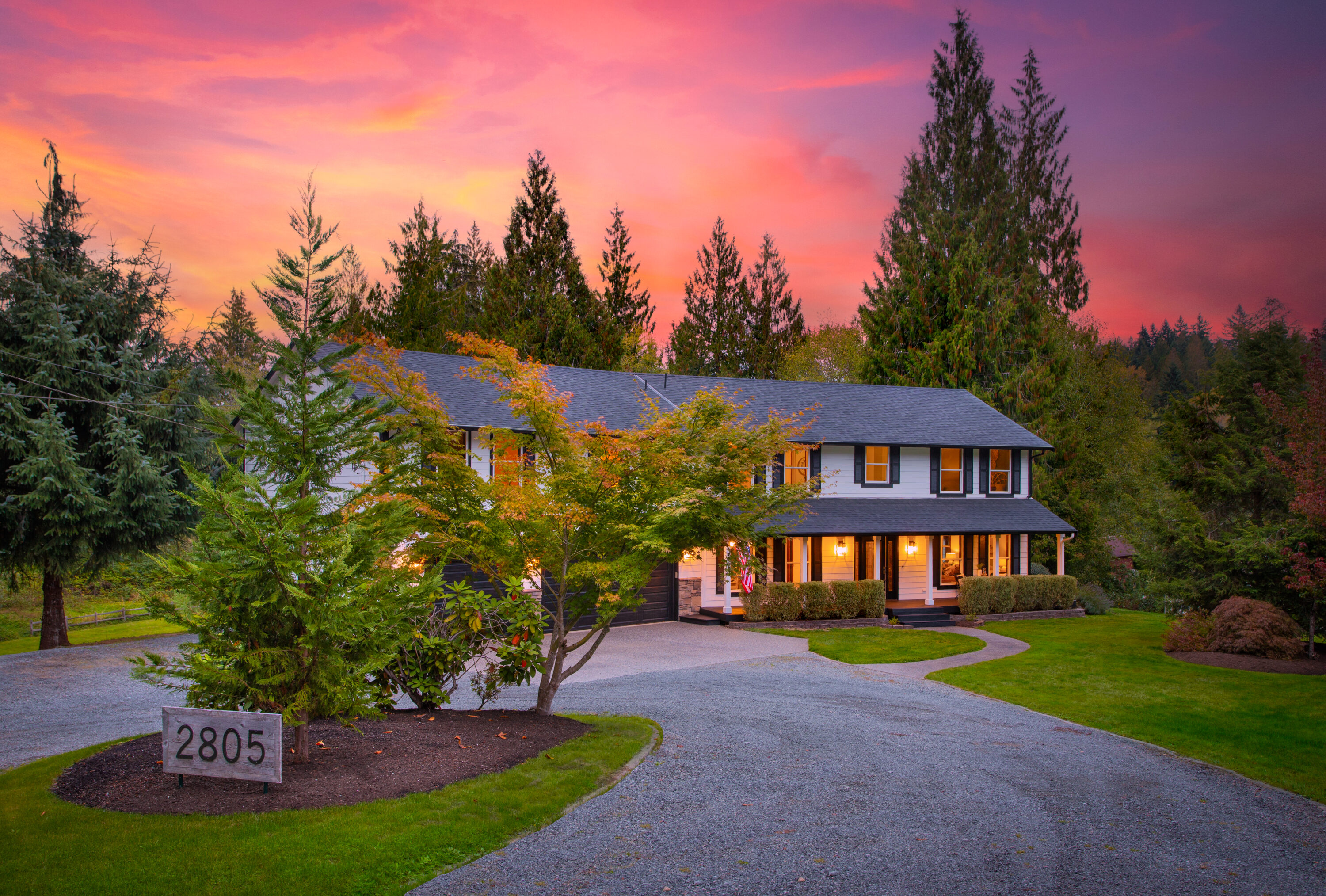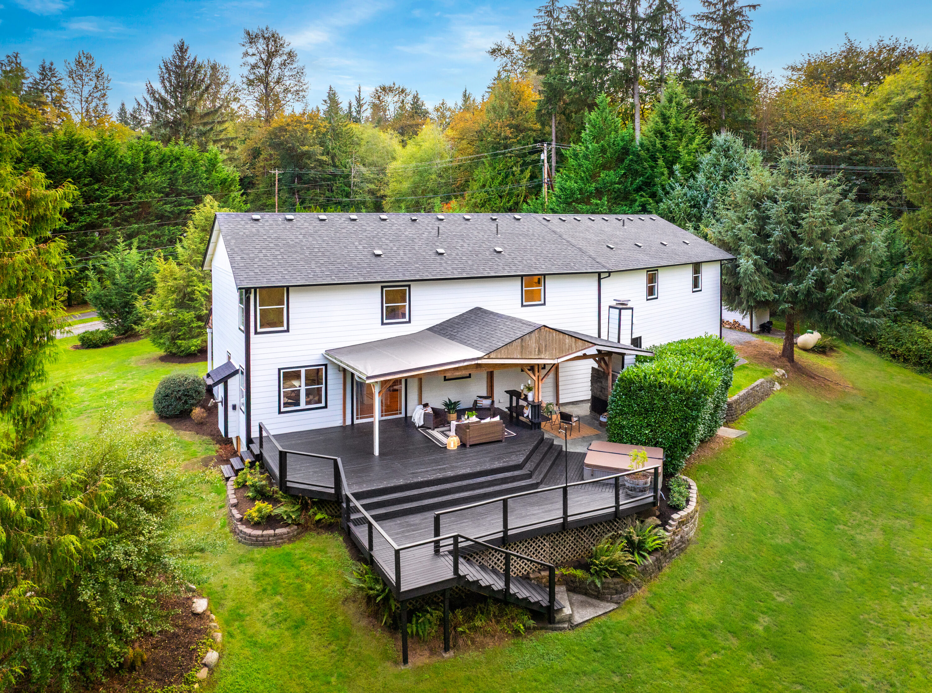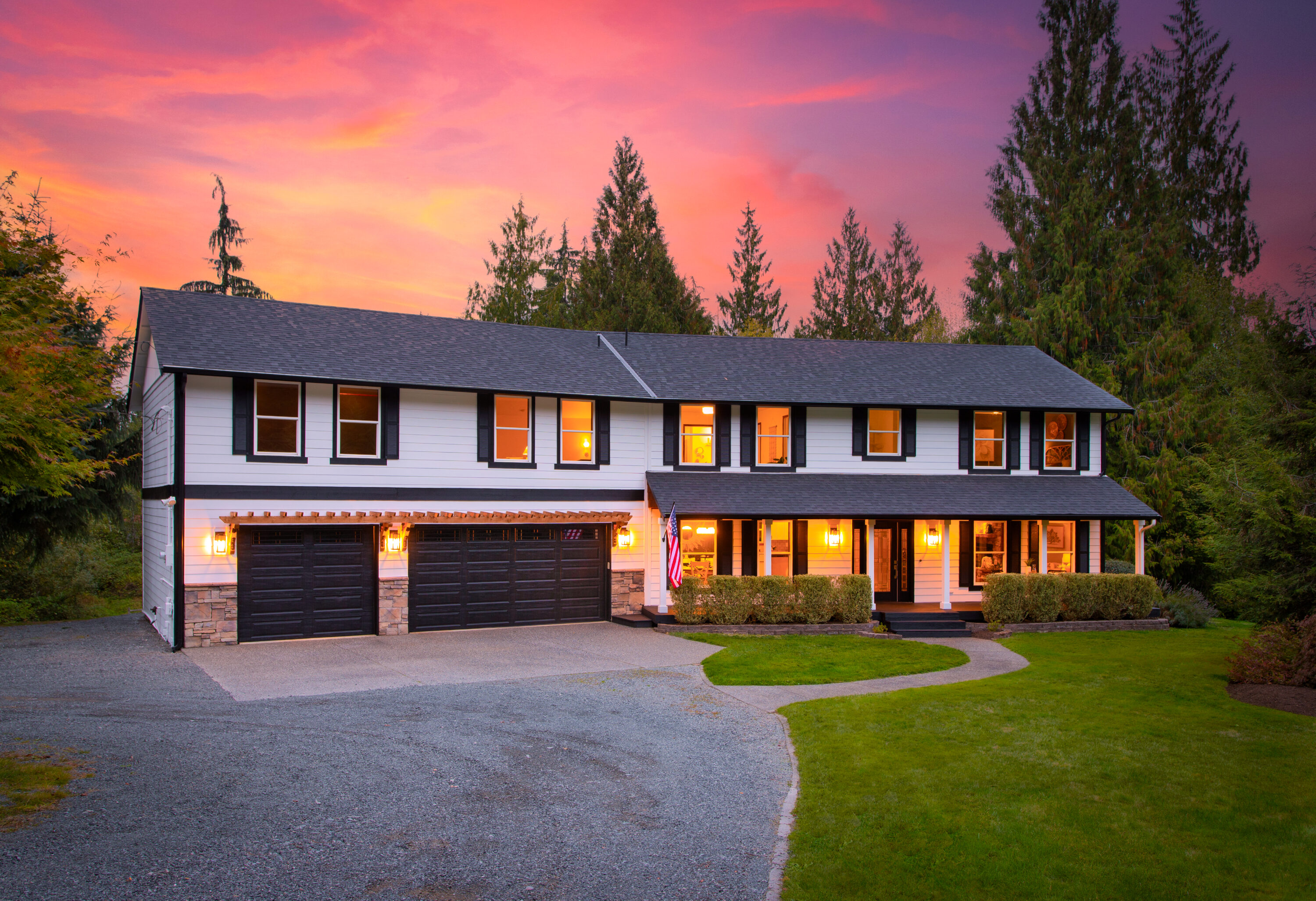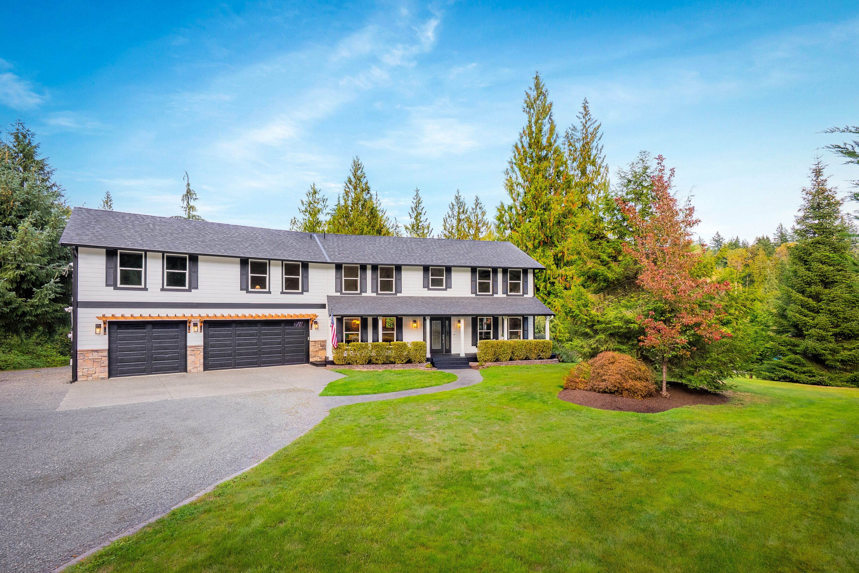 Tucked away near Lake Bosworth, this stunning Snohomish retreat offers the perfect balance of privacy, nature, and convenience. Surrounded by lush Pacific Northwest greenery, lakes, and scenic trails, you’ll enjoy a serene lifestyle with easy access to Snohomish, Lake Stevens, and Granite Falls. Fresh exterior paint and a new roof create a bright, welcoming first impression, while inside, durable LVP flooring guides you through light-filled living spaces designed for everyday comfort and style. The living room seamlessly connects to a casual dining area anchored by a cozy fireplace, while the kitchen is a chef’s dream, featuring gleaming stamped concrete countertops, stainless steel appliances, a spacious pantry, and a peninsula with bar seating. A moody formal dining room sets the scene for intimate dinners and festive gatherings alike. Step outside to the expansive back deck with both covered and open-air space for year-round enjoyment, complete with an outdoor fireplace and soothing hot tub, all set against nearly two acres of peaceful surroundings. Upstairs, the oversized primary suite offers a private retreat with a chic ensuite featuring a soaking tub, walk-in shower, and generous closet. Three additional bedrooms and a stylish hall bath provide space for everyone, while above the three-car garage, an oversized bonus room with a private room and ¾ bath opens endless possibilities for multigenerational living, a secluded guest suite, or a home office. With thoughtful updates including a new roof, plus ample space for a future shop or RV parking, this property truly blends comfort, versatility, and the best of Pacific Northwest living.