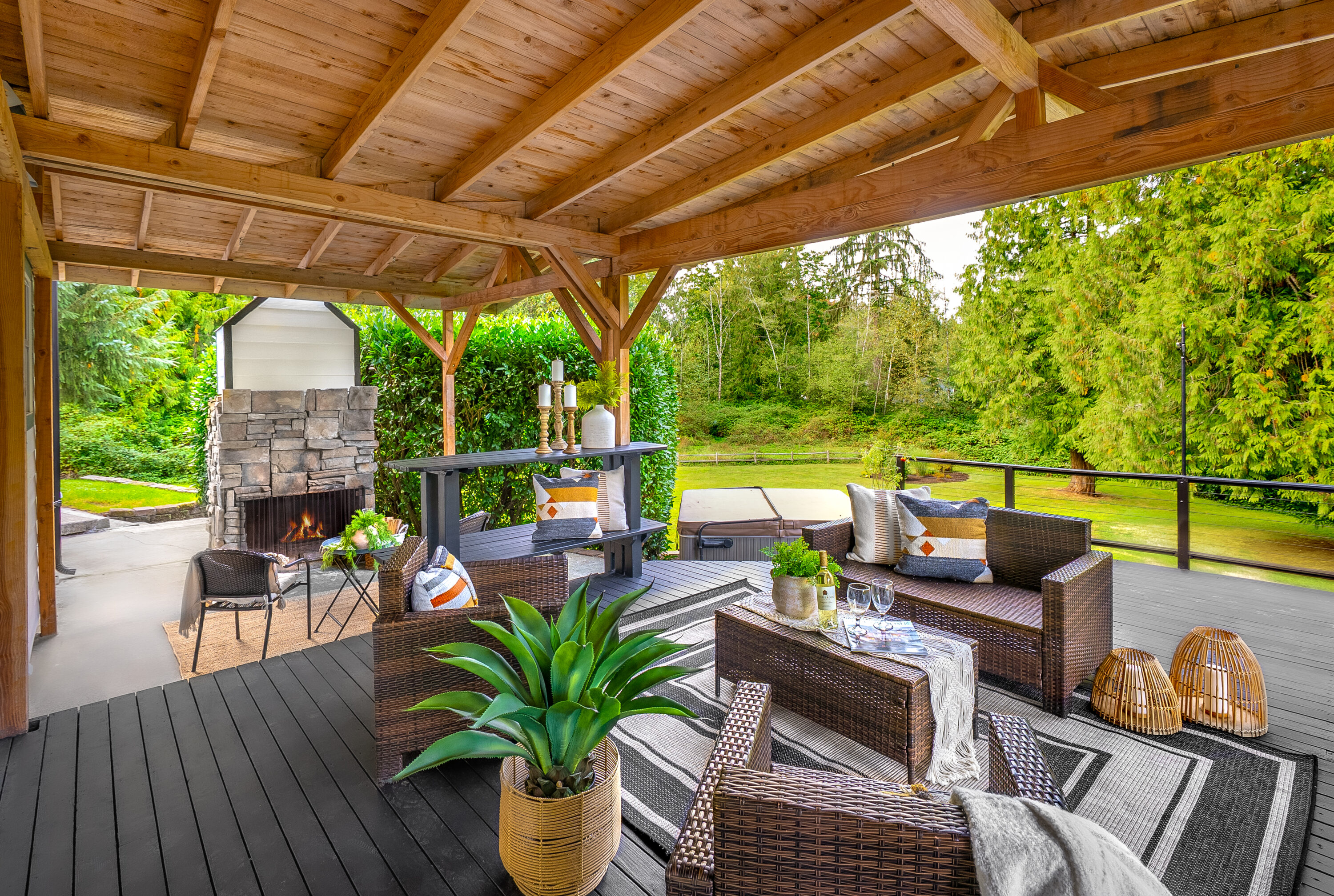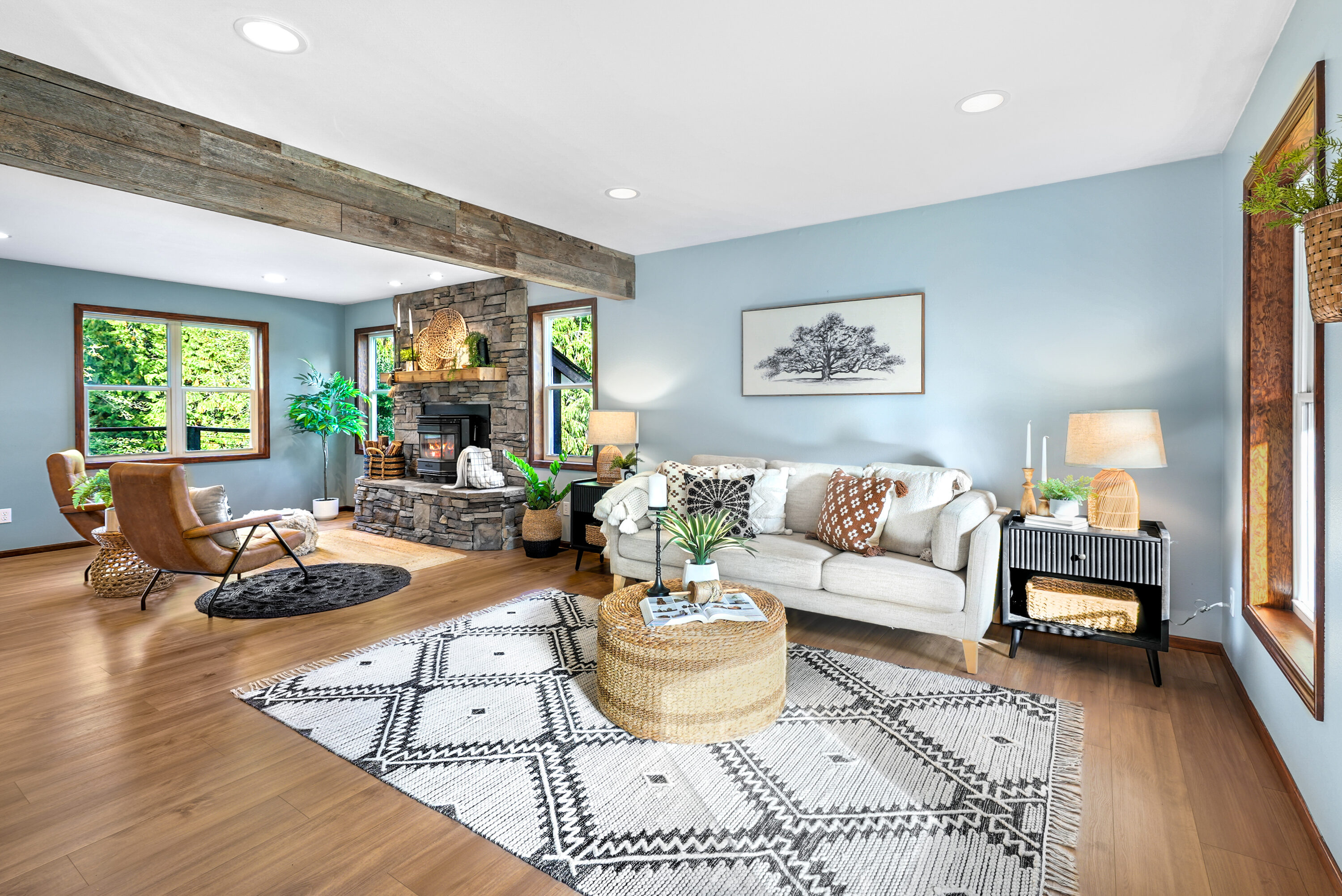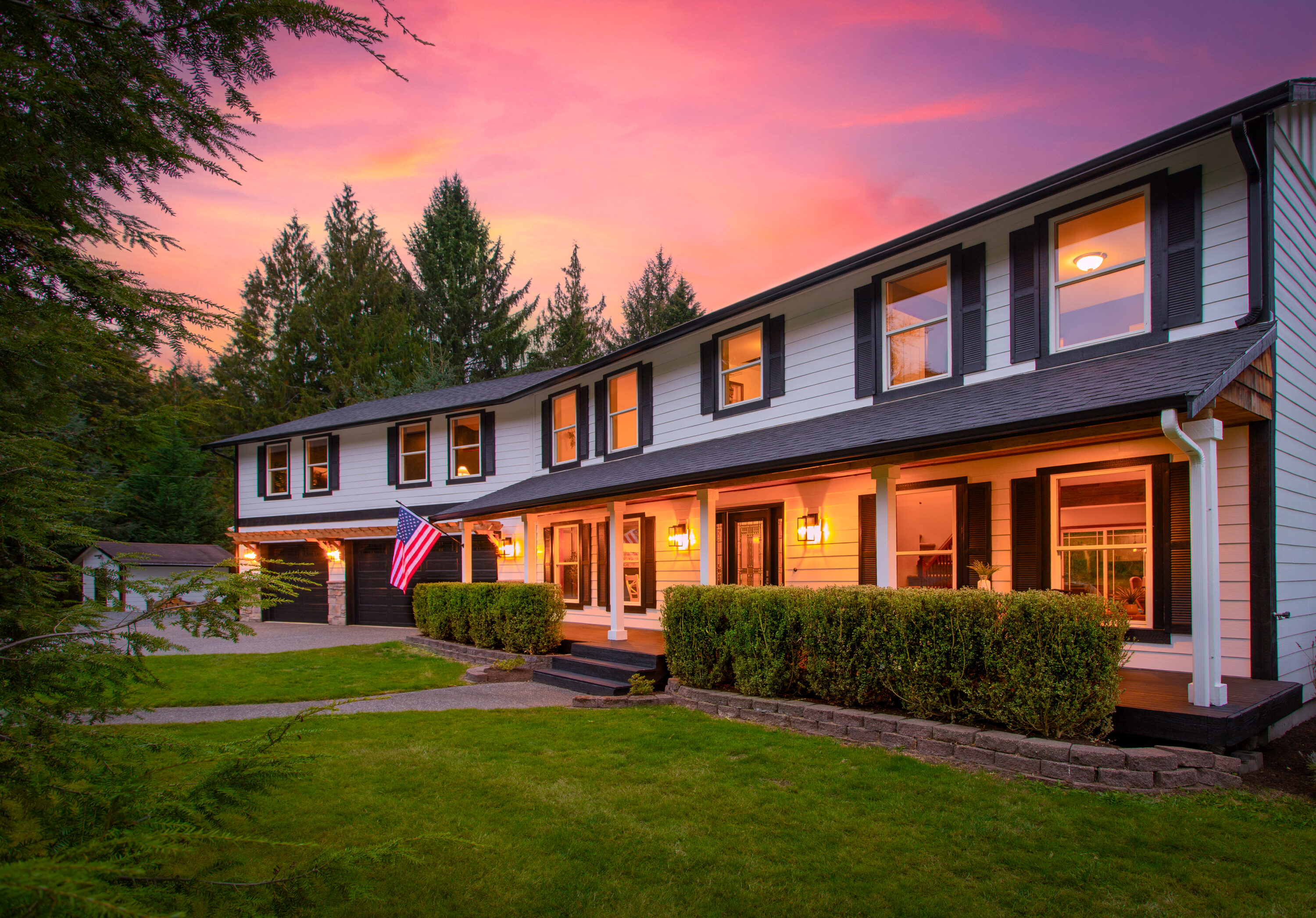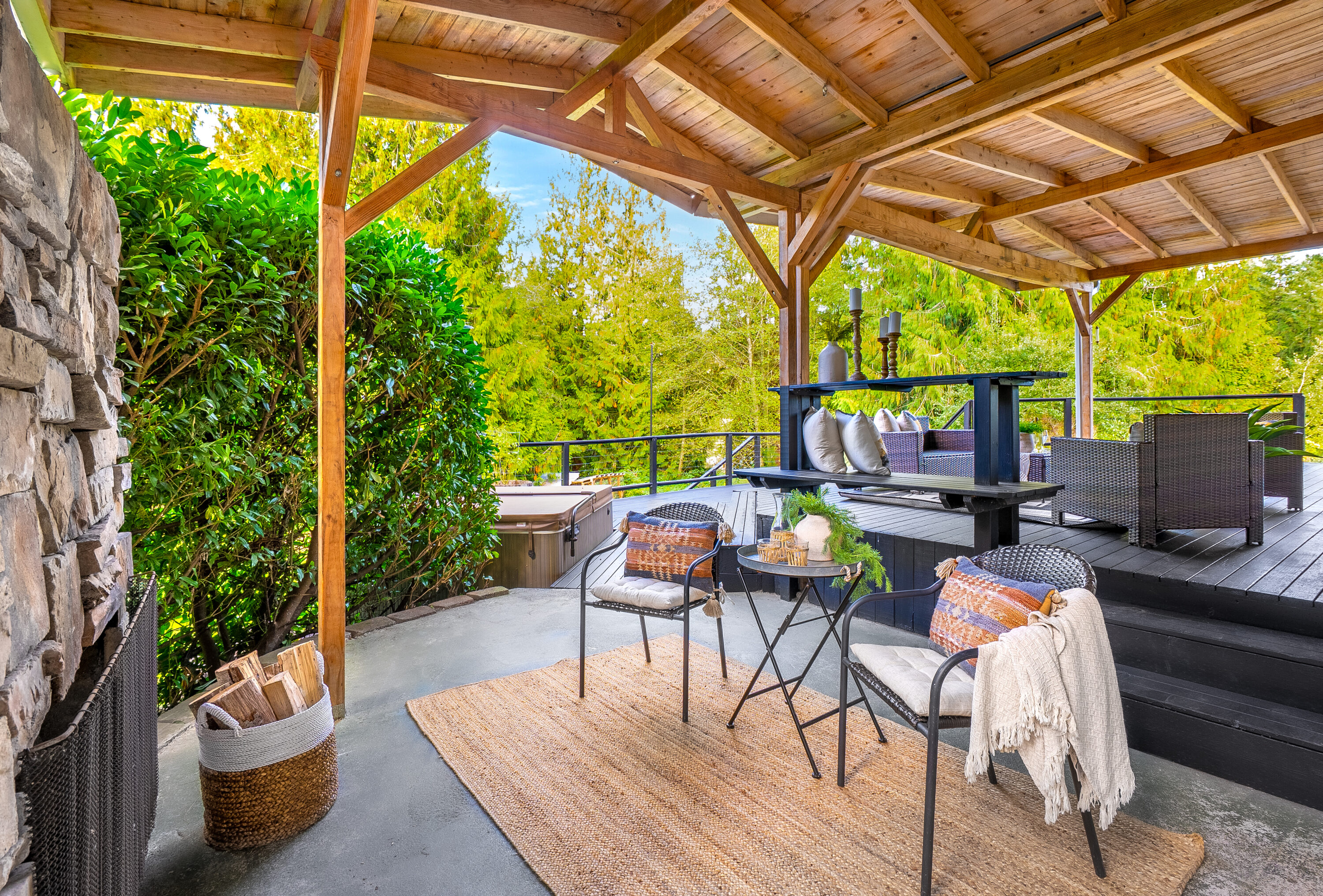 Tucked away near Lake Bosworth, this stunning Snohomish retreat offers the perfect balance of privacy, nature, and convenience. Surrounded by lush Pacific Northwest greenery, lakes, and scenic trails, you’ll enjoy a serene lifestyle with easy access to Snohomish, Lake Stevens, and Granite Falls. Fresh exterior paint and a new roof create a bright, welcoming first impression, while inside, durable LVP flooring guides you through light-filled living spaces designed for everyday comfort and style. The living room seamlessly connects to a casual dining area anchored by a cozy fireplace, while the kitchen is a chef’s dream, featuring gleaming stamped concrete countertops, stainless steel appliances, a spacious pantry, and a peninsula with bar seating. A moody formal dining room sets the scene for intimate dinners and festive gatherings alike. Step outside to the expansive back deck with both covered and open-air space for year-round enjoyment, complete with an outdoor fireplace and soothing hot tub, all set against nearly two acres of peaceful surroundings. Upstairs, the oversized primary suite offers a private retreat with a chic ensuite featuring a soaking tub, walk-in shower, and generous closet. Three additional bedrooms and a stylish hall bath provide space for everyone, while above the three-car garage, an oversized bonus room with a private room and ¾ bath opens endless possibilities for multigenerational living, a secluded guest suite, or a home office. With thoughtful updates including a new roof, plus ample space for a future shop or RV parking, this property truly blends comfort, versatility, and the best of Pacific Northwest living.
