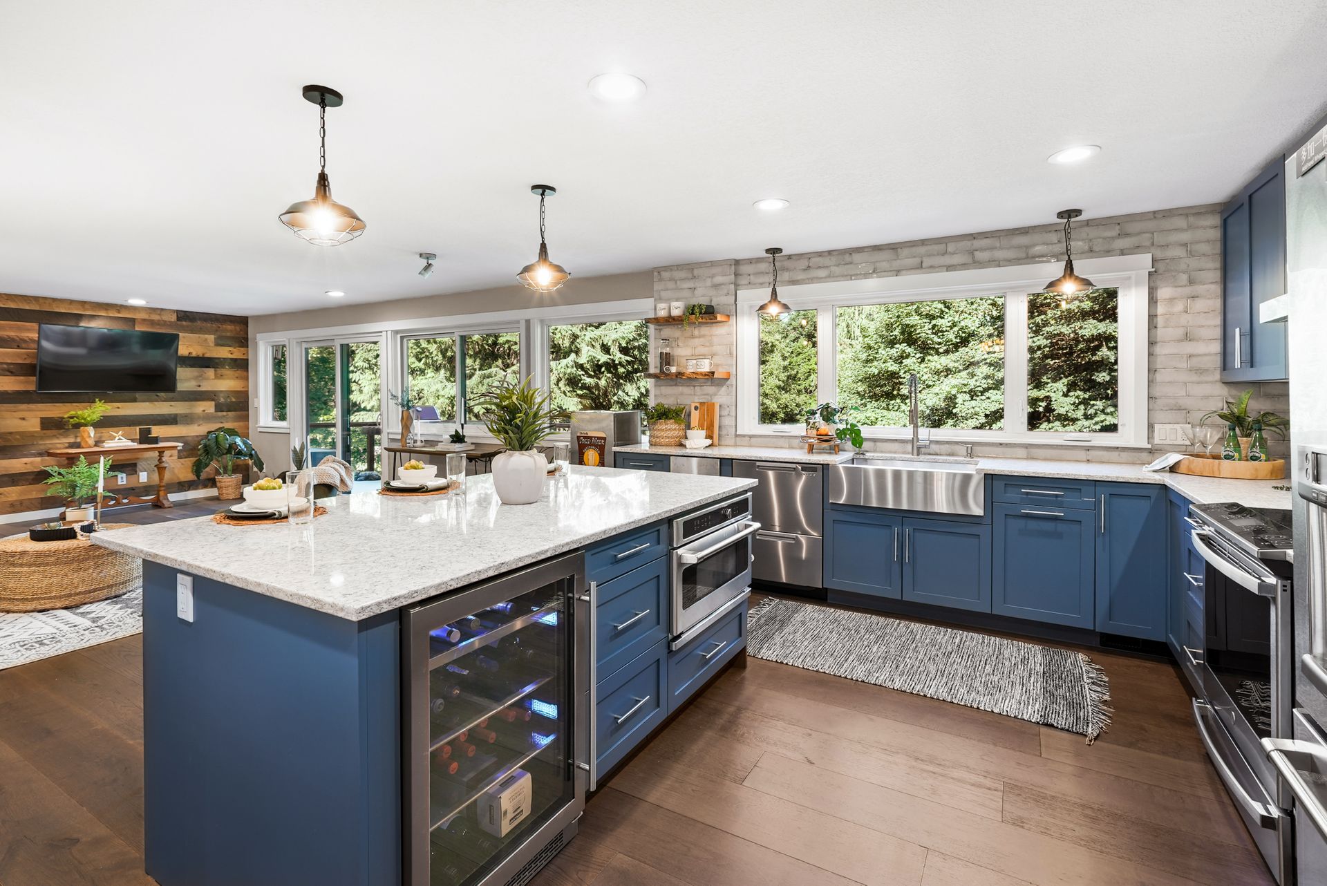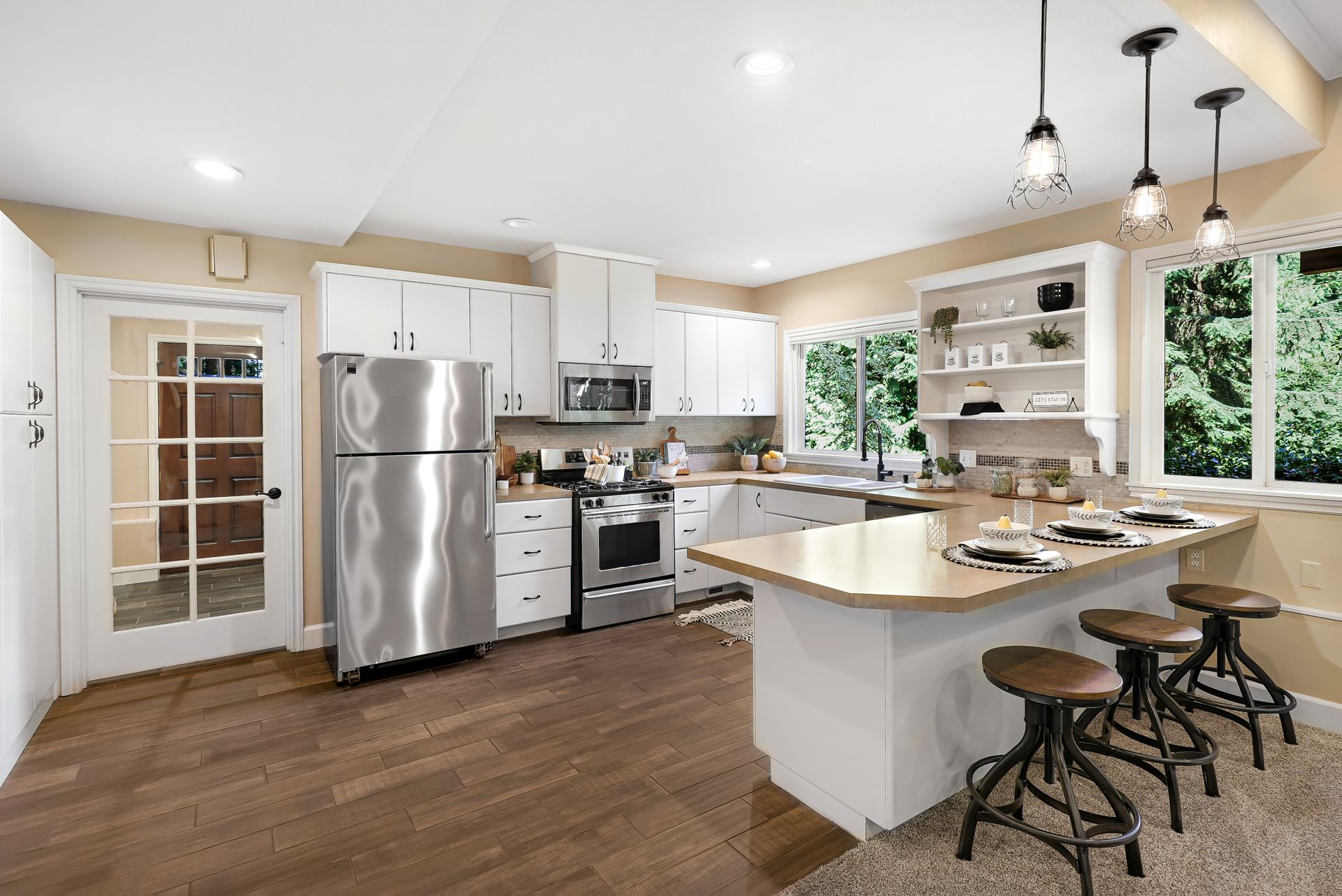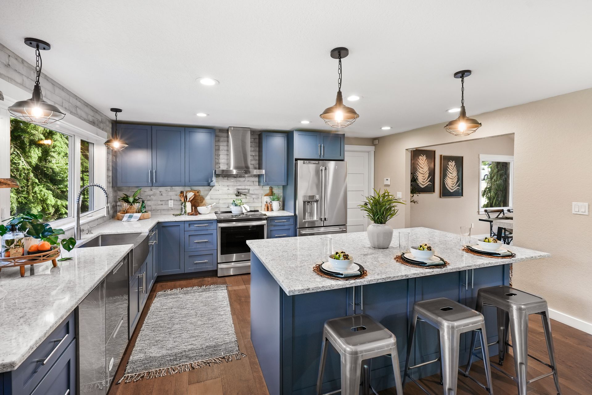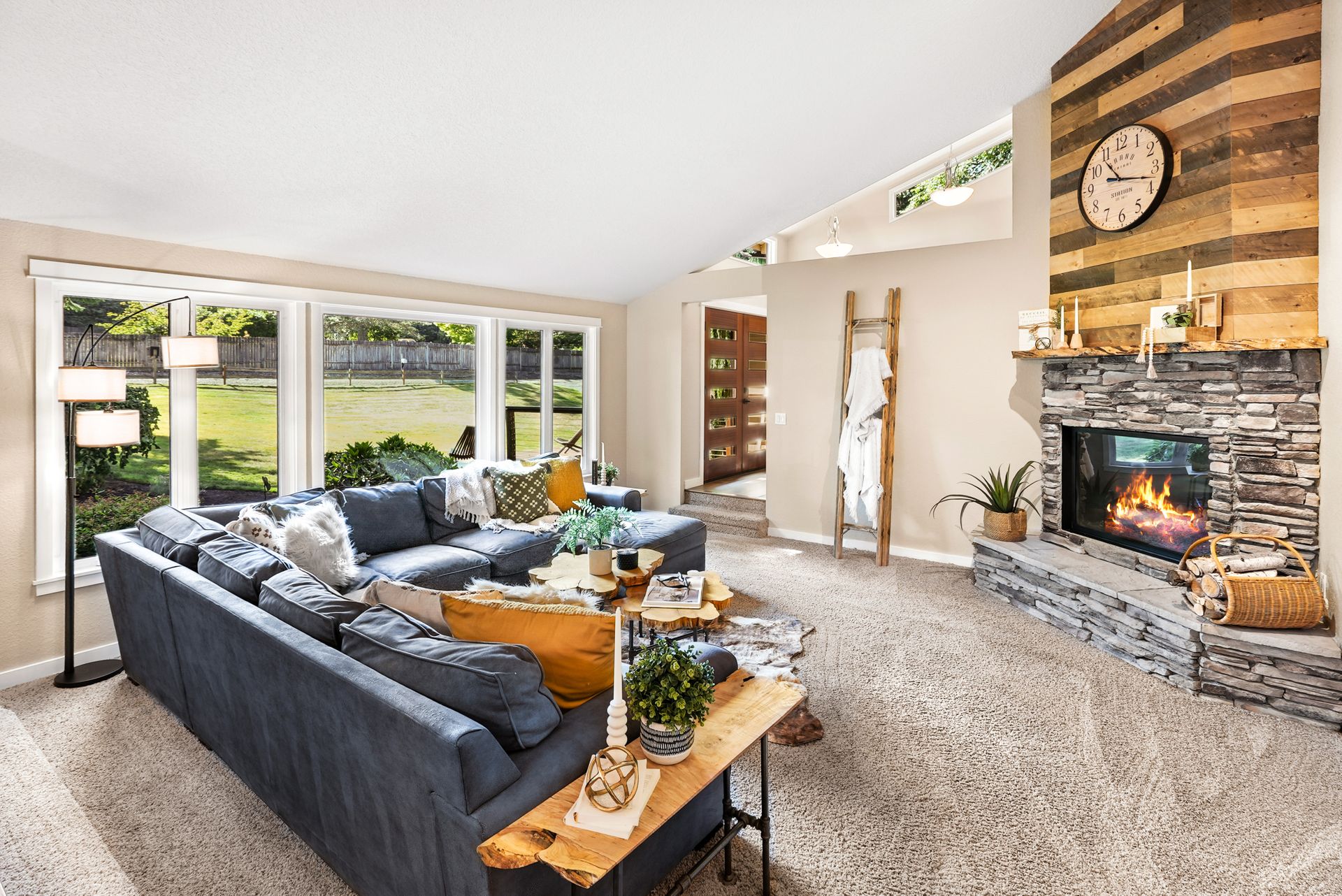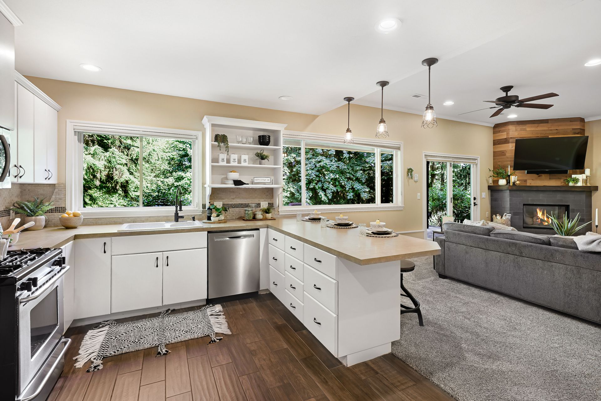 The sunny front deck invites you inside to find new engineered hardwoods that flow throughout the main living spaces. The formal living and dining rooms, complete with vaulted ceilings and a cozy fireplace, offer the ideal setting for lively gatherings. A fully remodeled kitchen impresses with chic cabinetry, a counter-to-ceiling backsplash, stainless steel appliances, and a large center island. Just off the kitchen, a spacious mudroom features a walk-in pantry, built-in storage, and a workstation that keeps your day-to-day running smoothly.