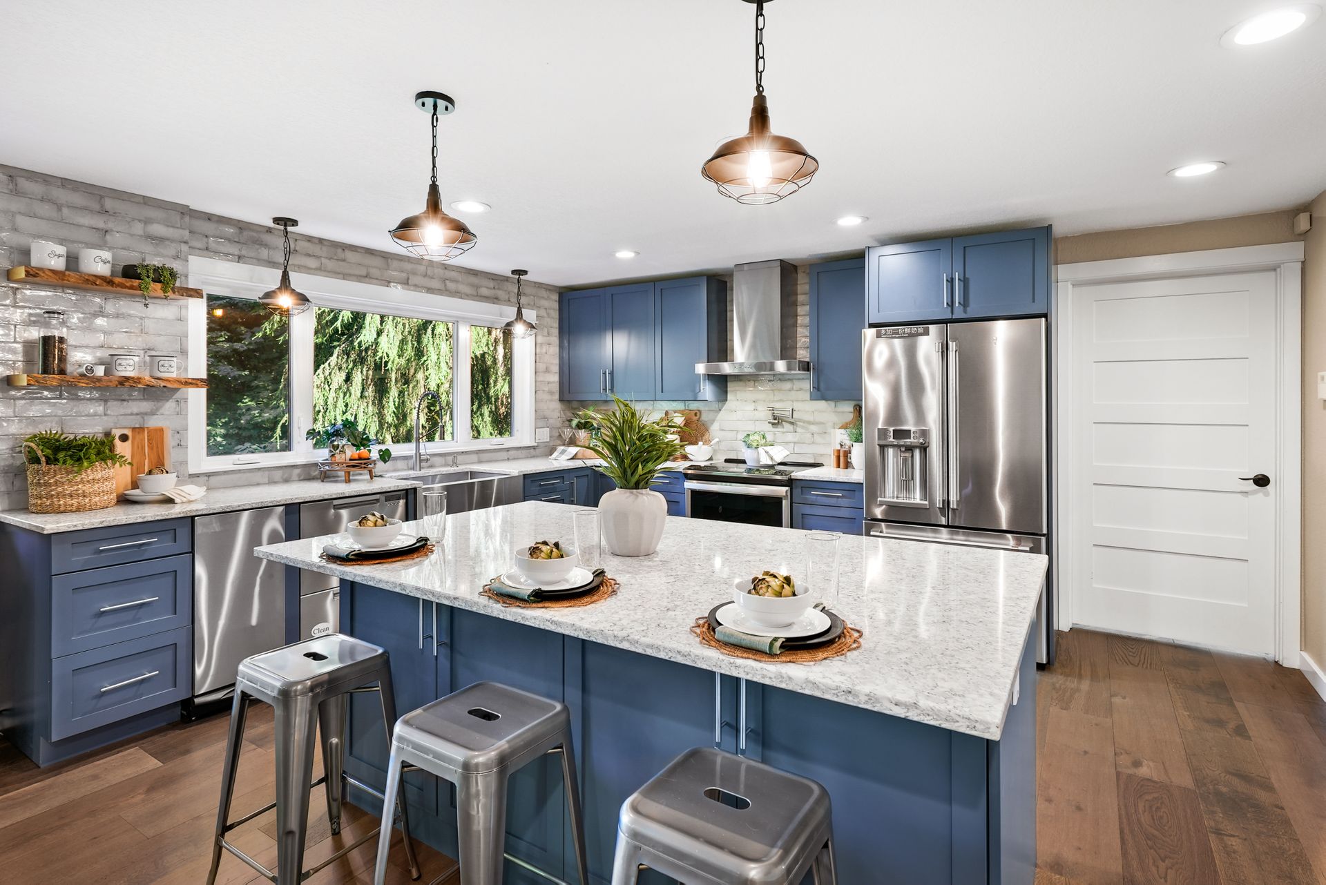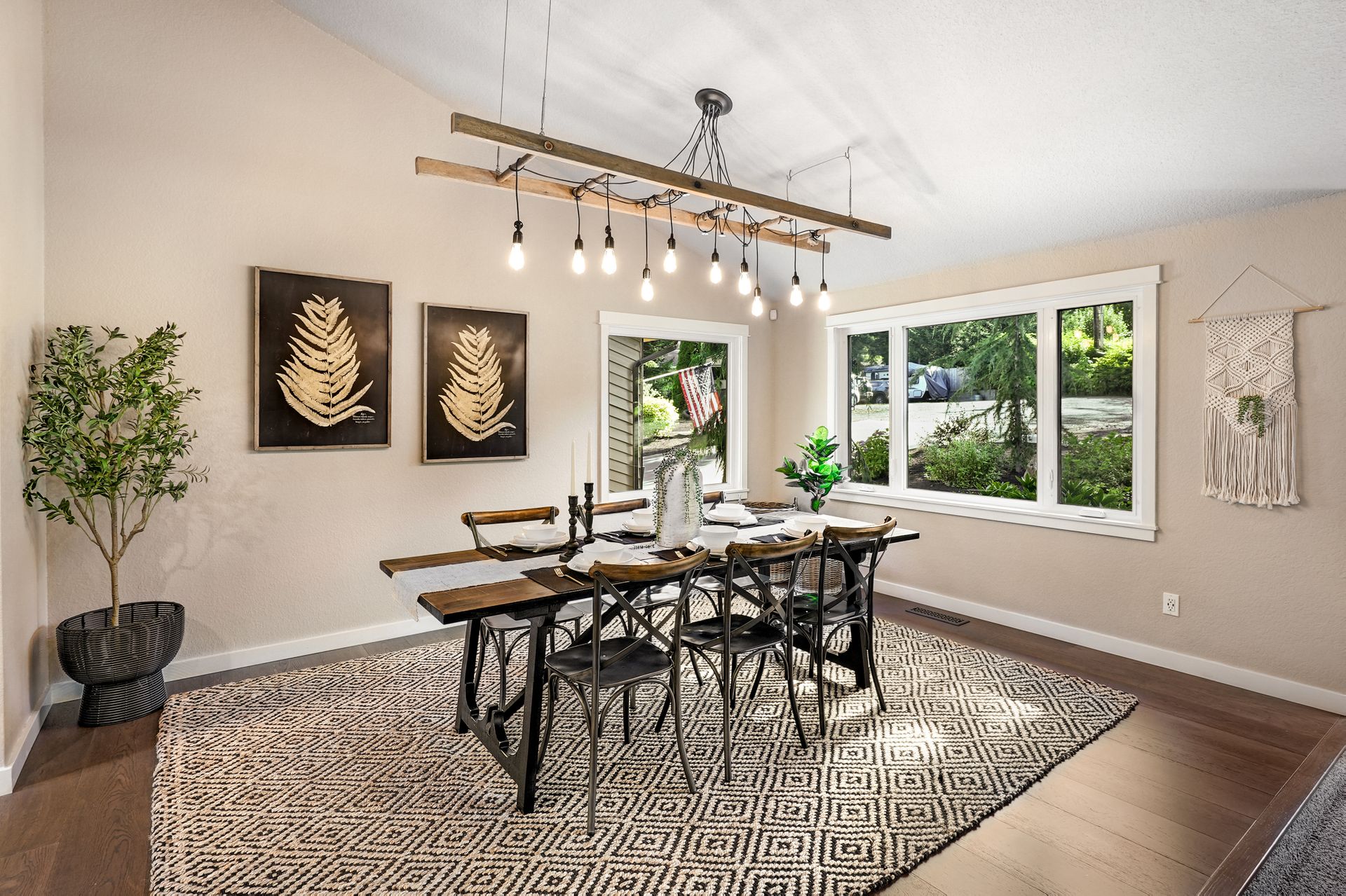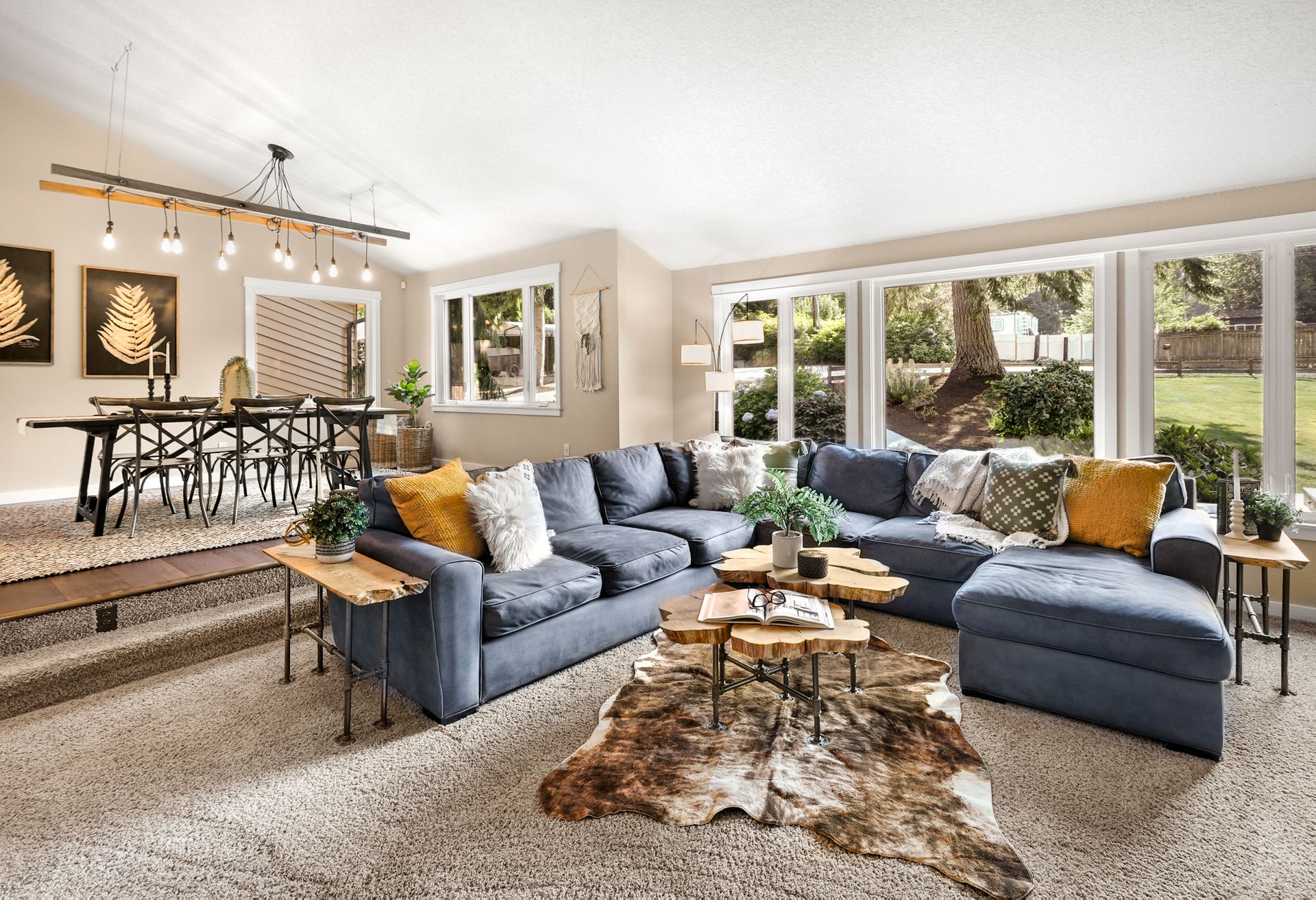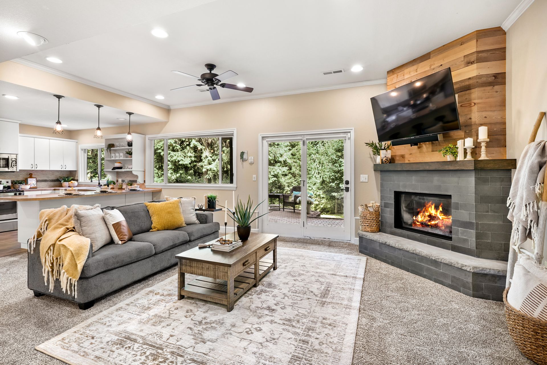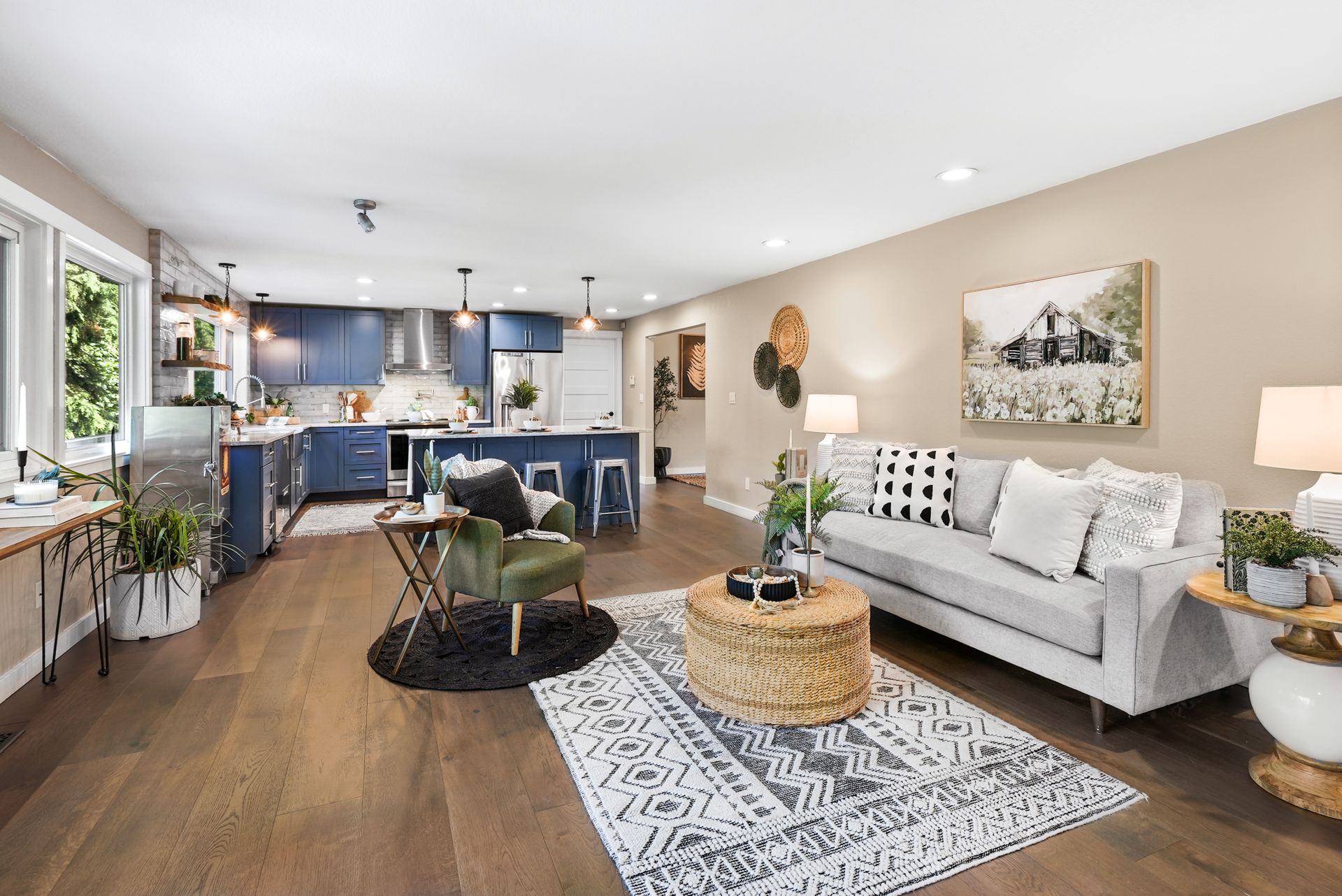 The sunny front deck invites you inside to find new engineered hardwoods that flow throughout the main living spaces. The formal living and dining rooms, complete with vaulted ceilings and a cozy fireplace, offer the ideal setting for lively gatherings. A fully remodeled kitchen impresses with chic cabinetry, a counter-to-ceiling backsplash, stainless steel appliances, and a large center island. Just off the kitchen, a spacious mudroom features a walk-in pantry, built-in storage, and a workstation that keeps your day-to-day running smoothly.