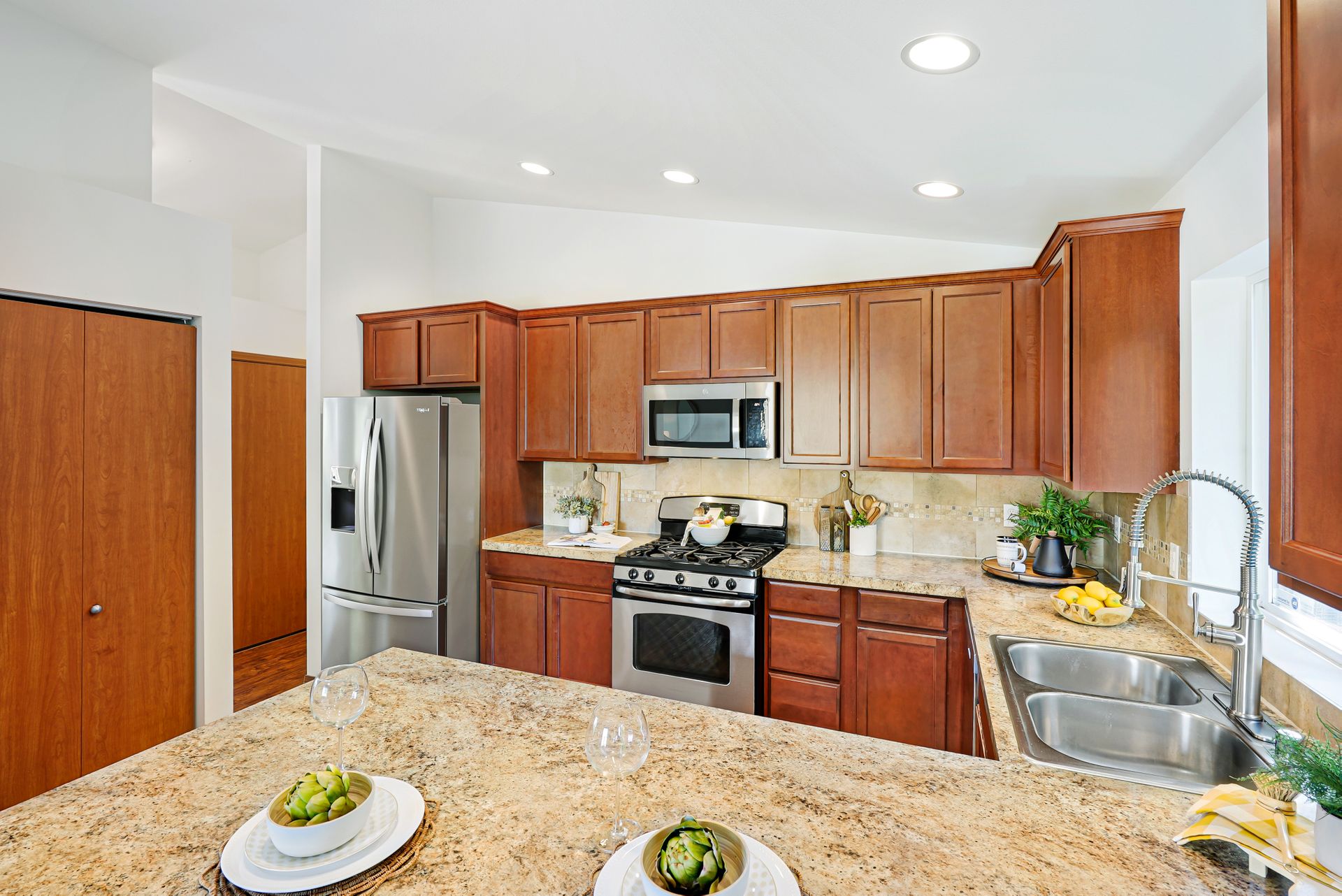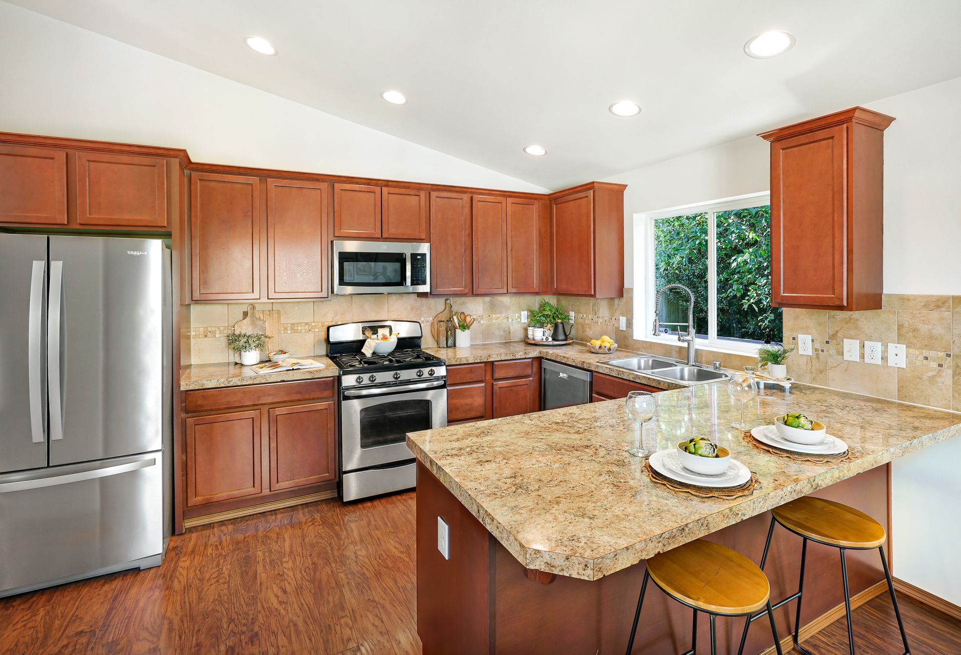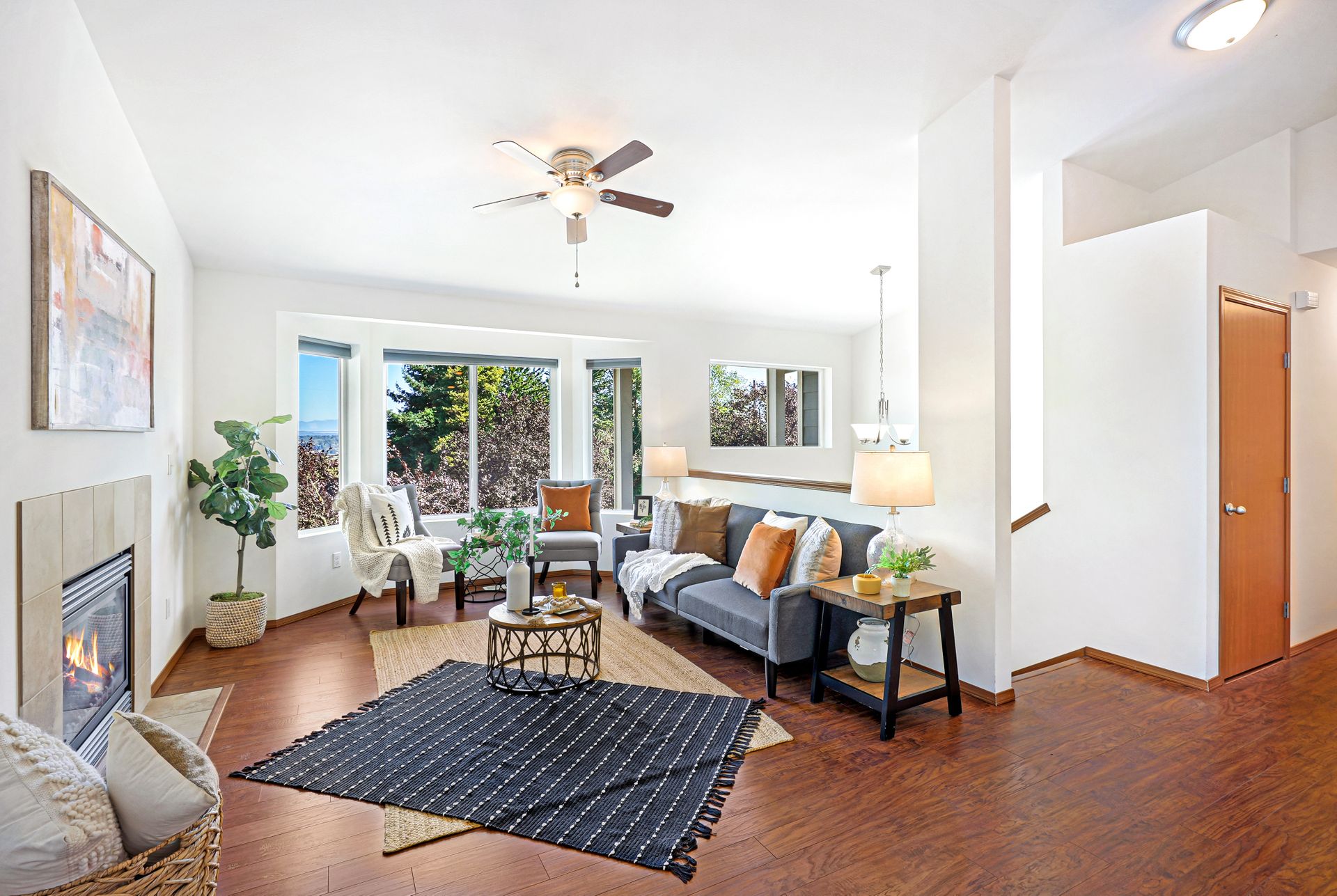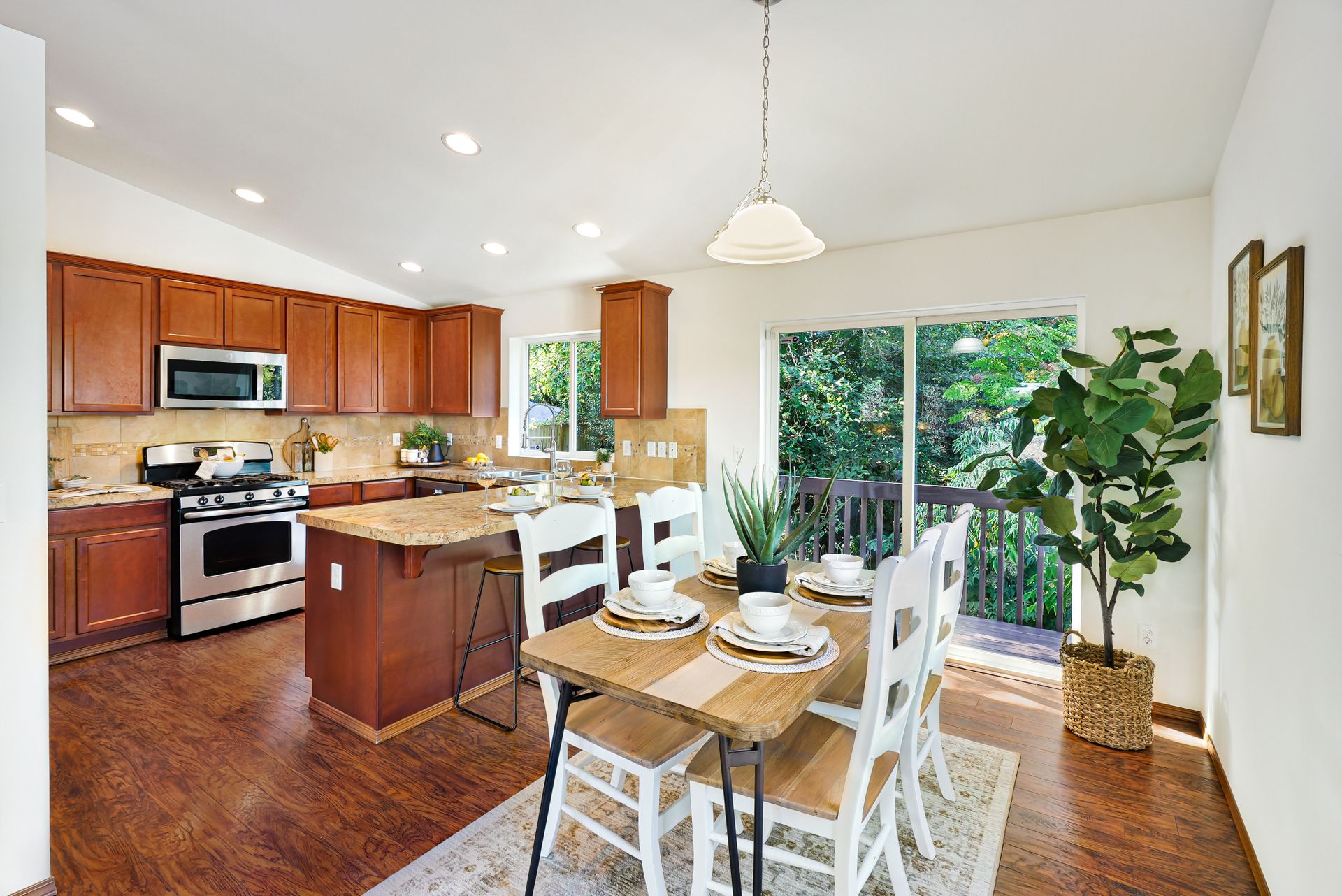 Let the quiet, private neighborhood and the fresh landscaping draw you into this gorgeous Everett home. Beautiful laminate floors and fresh interior paint will guide you throughout the main living spaces. The family room features a cozy fireplace, soaring cathedral ceilings, and large windows that fill the space with abundant natural light. The fully equipped remodeled kitchen has all the essentials: ample storage, stainless steel appliances, and a peninsula ideal for hosting and additional seating. Retreat to the bright, airy primary bedroom, with vaulted ceilings and a personal ensuite. There are four additional bedrooms, offering plenty of room for everyone! Look forward to spending time soaking in the serenity of your private backyard, which boasts a freshly painted deck and a lush lawn that seamlessly continues into the forest. This home is located near the Everett Golf & Country Club, Boeing, Paine Field, Forest Park, I-5, Downtown Everett, Historic Snohomish, and more.
