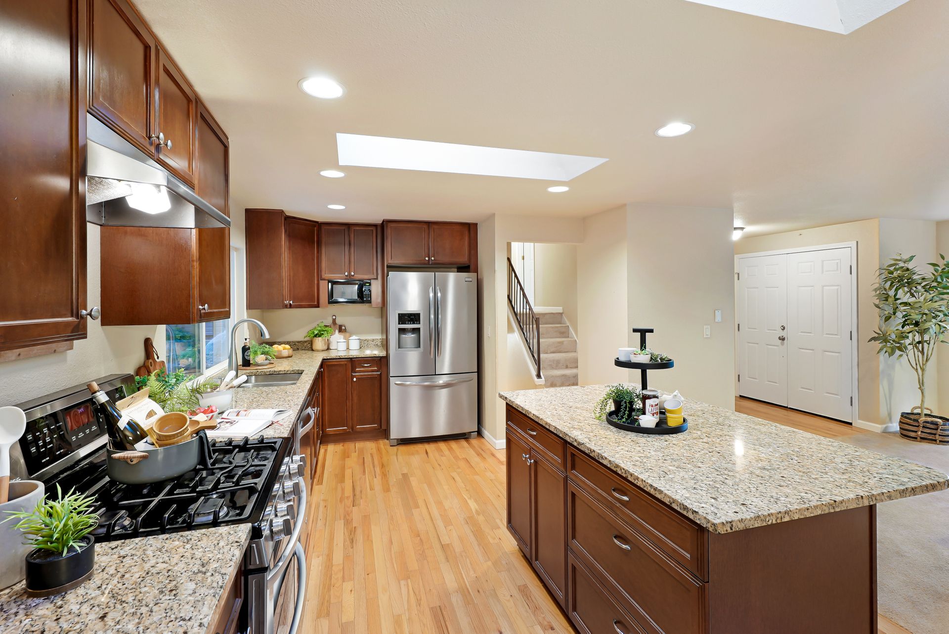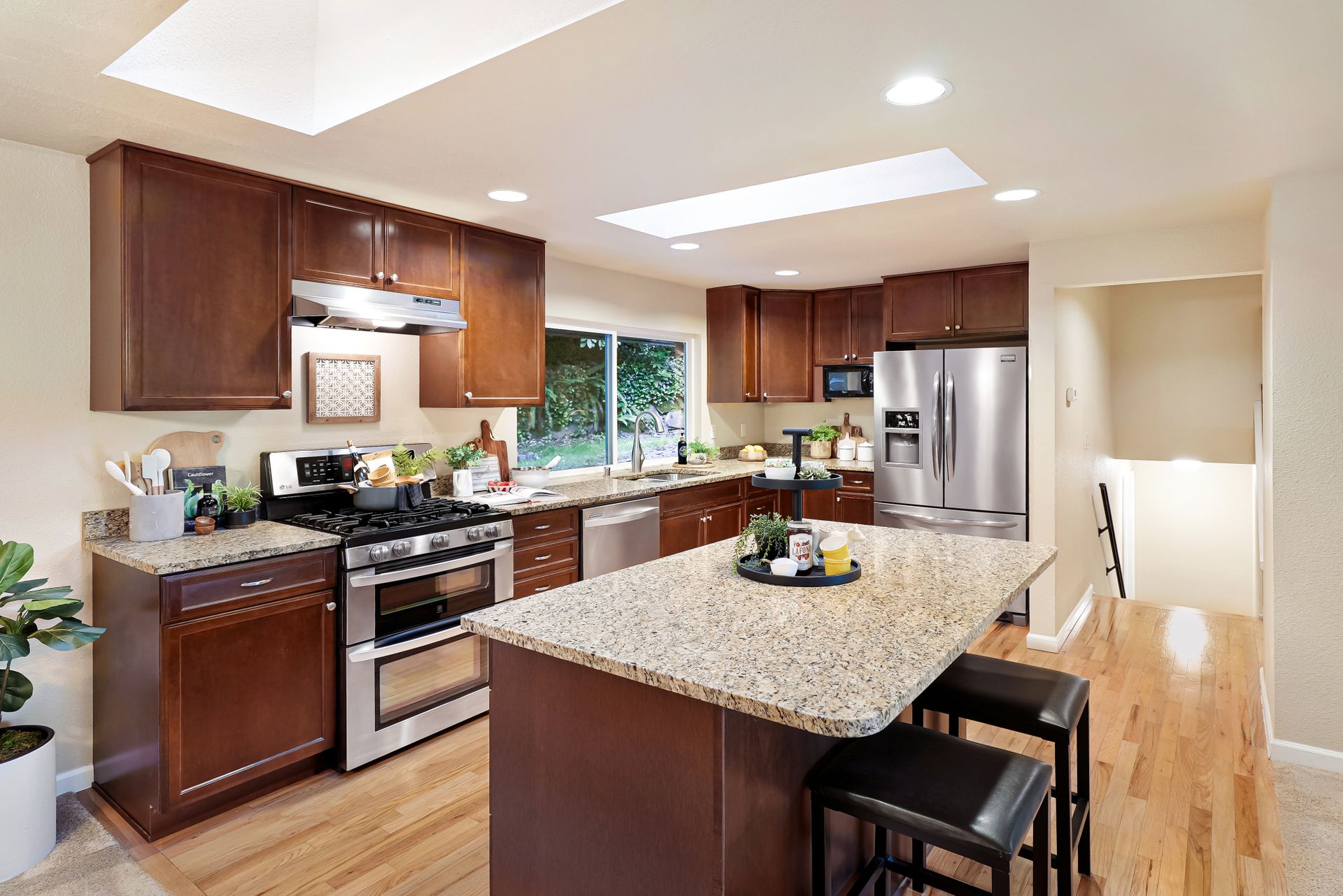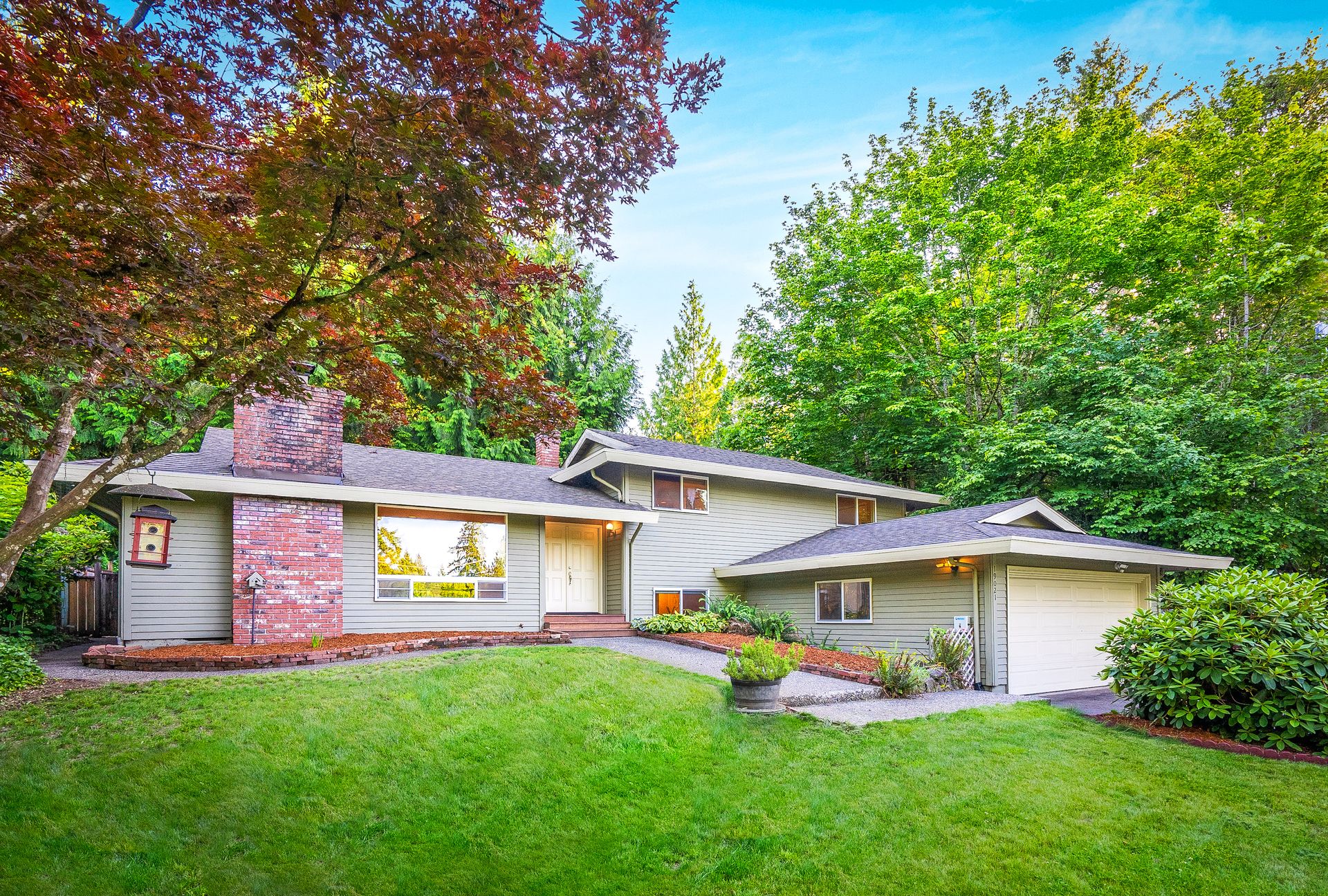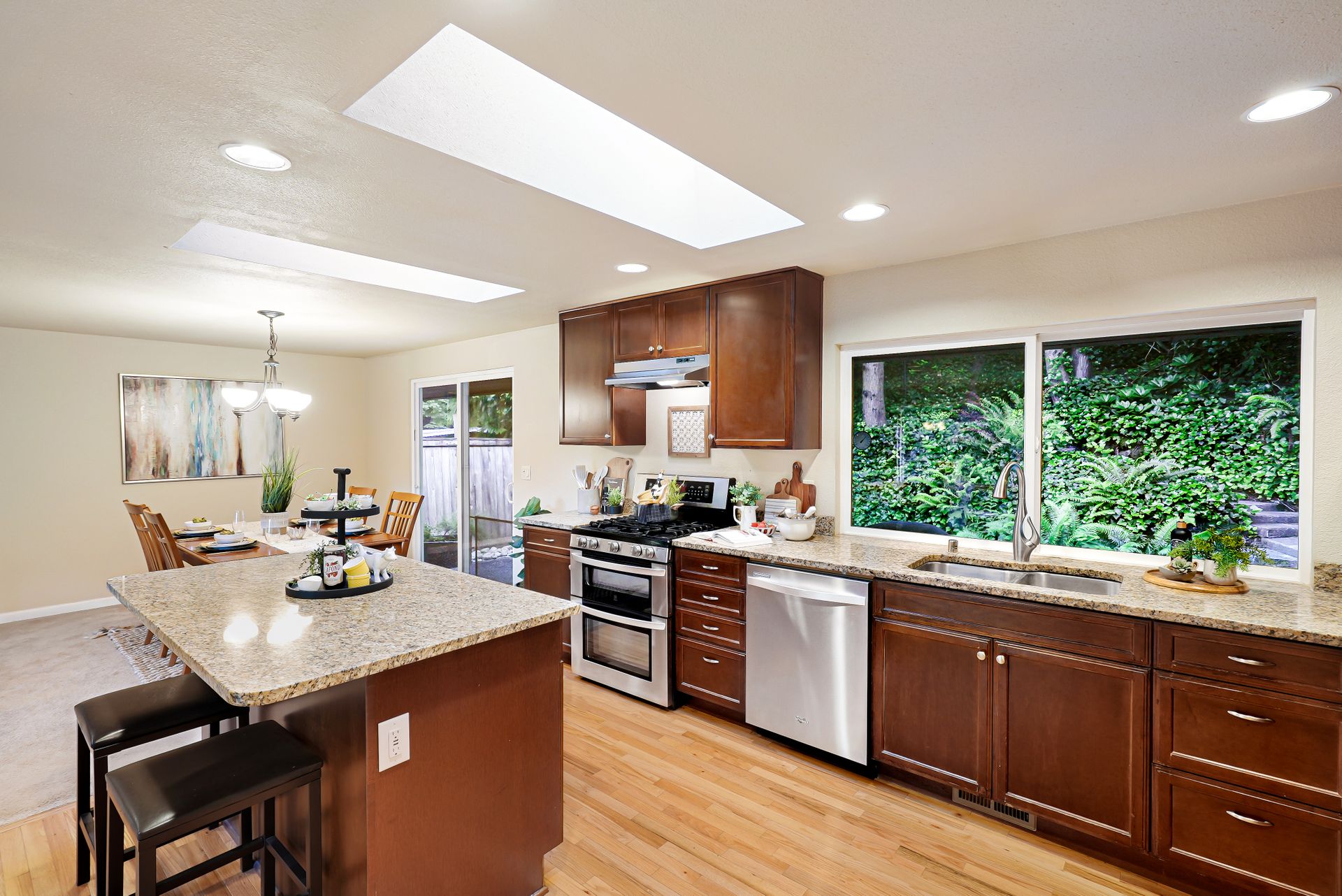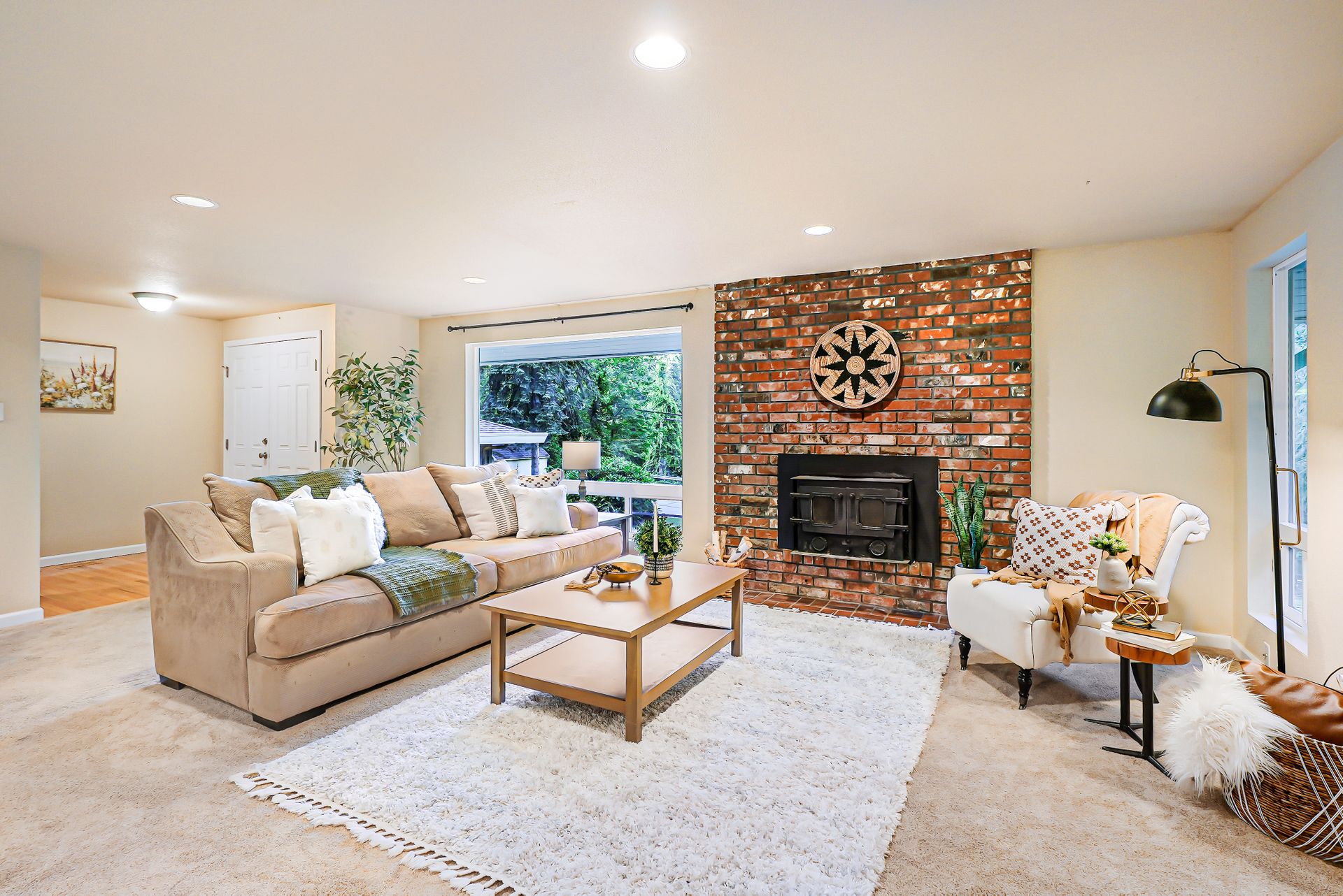 This Renton tri-level retreat boasts a modern style, abundant natural light, new carpet, and an outdoor living space designed for entertaining. The bright and airy family room is the perfect space to greet guests and sip your morning coffee by the brick fireplace. In the open-concept kitchen, there is a centerpiece island, granite countertops, and stainless steel appliances.