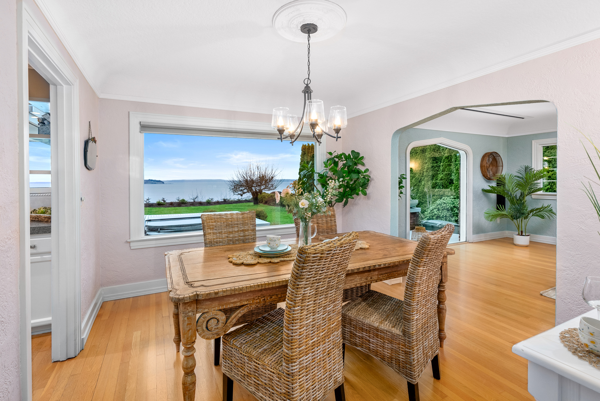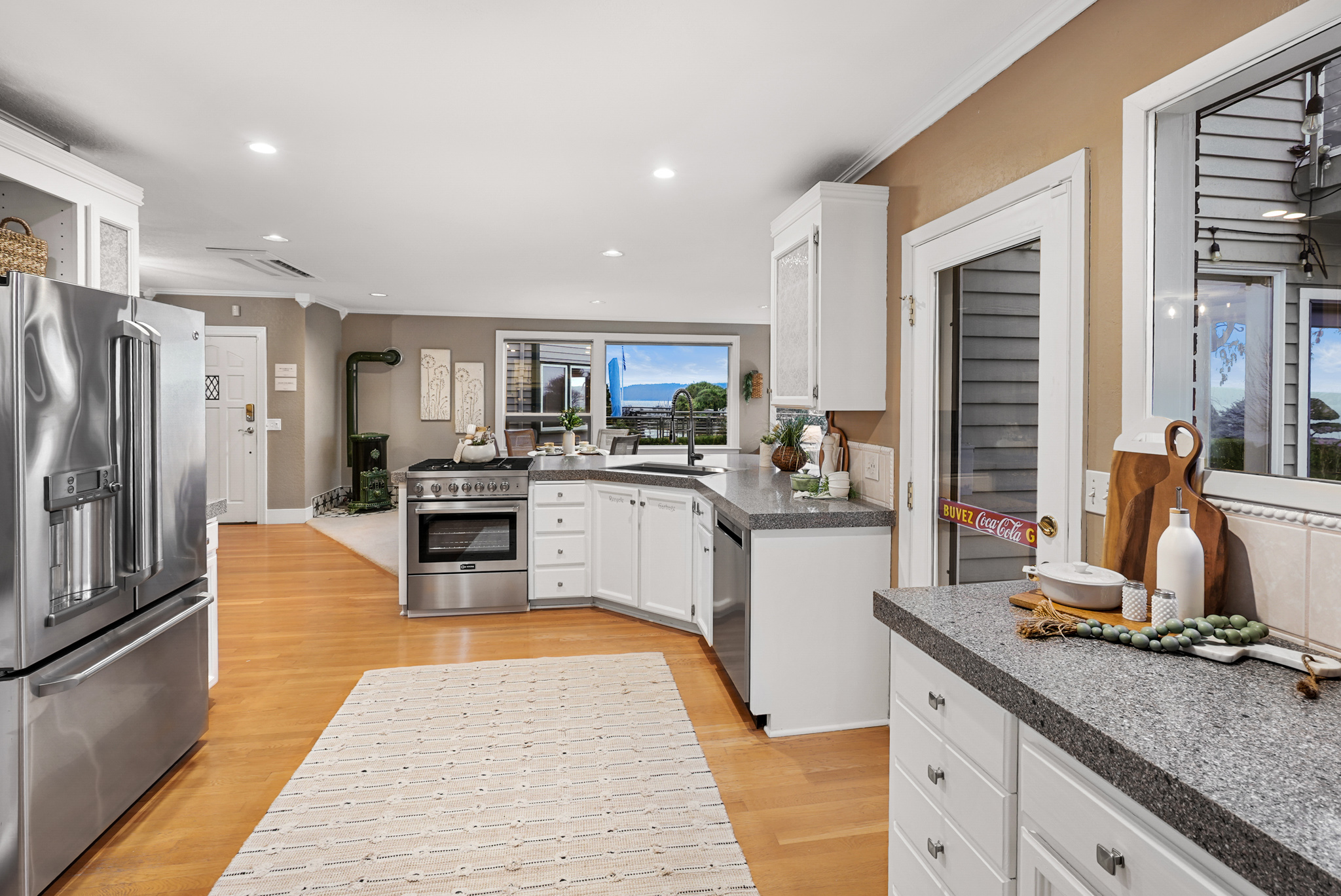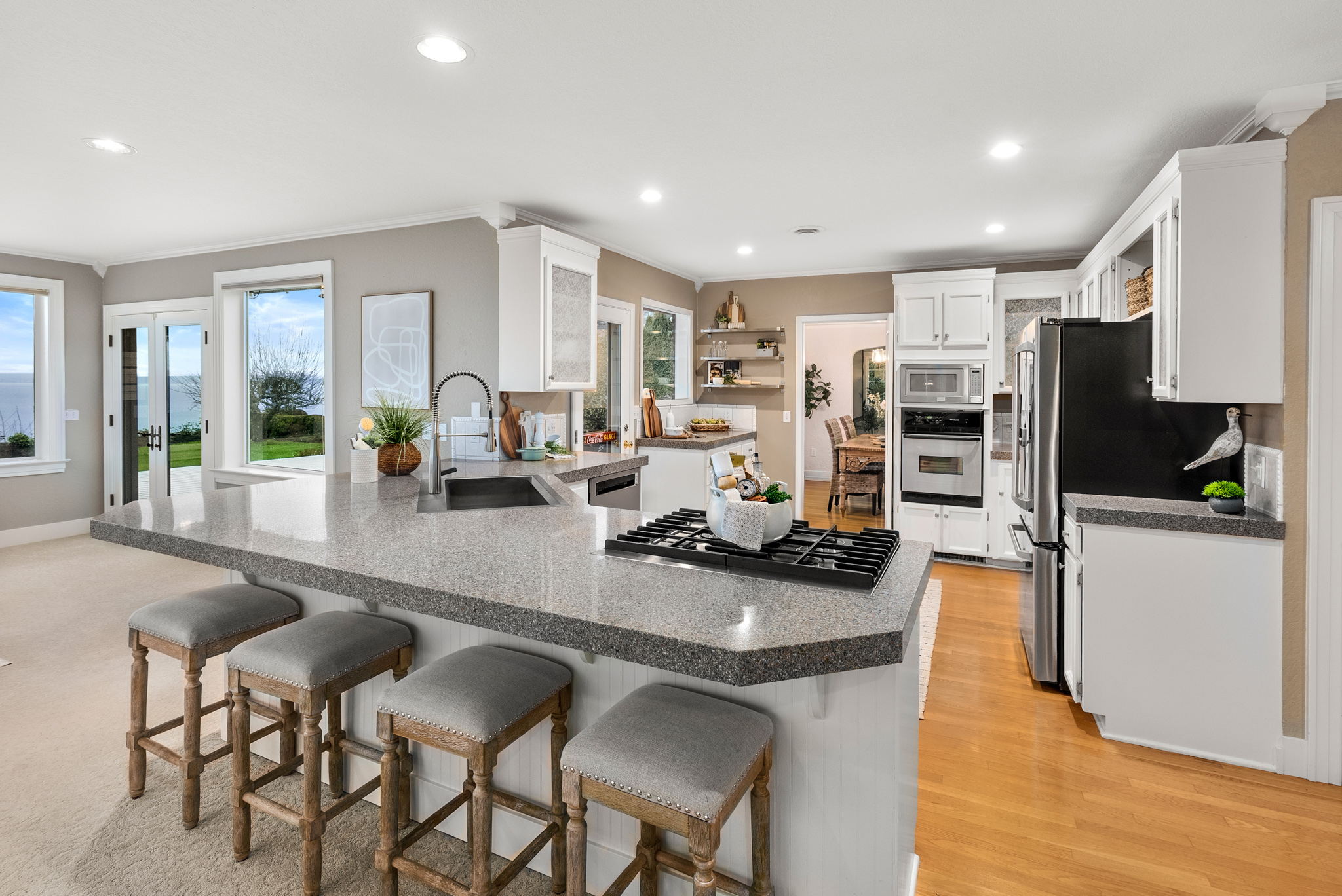 Imagine relaxing evenings spent in the front living room, with an oversized picture window that frames whale sightings and golden sunsets like a living artwork. When not taking in the views, you can enjoy movie night or exciting game days with the 120” drop-down screen and surround sound speaker system. The sunlit kitchen is a chef’s dream, offering generous prep space and storage throughout. Slow mornings over coffee or cozy weeknight meals will find their home at the casual peninual seating. Adjoining the kitchen is a second living area, wrapped in windows that showcase ferry crossings and island views. Enjoy the best of the PNW right in your own backyard, featuring an expansive back deck, where a gas firepit and bubbling hot tub promise year-round enjoyment and unforgettable evenings under the stars.