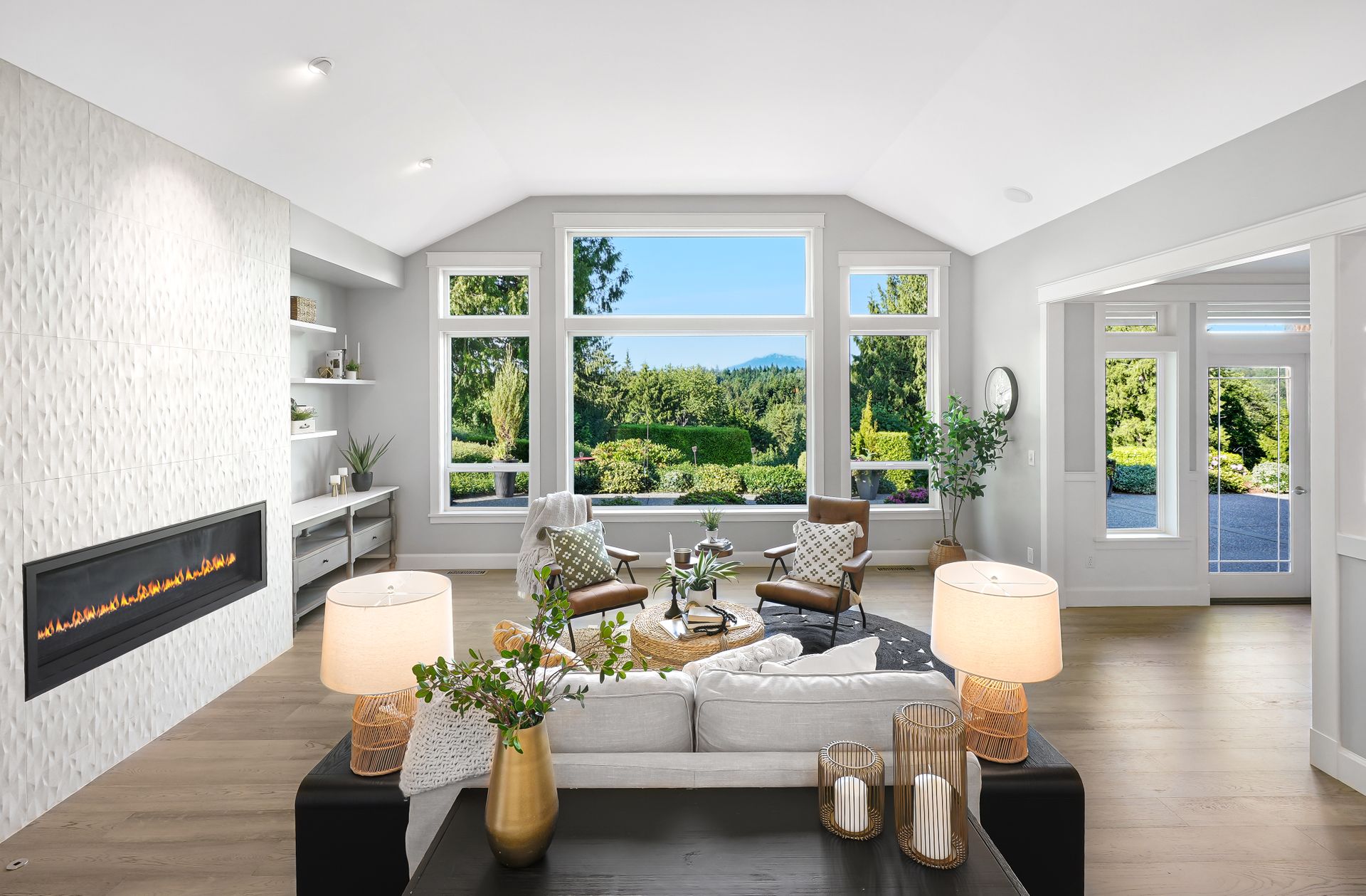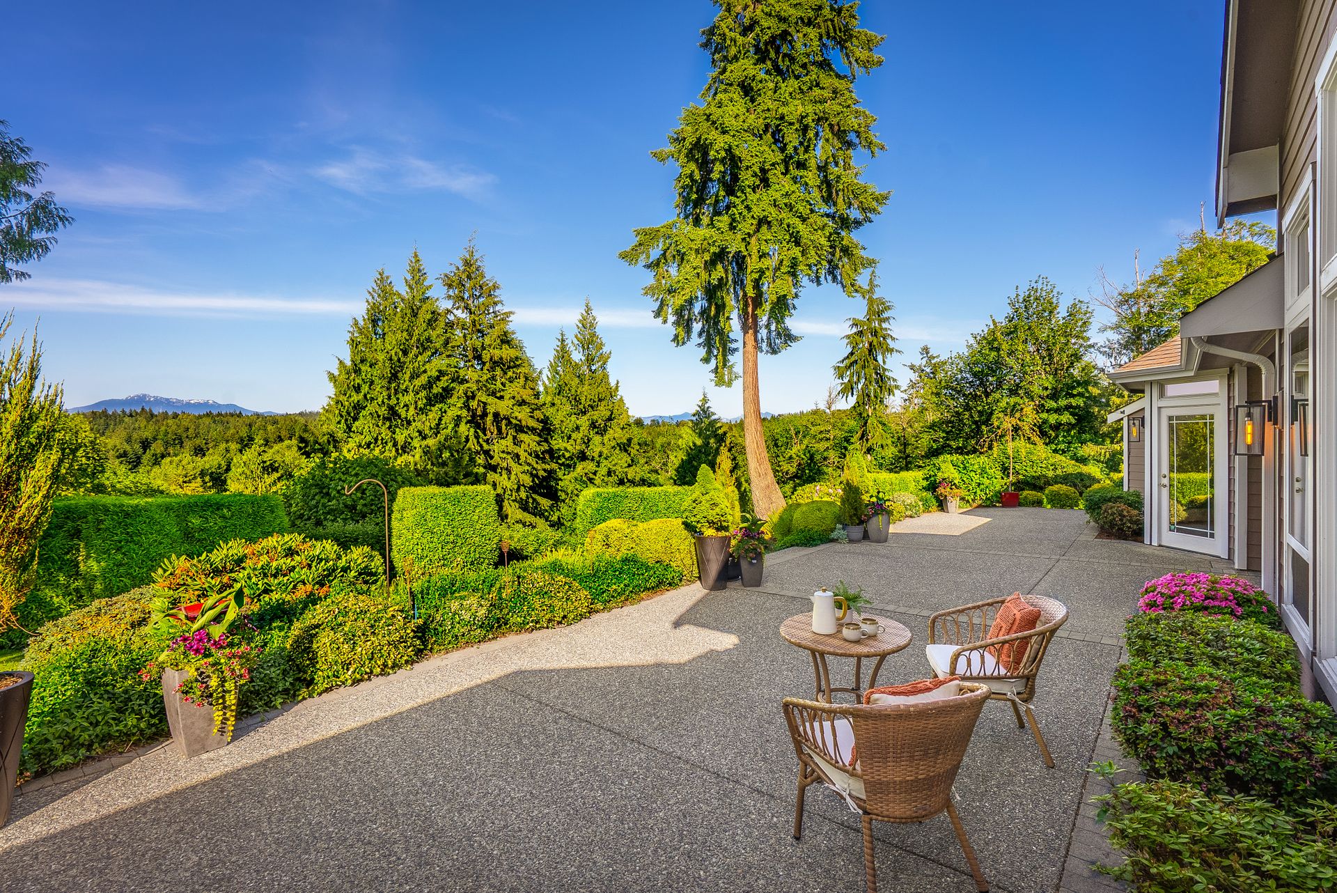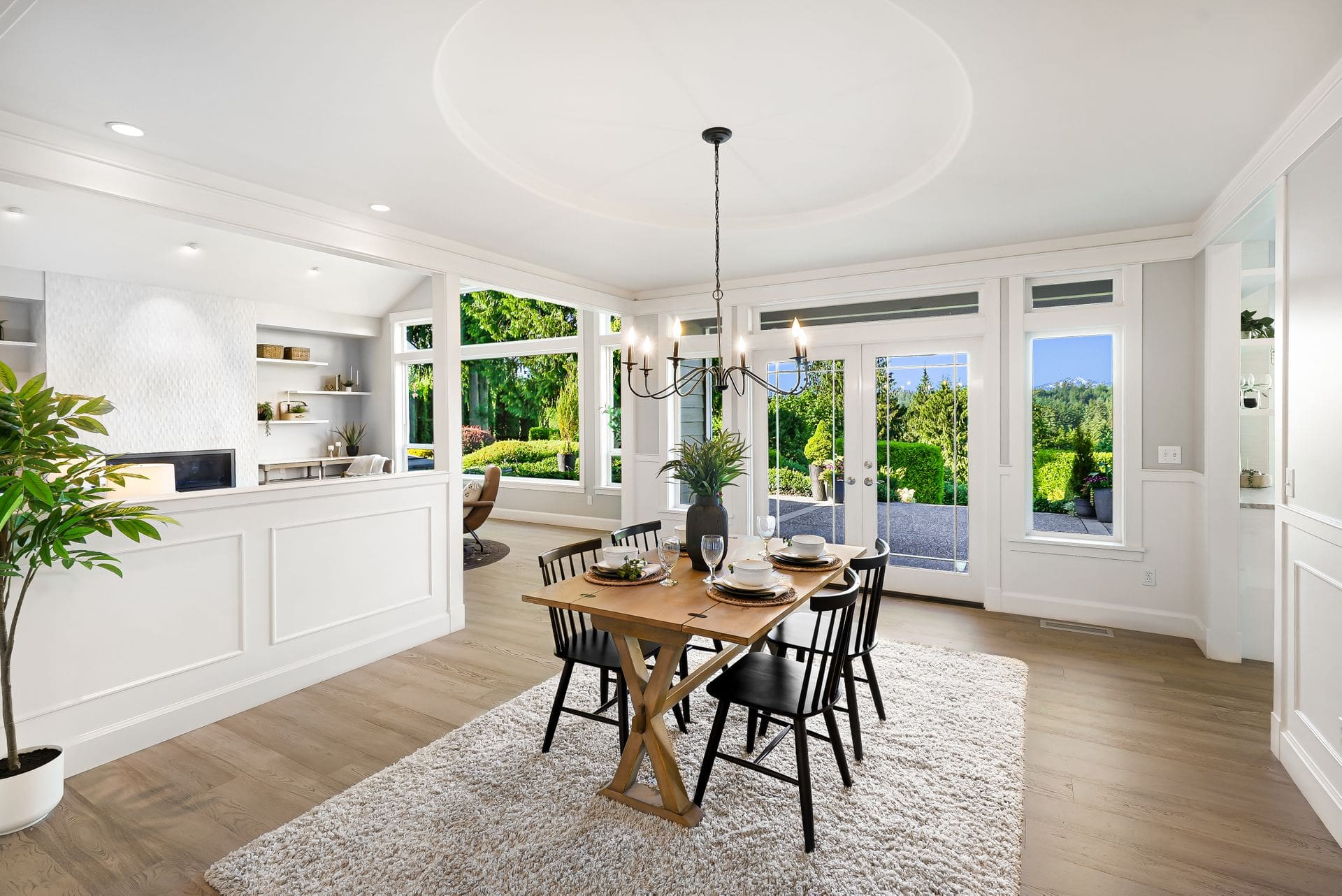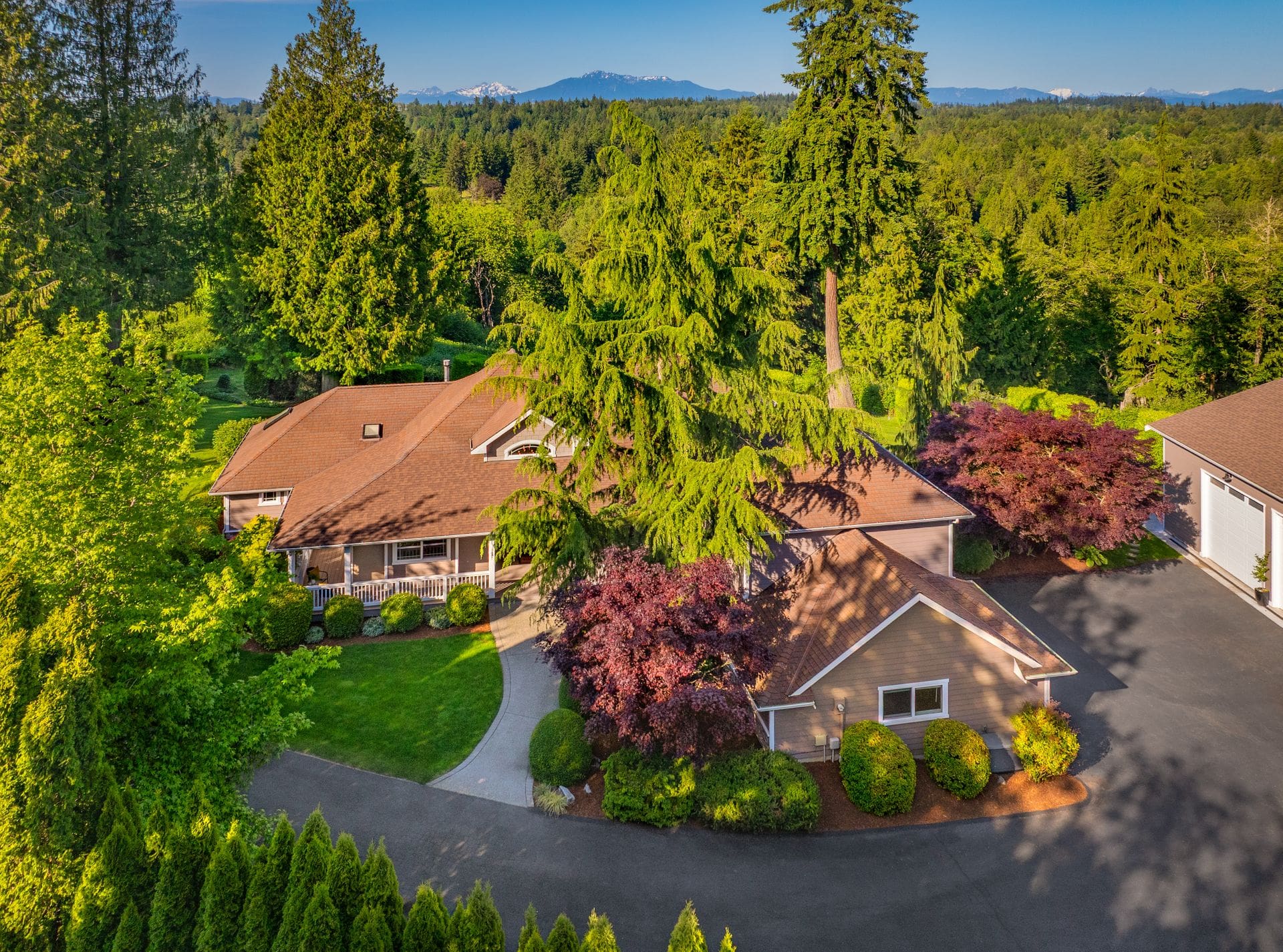 Welcome to your private Snohomish sanctuary, where traditional charm meets modern luxury. This exquisitely updated home is nestled on a meticulously landscaped property filled with vibrant native plants and lush greenery, creating a serene, park-like setting. A picturesque wraparound porch sets the tone for the tranquility that awaits inside. Step through the front door to find a wall of windows flooding the great room with natural light and breathtaking mountain views. The elegant living space is anchored by a stylish fireplace, perfect for cozy evenings and holiday gatherings.